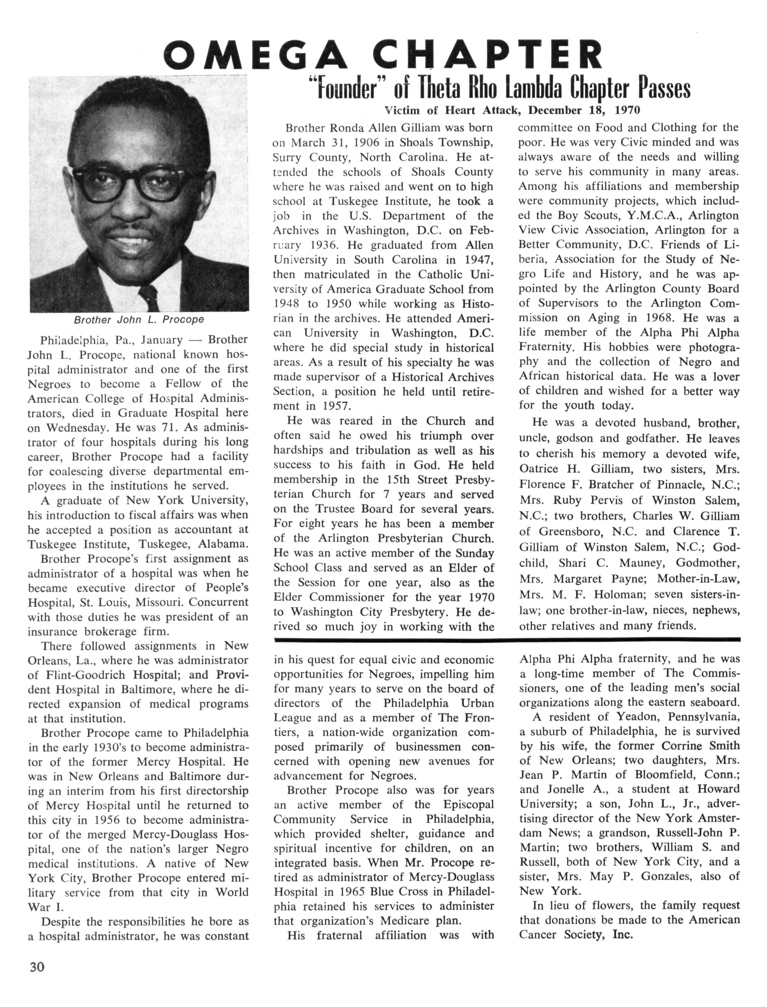 Philadelphia, Pa., January —• Brother John L Procope, national known hospital administrator and one of the first Negroes to become a Fellow of the American College of Hospital Administrators, died in Graduate Hospital here on Wednesday. He was 71. As administrator of four hospitals during his long career, Brother Procope had a facility for coalescing diverse departmental employees in the institutions he served.