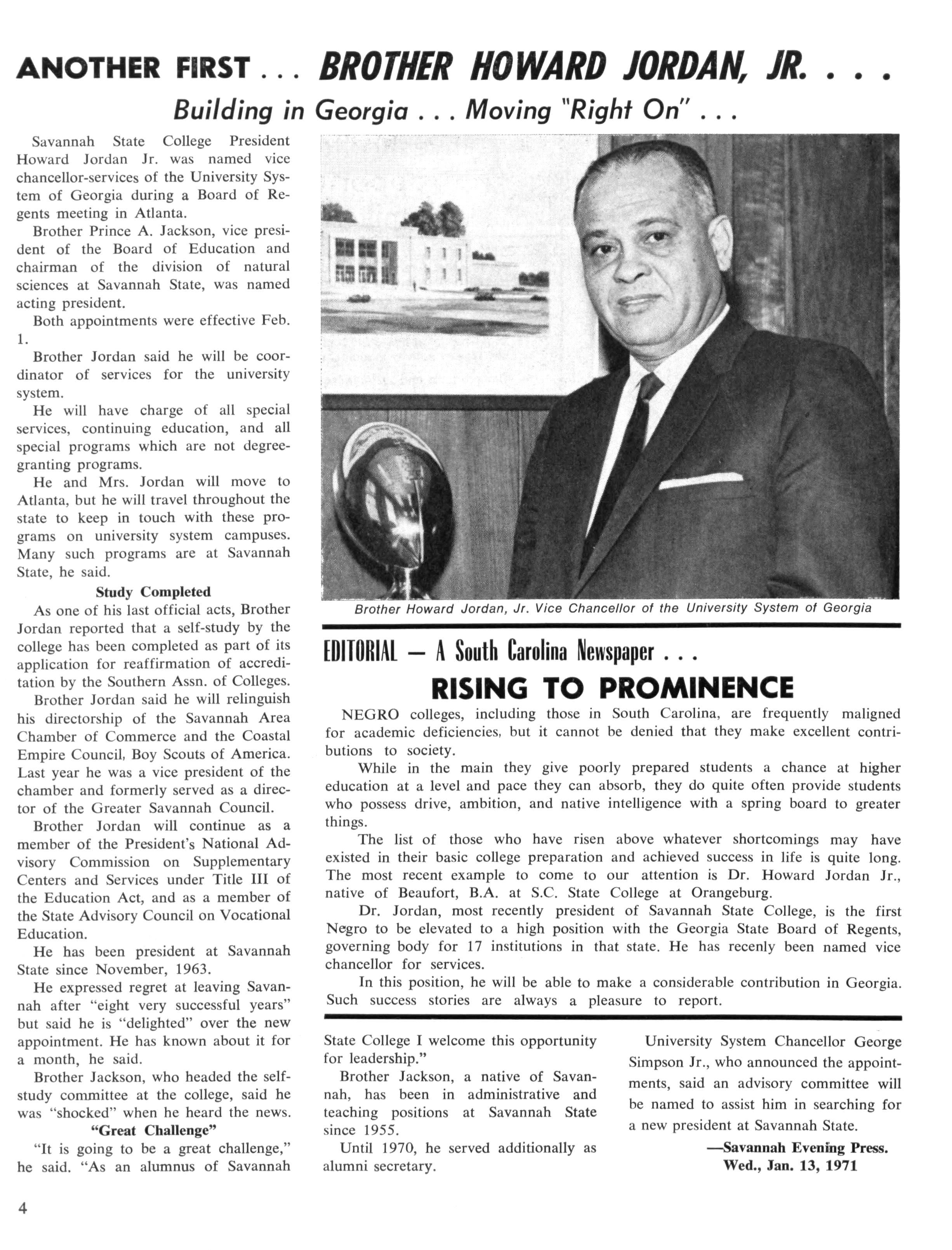 Former president of Savannah State College, Savannah, Georgia. The first Black appointed to a Vice Chancellorship in an American University System. "Tell them we are rising!", was the message that was conveyed to the northern states by President Richard Wright, the first president of Savannah State College The college was formerly known as GEORGIA STATE COLLEGE.