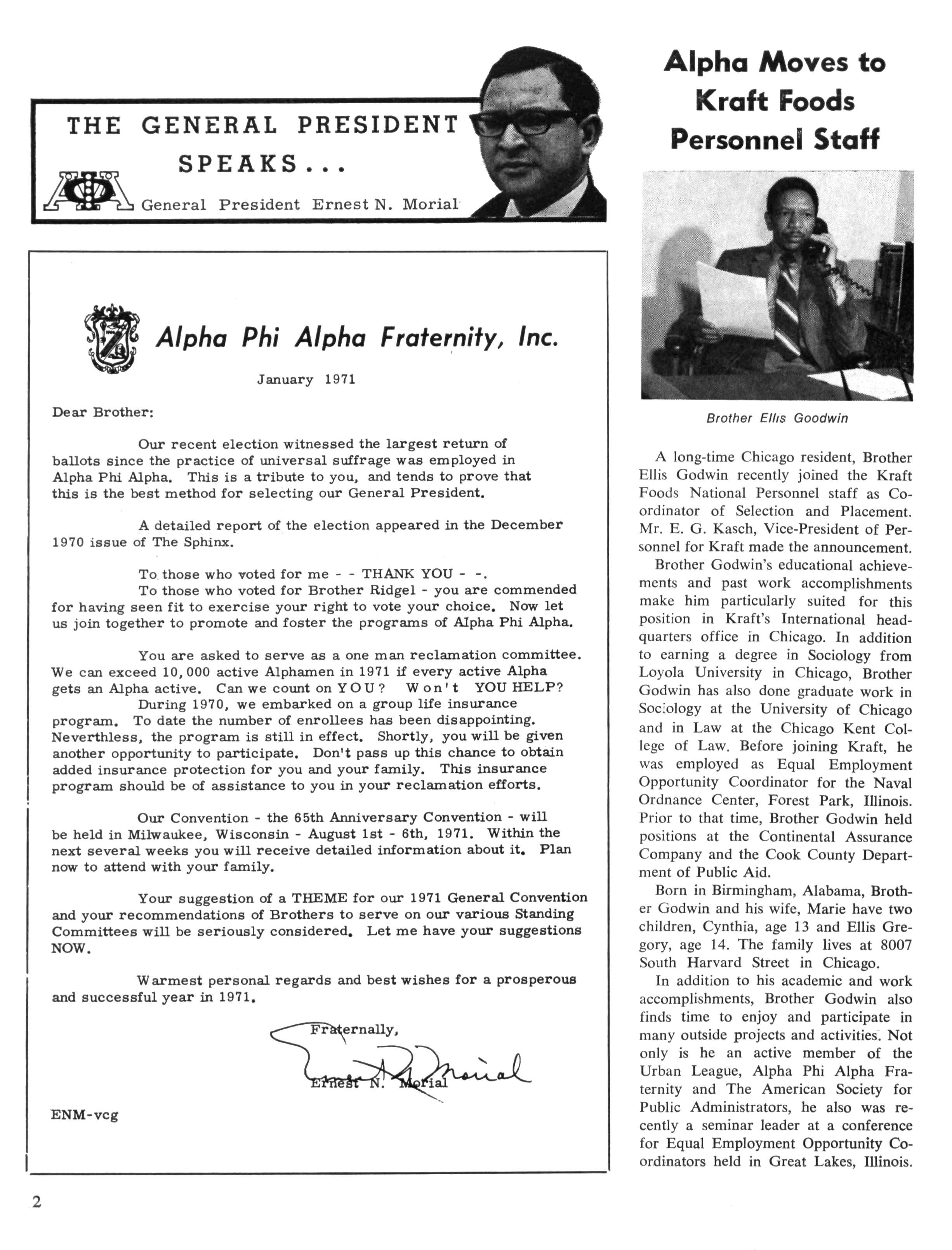 A long-time Chicago resident, Brother Ellis Godwin recently joined the Kraft Foods National Personnel staff as Coordinator of Selection and Placement Mr E G Kasch, Vice-President of Personnel for Kraft made the announcement. Brother Godwin's educational achievements and past work accomplishments make him particularly suited for this position in Kraft's International headquarters office in Chicago. In addition to earning a degree in Sociology from Loyola University in Chicago, Brother Godwin has also done graduate work in Sociology at the University of Chicago and in Law at the Chicago Kent College of Law Before joining Kraft, he was employed as Equal Employment Opportunity Coordinator for the Naval Ordnance Center, Forest Park, Illinois Prior to that time, Brother Godwin held positions at the Continental Assurance Company and the Cook County Department of Public Aid