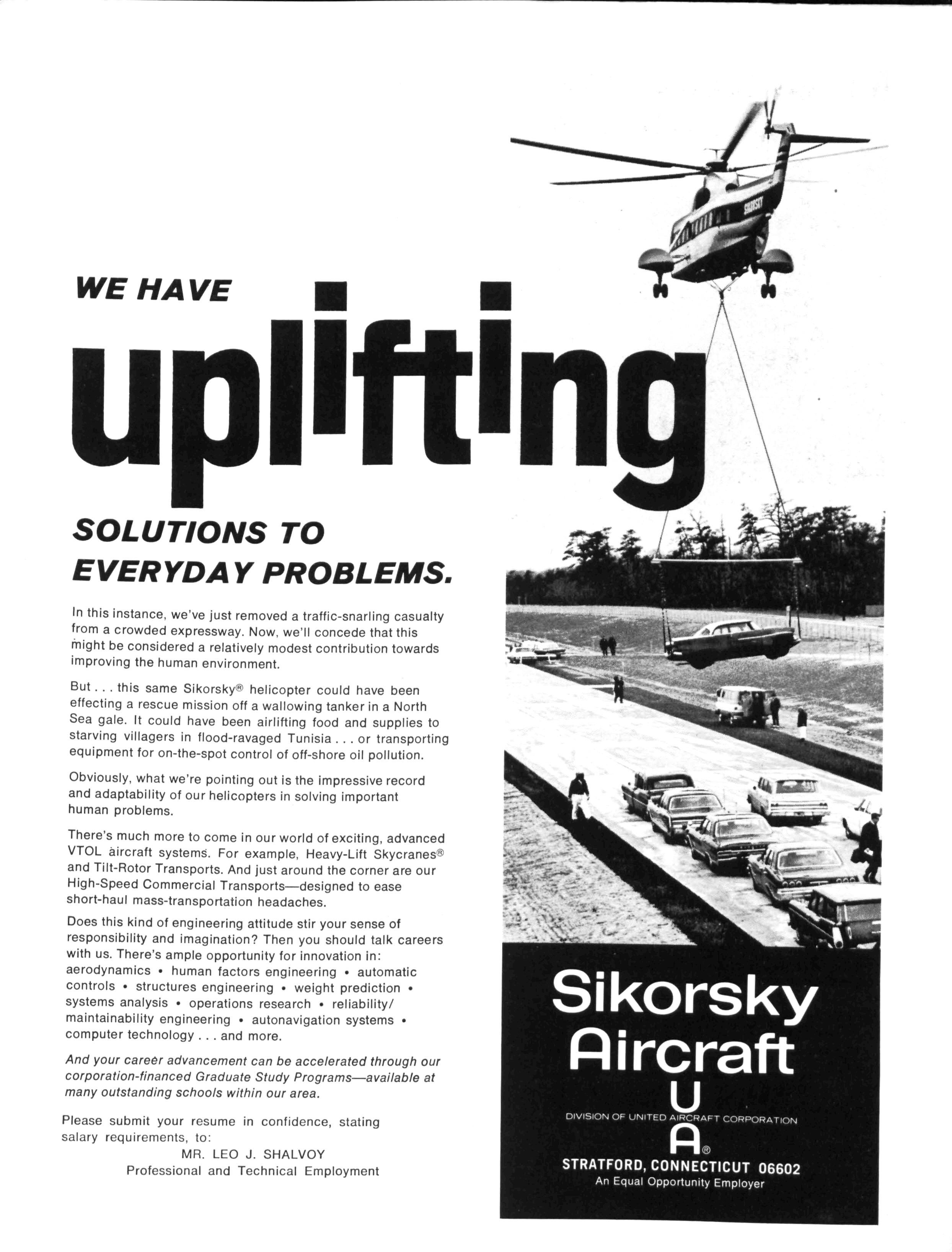 But this same Sikorsky® helicopter could have been effecting a rescue mission off a wallowing tanker in a North Sea gale It could have been airlifting food and supplies to starving villagers in flood-ravaged Tunisia or transporting equipment for on-the-spot control of off-shore oil pollution