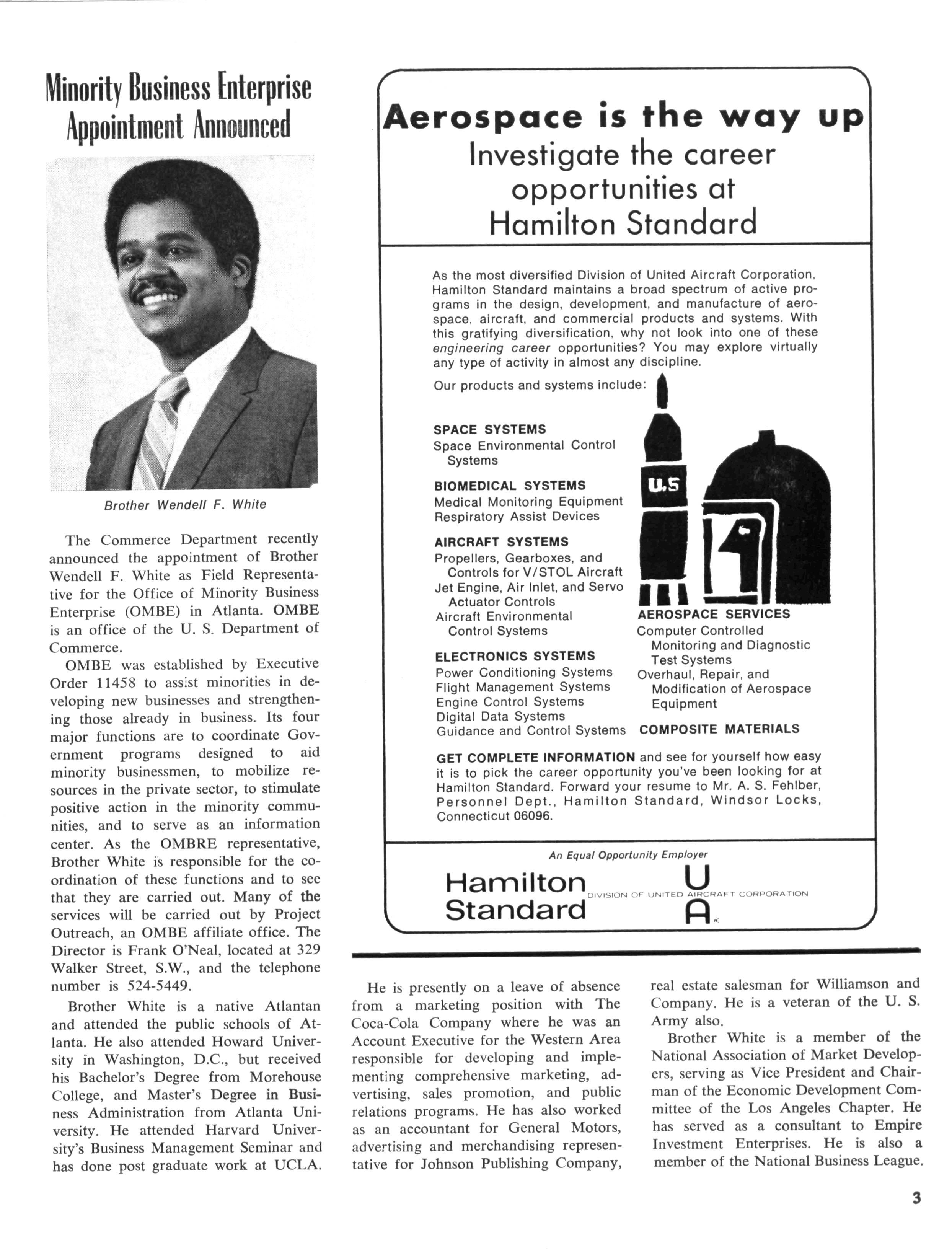 The Commerce Department recently announced the appointment of Brother Wendell F White as Field Representative for the Office of Minority Business Enterprise (OMBE) in Atlanta OMBE is an office of the U. S. Department of Commerce.