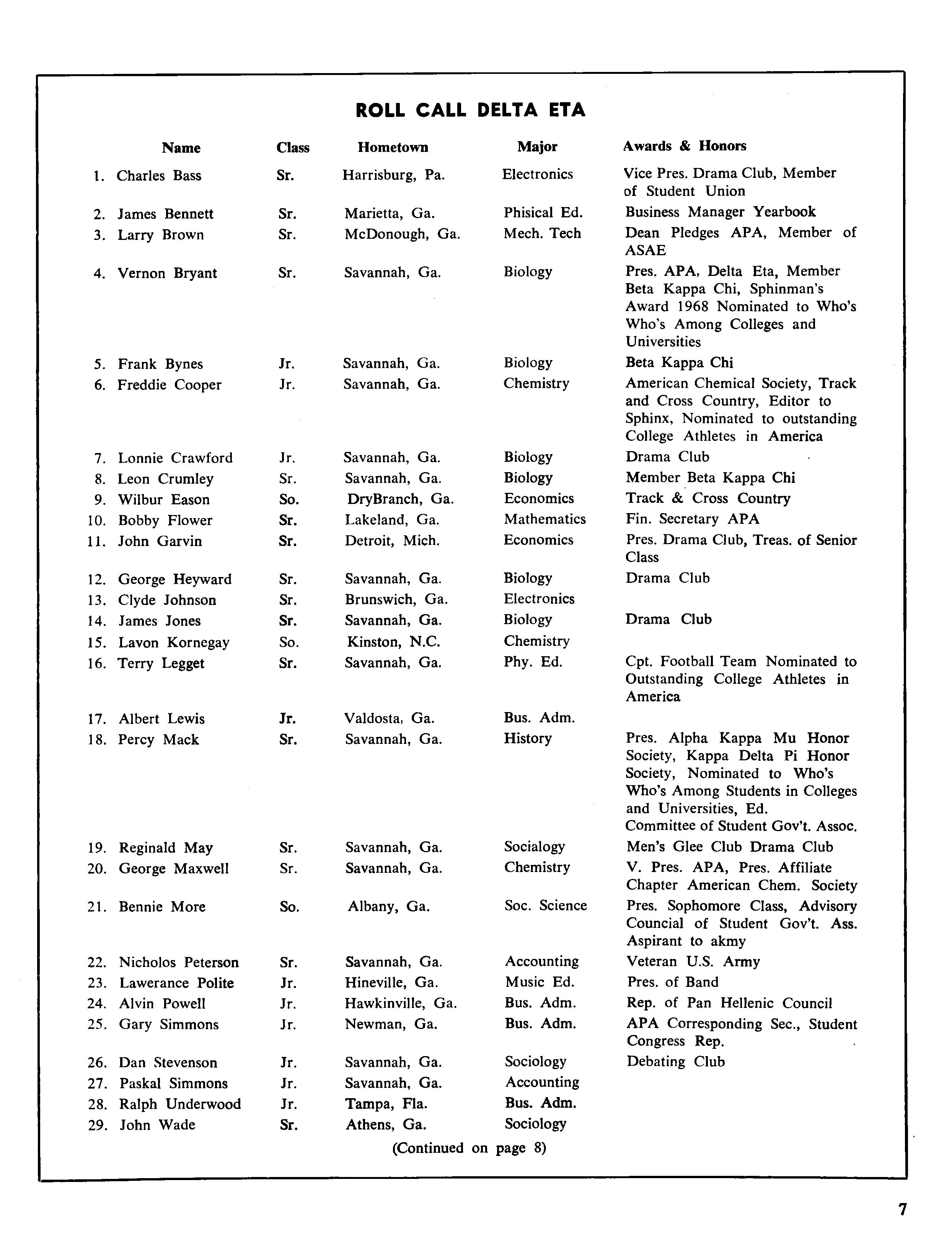 Seventh is Mr John White who hails from Natchez, Miss Mr White is a sophomore honor student majoring in pre-medicine. After graduating from Jackson State College, Mr White plans to attend medical school