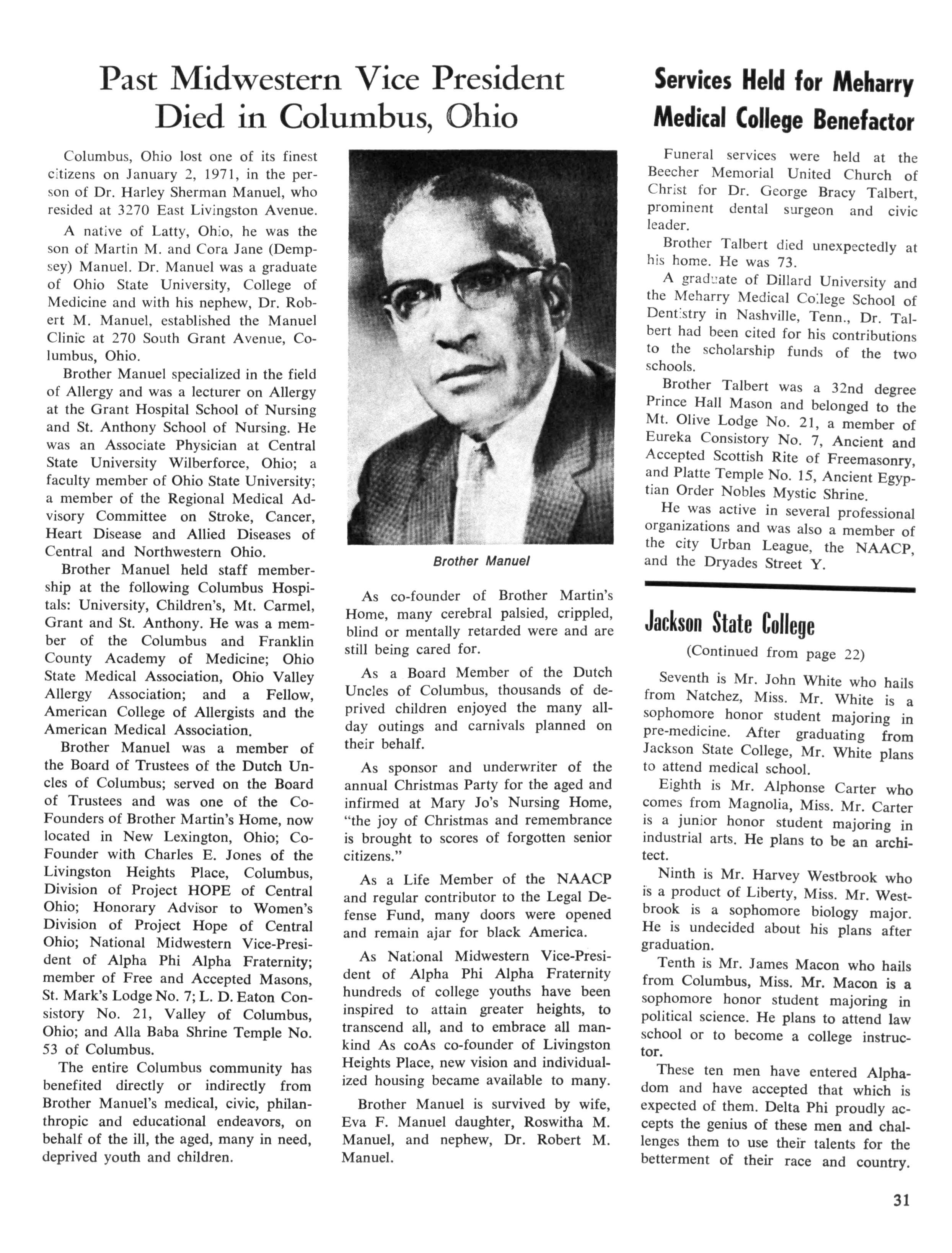 Columbus, Ohio lost one of its finest citizens on January 2, 1971, in the person of Dr Harley Sherman Manuel, who resided at 3270 East Livingston Avenue.