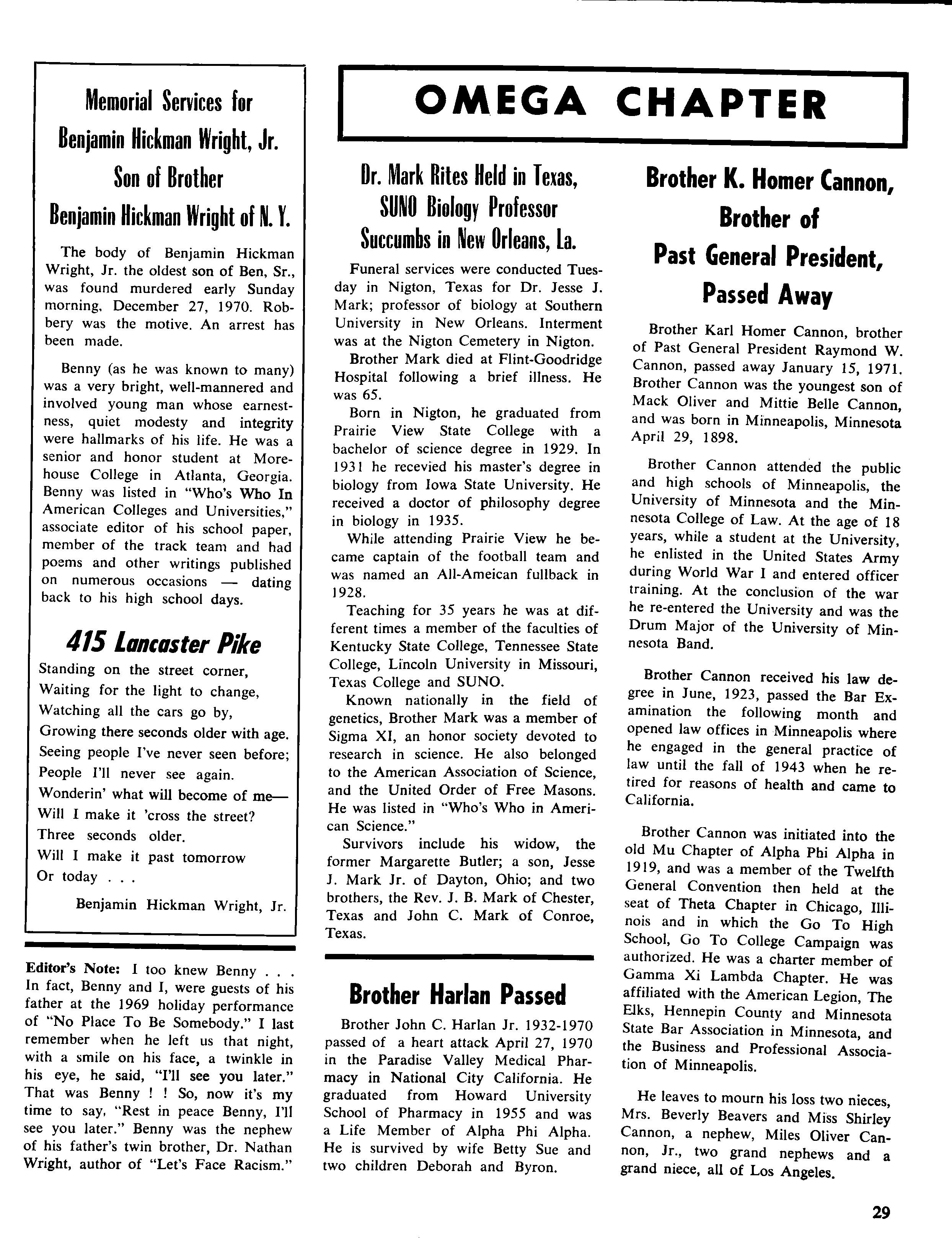 Brother John C Harlan Jr 1932-1970 passed of a heart attack April 27, 1970 in the Paradise Valley Medical Pharmacy in National City California. He graduated from Howard University School of Pharmacy in 1955 and was a Life Member of Alpha Phi Alpha He is survived by wife Betty Sue and two children Deborah and Byron
