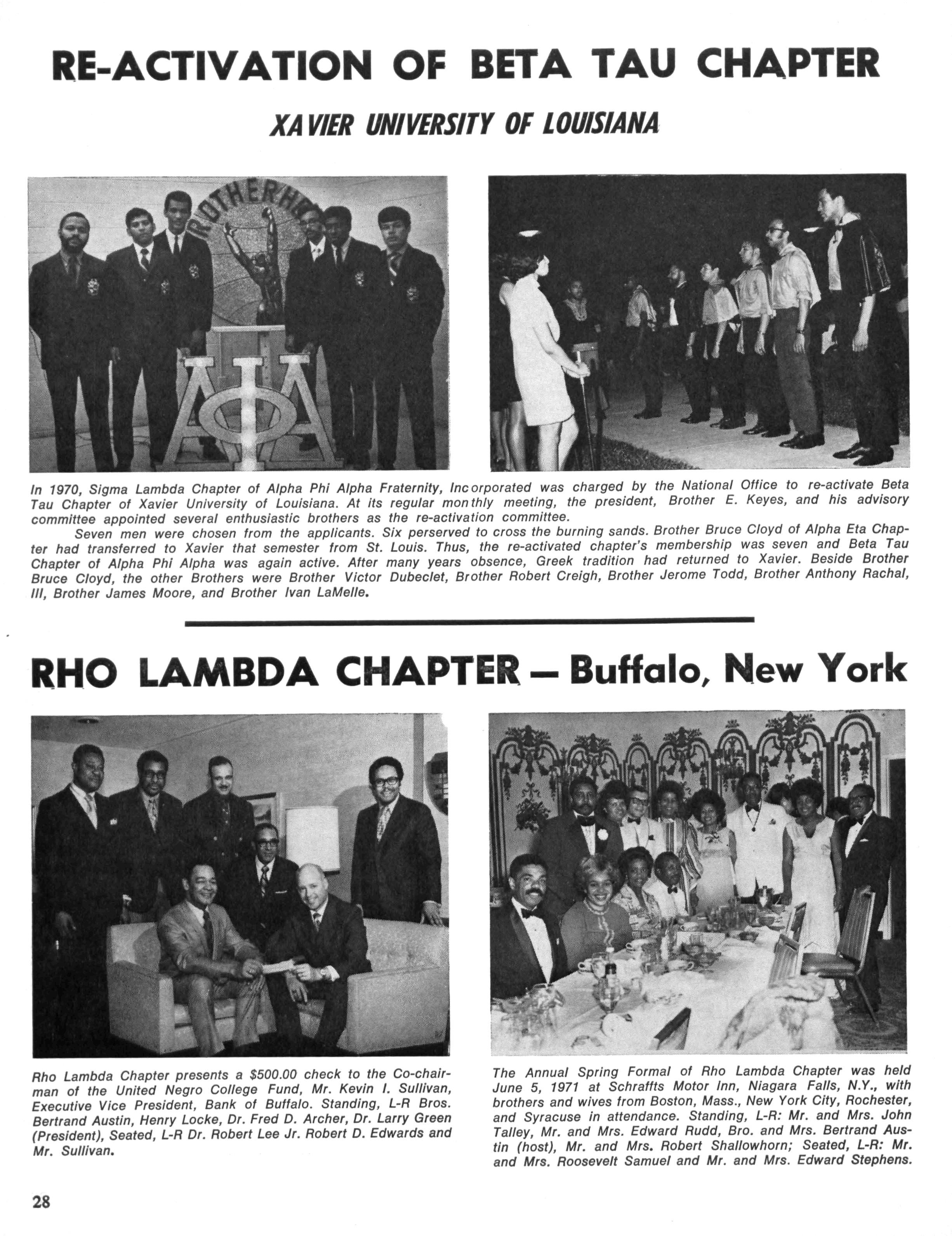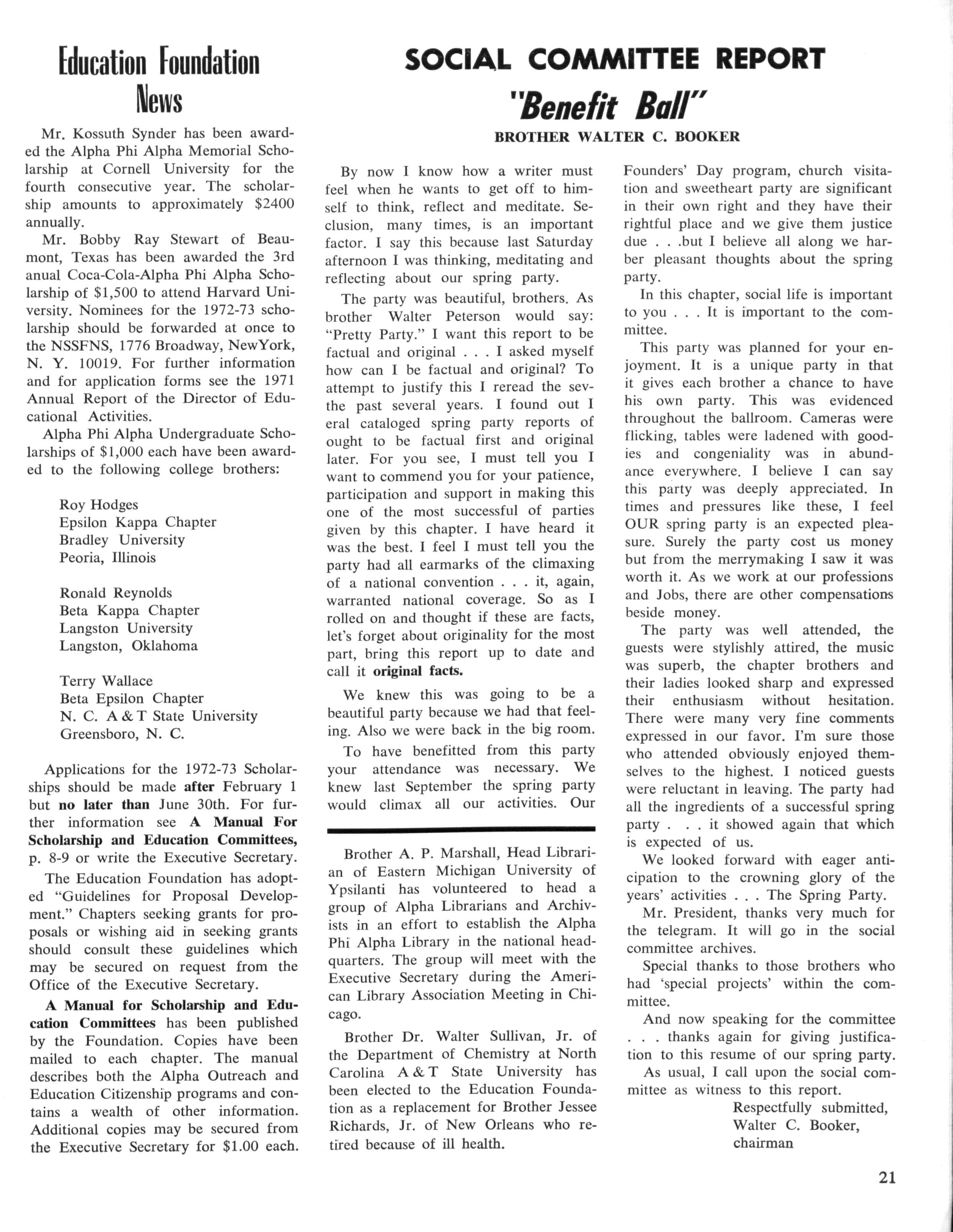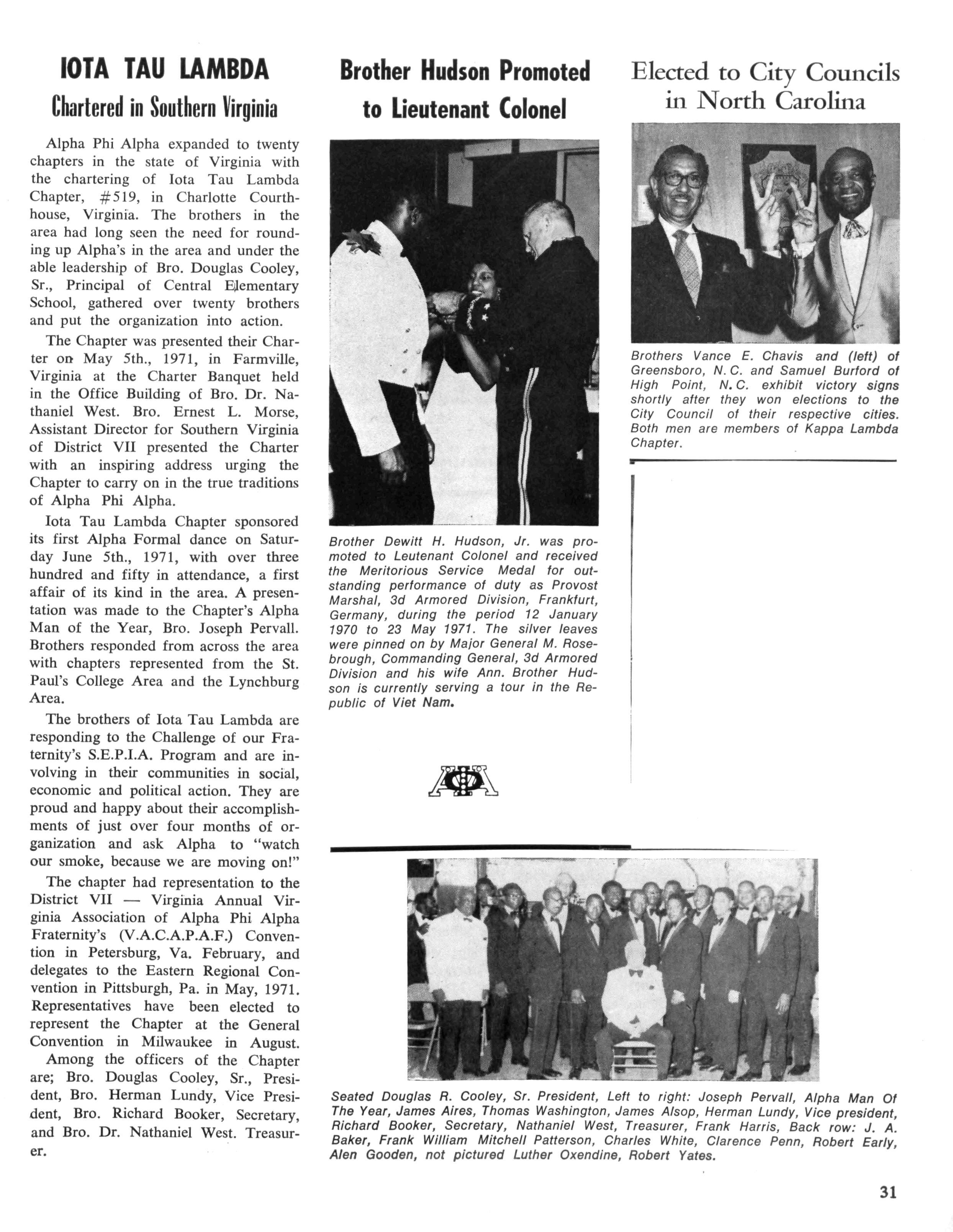 The chapter had representation to the District VII — Virginia Annual Virginia Association of Alpha Phi Alpha Fraternity's (V.A.C.A.P.A.F.) Convention in Petersburg, Va February, and delegates to the Eastern Regional Convention in Pittsburgh, Pa. in May, 1971. Representatives have been elected to represent the Chapter at the General Convention in Milwaukee in August. Among the officers of the Chapter are; Bro Douglas Cooley, Sr., President, Bro Herman Lundy, Vice President, Bro. Richard Booker, Secretary, and Bro Dr Nathaniel West Treasurer