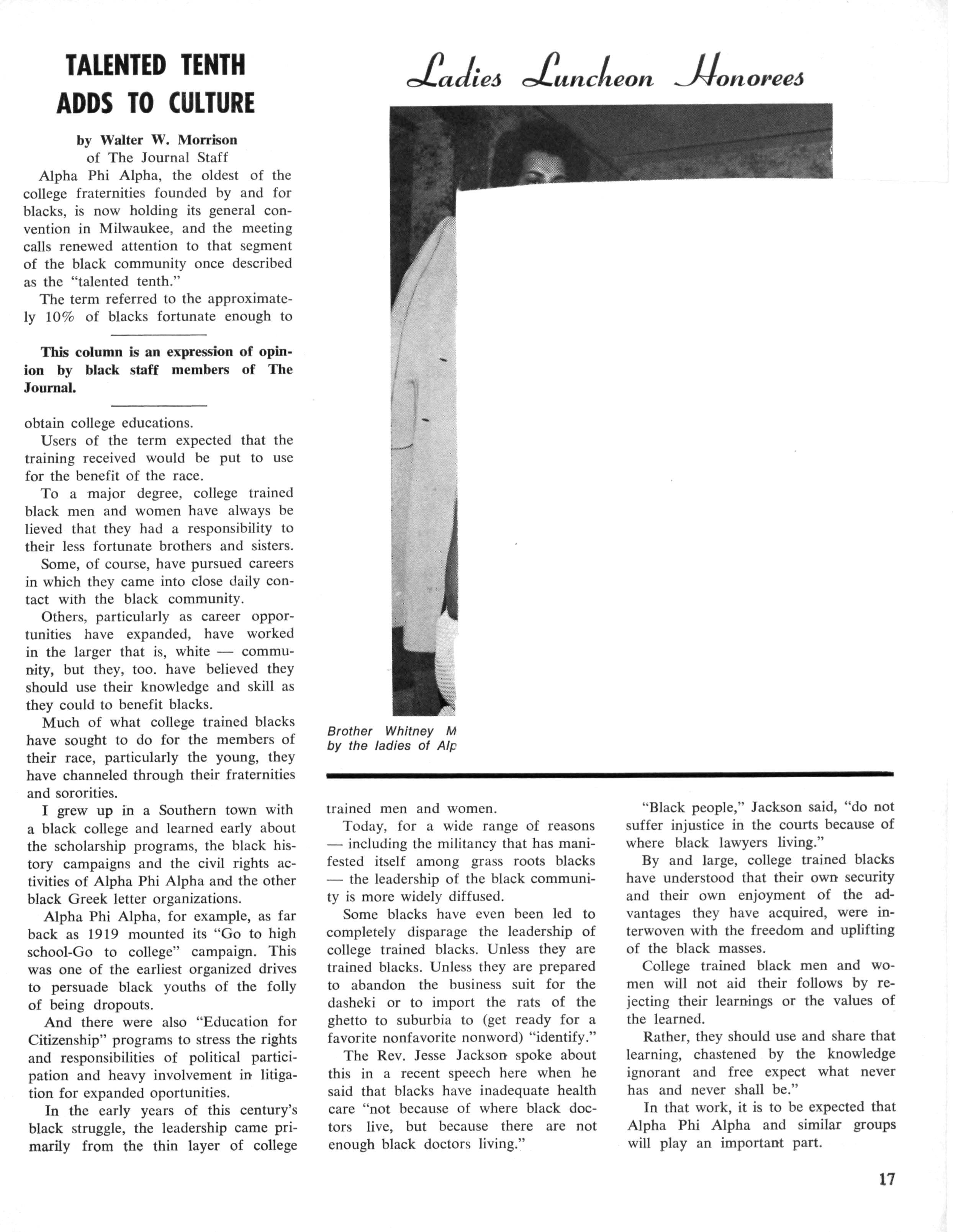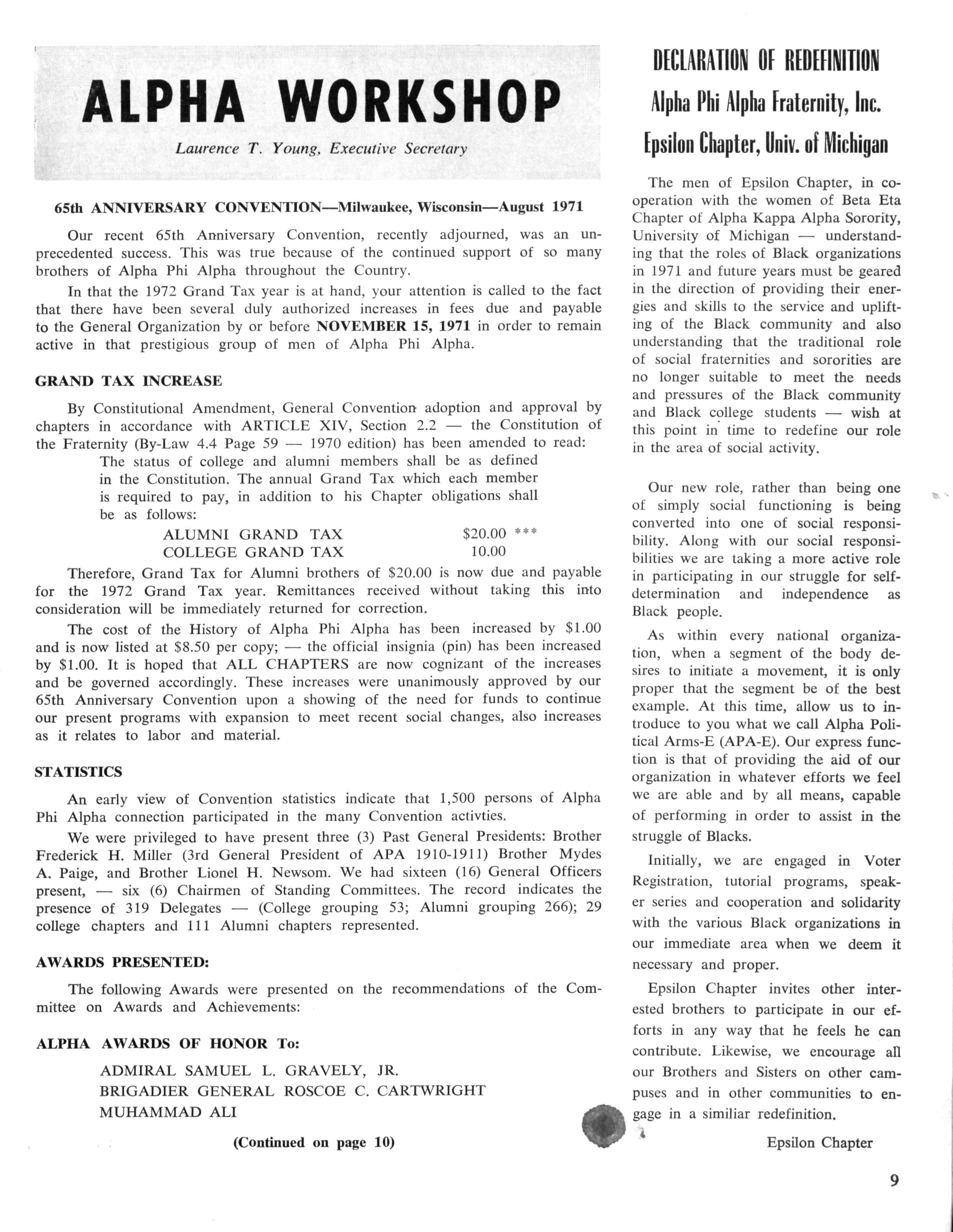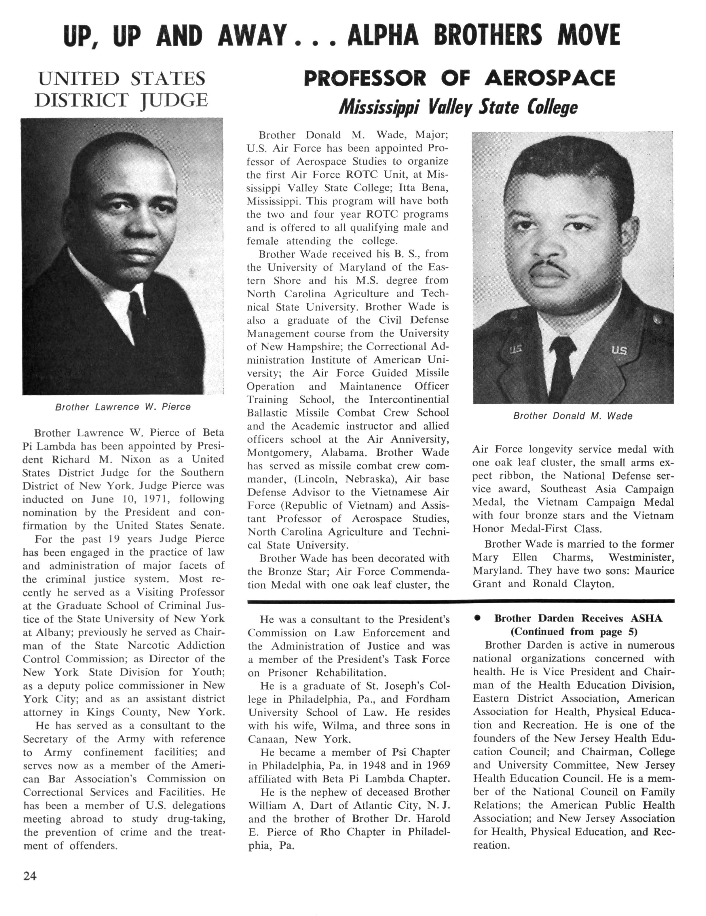 The chapter had representation to the District VII — Virginia Annual Virginia Association of Alpha Phi Alpha Fraternity's (V.A.C.A.P.A.F.) Convention in Petersburg, Va February, and delegates to the Eastern Regional Convention in Pittsburgh, Pa. in May, 1971. Representatives have been elected to represent the Chapter at the General Convention in Milwaukee in August. Among the officers of the Chapter are; Bro Douglas Cooley, Sr., President, Bro Herman Lundy, Vice President, Bro. Richard Booker, Secretary, and Bro Dr Nathaniel West Treasurer