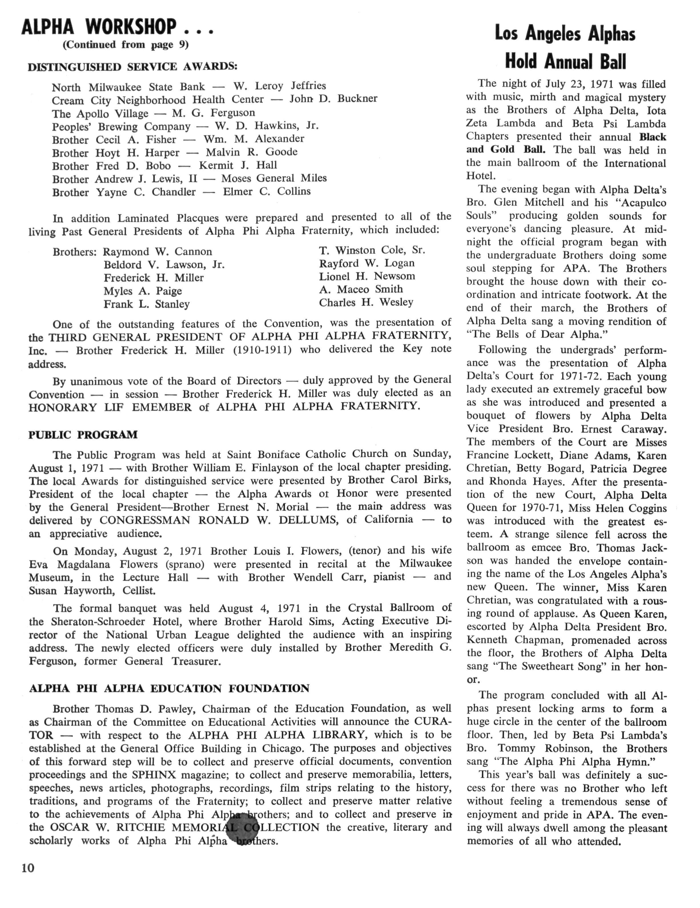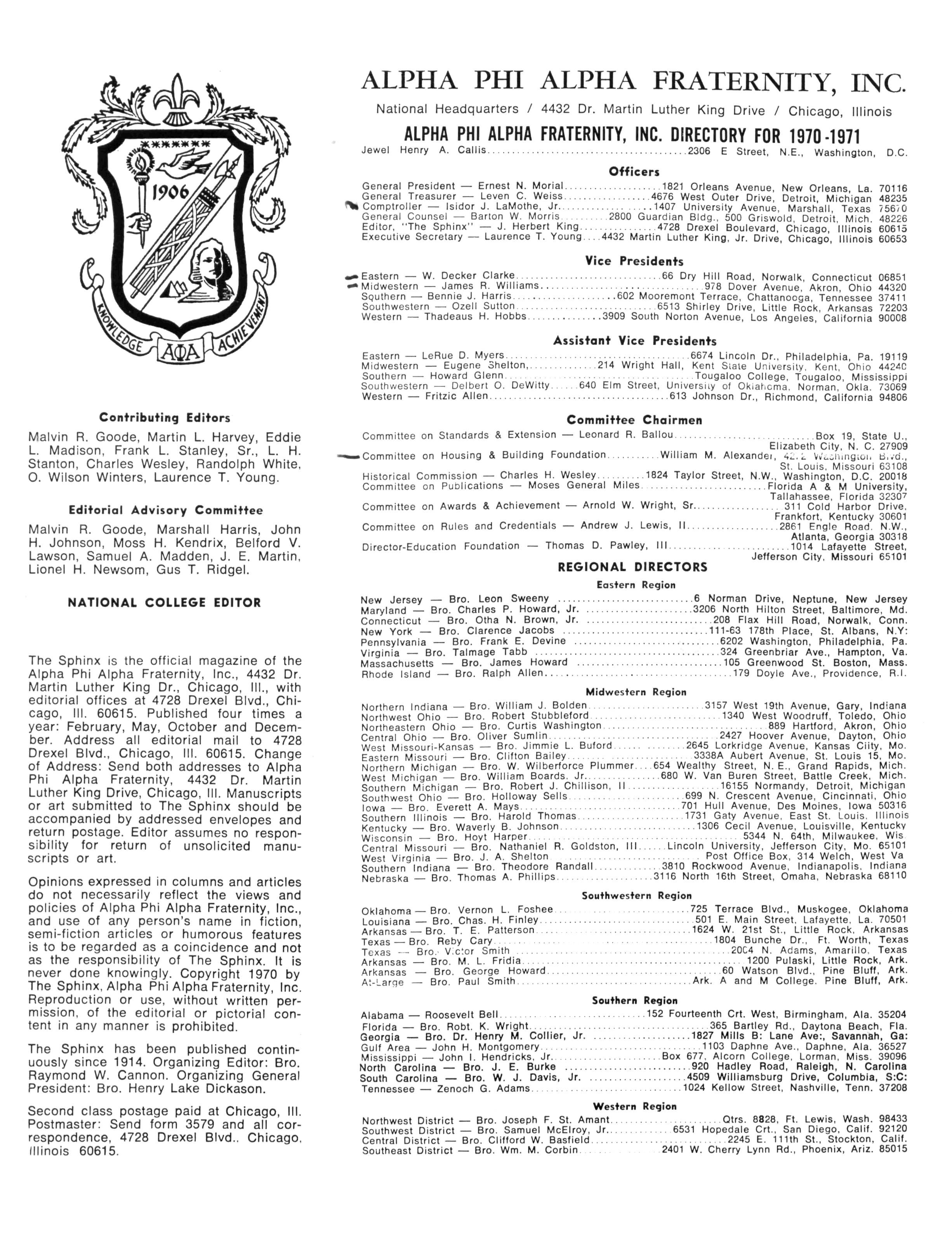 The Sphinx is the official magazine of the Alpha Phi Alpha Fraternity, Inc., 4432 Dr Martin Luther King Dr., Chicago, III., with editorial offices at 4728 Drexel Blvd., Chicago, III 60615 Published four times a year: February, May, October and December Address all editorial mail to 4728 Drexel Blvd., Chicago, III 60615 Change of Address: Send both addresses to Alpha Phi Alpha Fraternity, 4432 Dr Martin Luther King Drive, Chicago, III Manuscripts or art submitted to The Sphinx should be accompanied by addressed envelopes and return postage Editor assumes no responsibility for return of unsolicited manuscripts or art