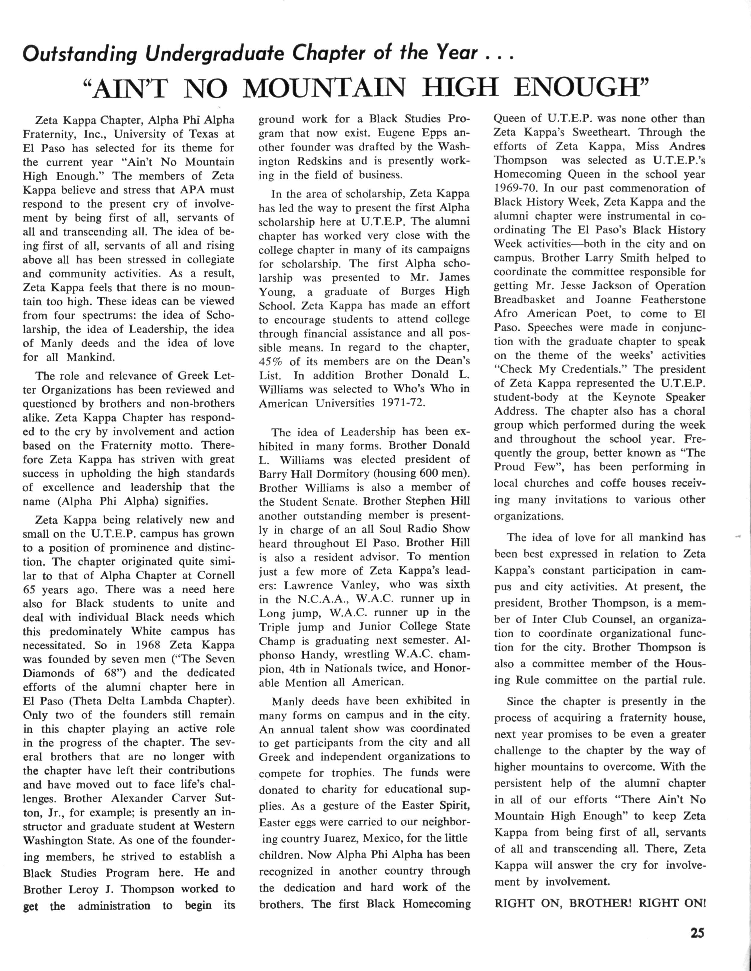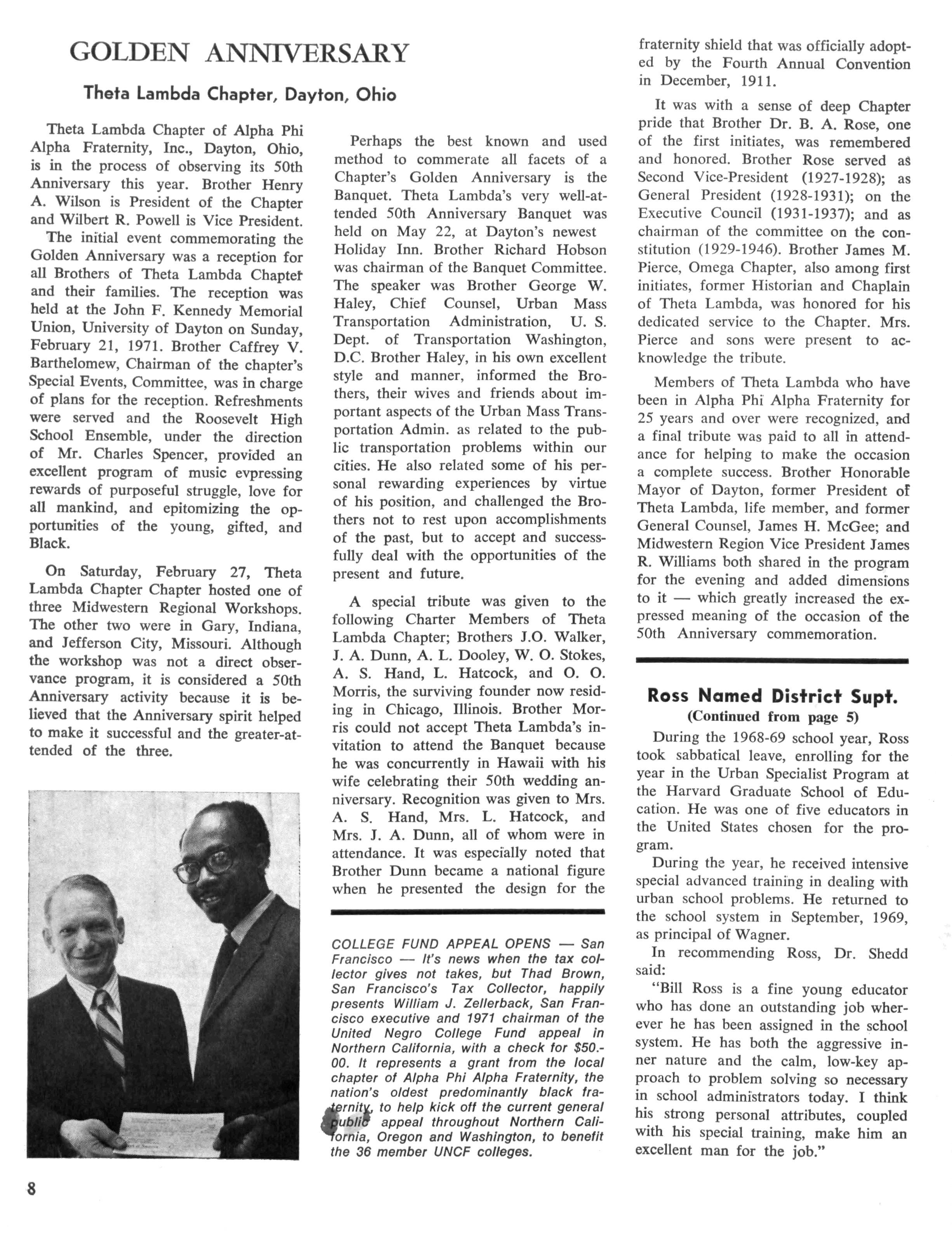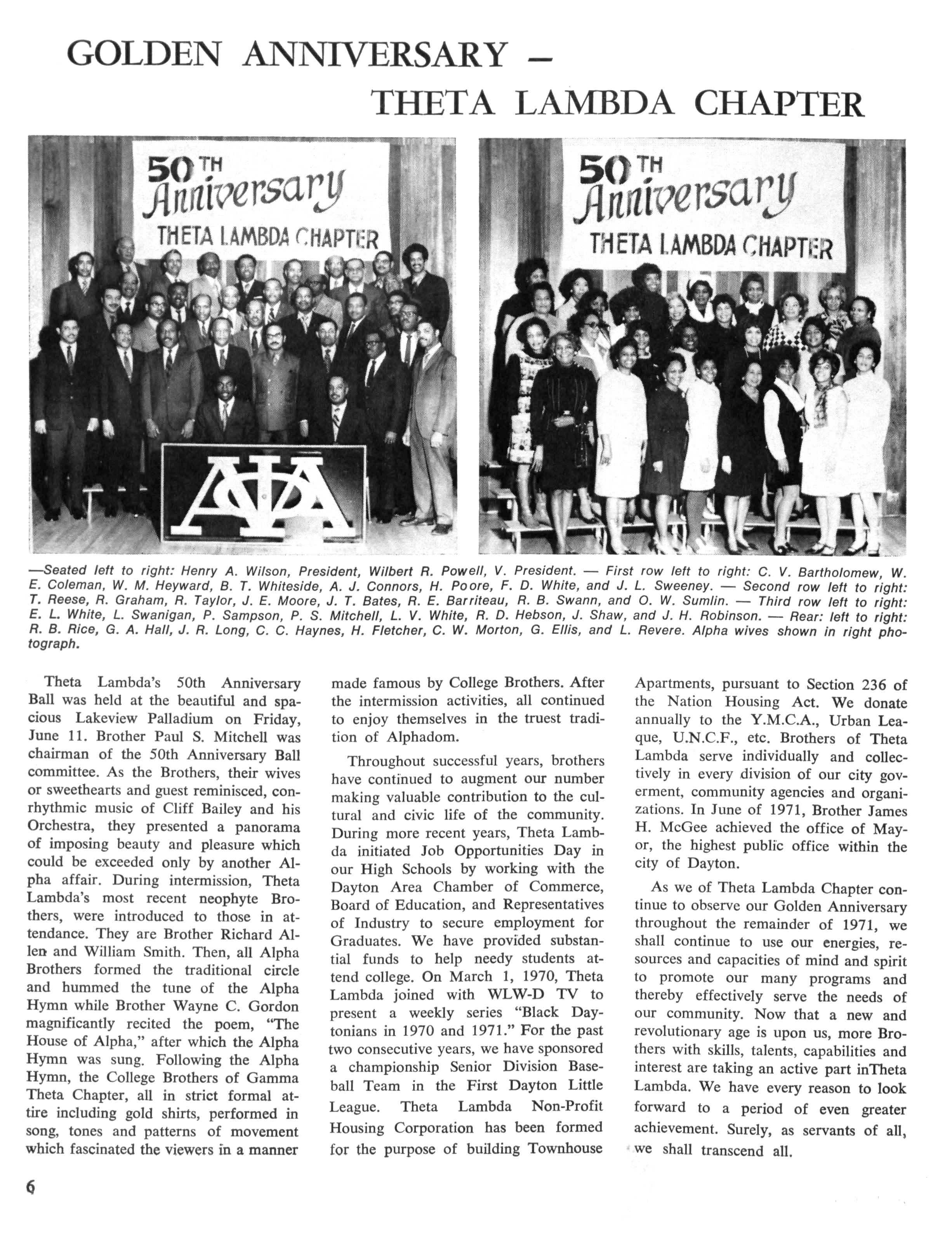 Many brothers are doing outstanding jobs participating in civic, political, and social programs of the city. At this time, the names of a few of the brothers will be given. Brothers, J. Williard Vann is director of Model Cities Program, Johnny West is one of the executives in the Tulsa Housing Authority Program, and Dr. Robert Willis, Chiropidist, is chairman of the social committee of the chapter The chapter, under the leadership of brother Willis has sponsored an Alpha Sweetheart and Scholarship dance once a year at Fountain Head Lodge, which is located near Eufaula, Okla This event has provided the brothers an excellent social outlet, and an opportunity to raise scholarship funds for worthy graduation senior boys The sweetheart of Alpha Tau Lambda Chapter for 1971-1972, is Mrs Johnny West The chapter provided $1,100 scholarships during 1970