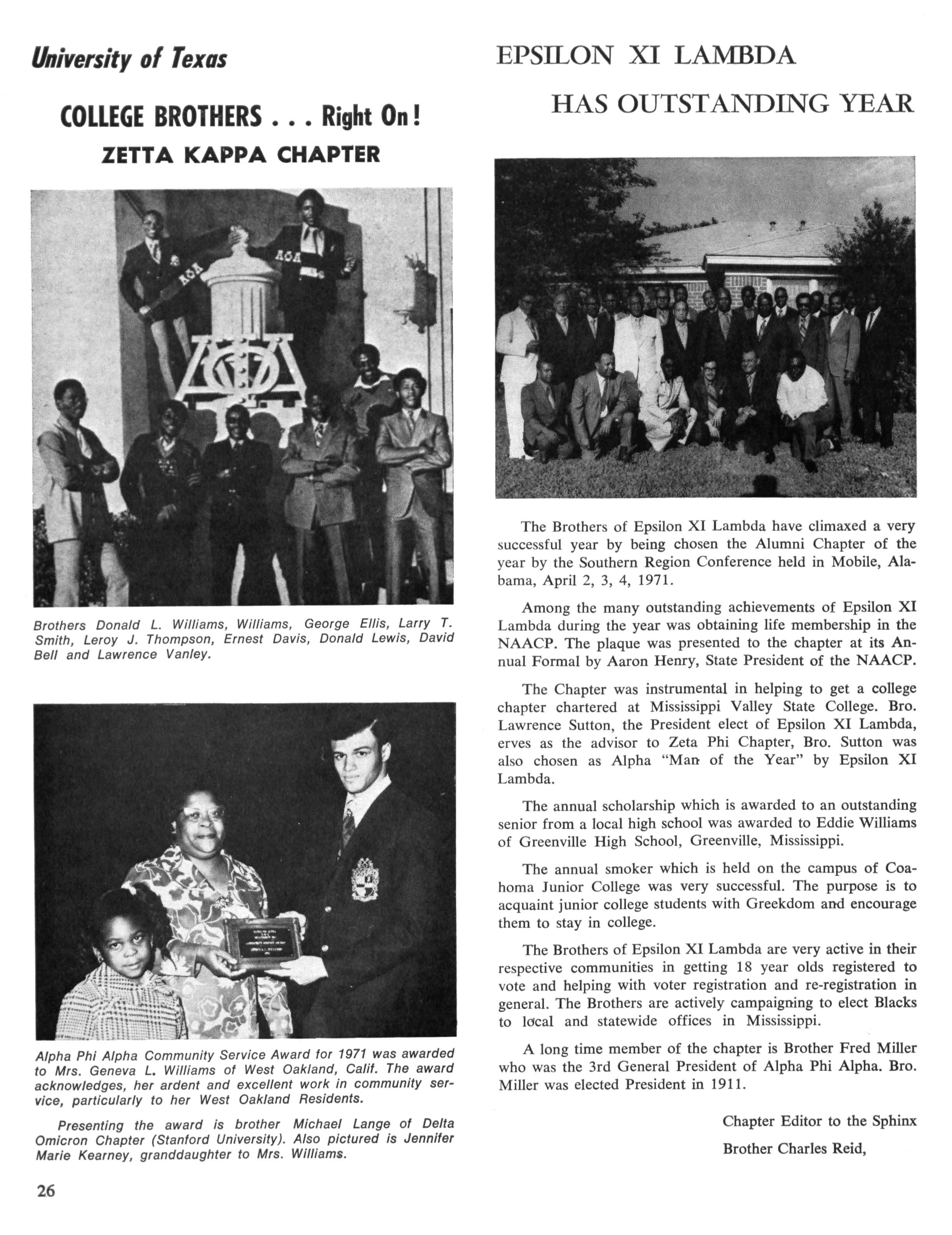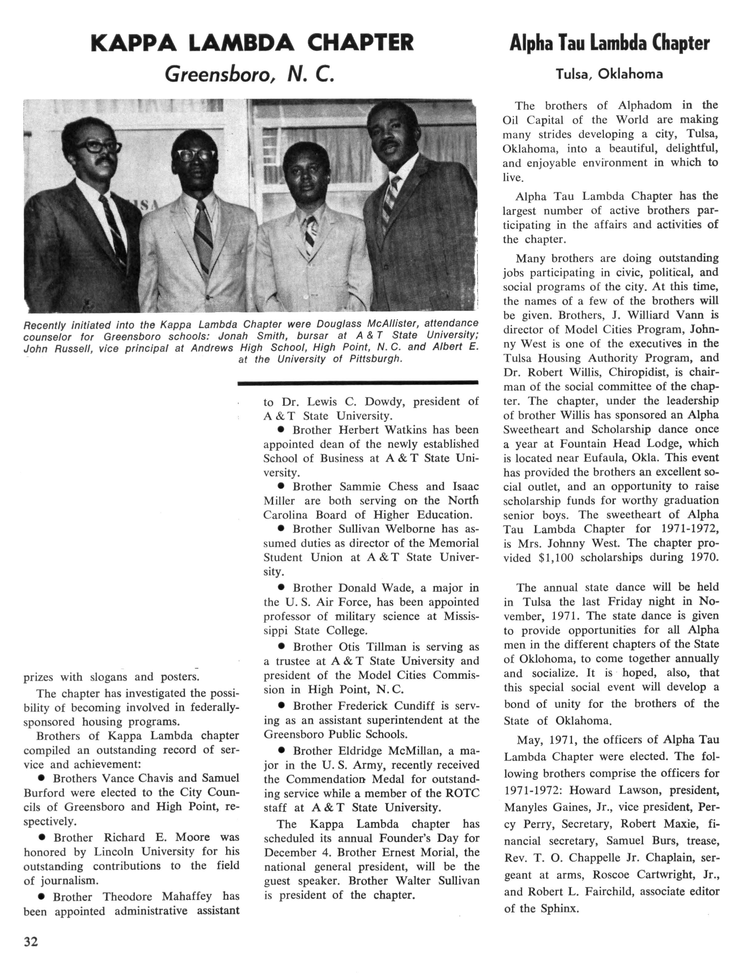 May, 1971, the officers of Alpha Tau Lambda Chapter were elected The following brothers comprise the officers for 1971-1972: Howard Lawson, president, Manyles Gaines, Jr., vice president, Percy Perry, Secretary, Robert Maxie, financial secretary, Samuel Burs, trease, Rev T O Chappelle Jr Chaplain, sergeant at arms, Roscoe Cartwright, Jr., and Robert L Fairchild, associate editor of the Sphinx