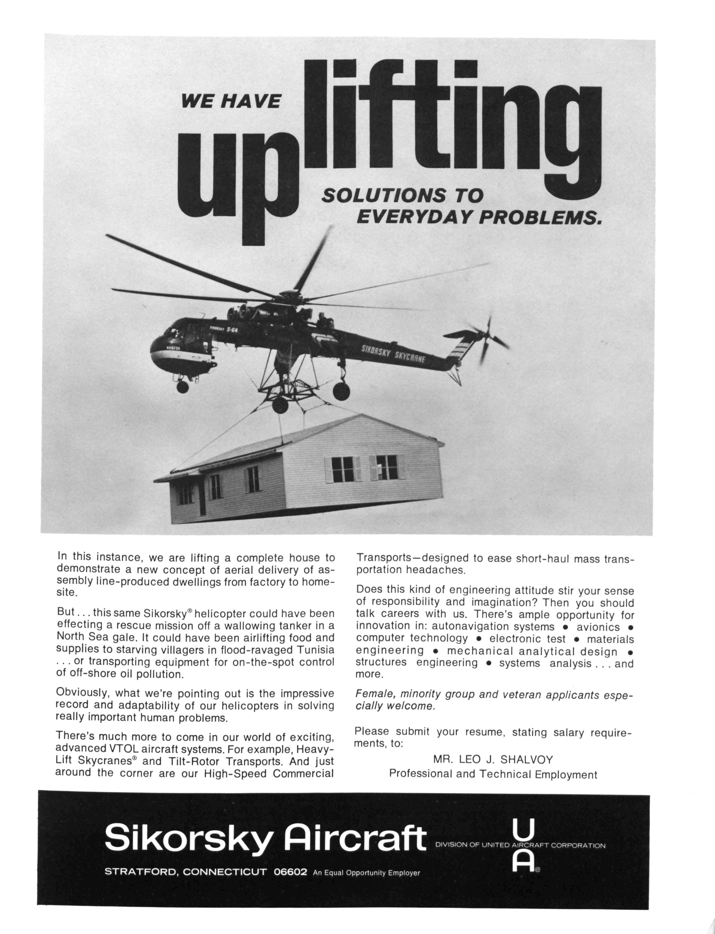 But... this same Sikorsky® helicopter could have been effecting a rescue mission off a wallowing tanker in a North Sea gale It could have been airlifting food and supplies to starving villagers in flood-ravaged Tunisia ... or transporting equipment for on-the-spot control of off-shore oil pollution