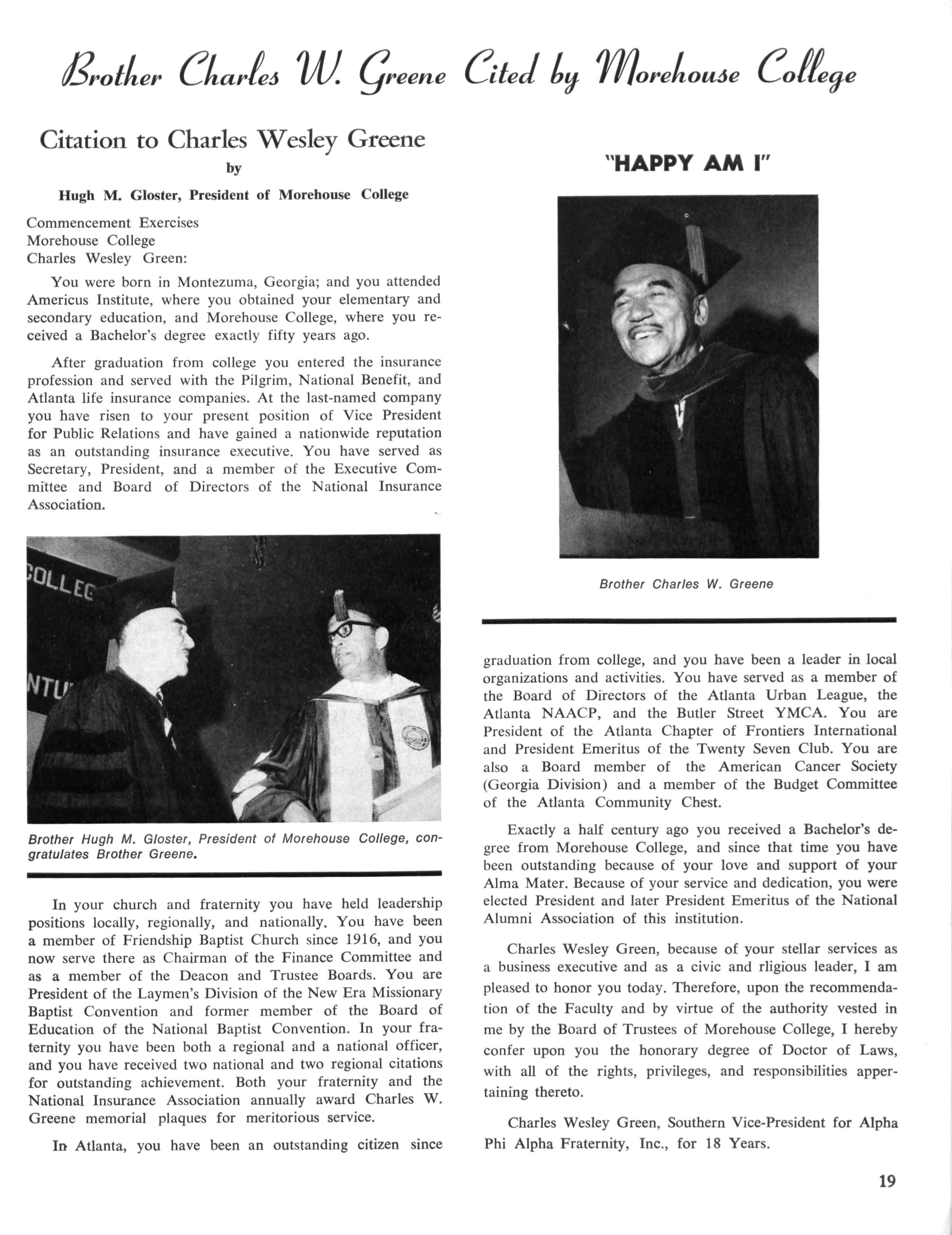 not ceased to attend the general conventions and now and then I hope and plan to be present Next April 12 will mark the 60th anniversary of my entrance into Alpha Phi Alpha. To have had a part in shaping and guiding Alpha Phi Alpha is a great honor; and serving my Fraternity and mankind has been a glorious experience.
