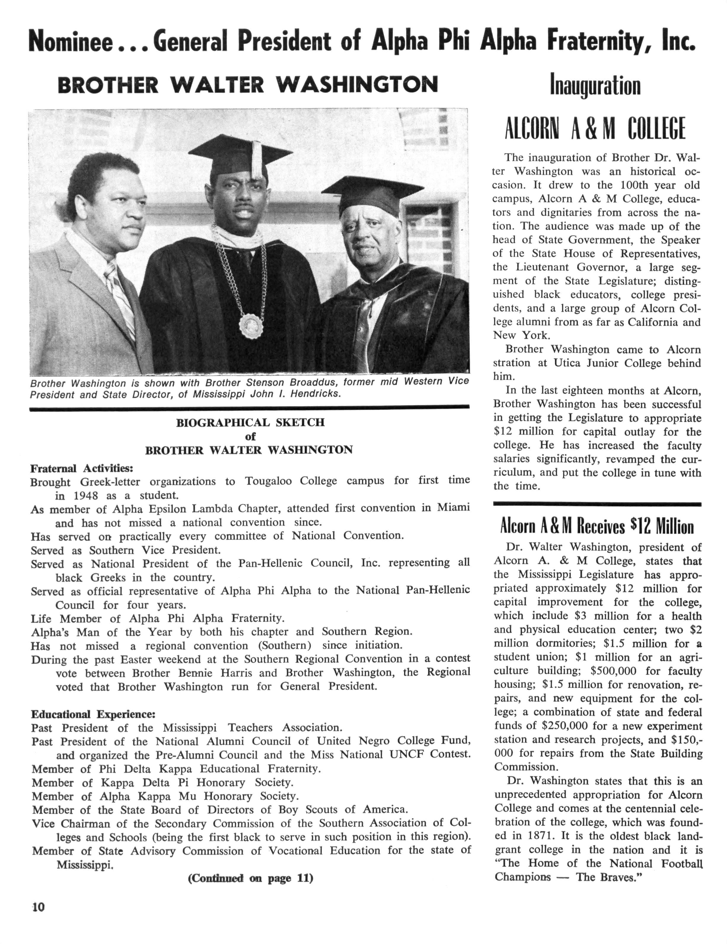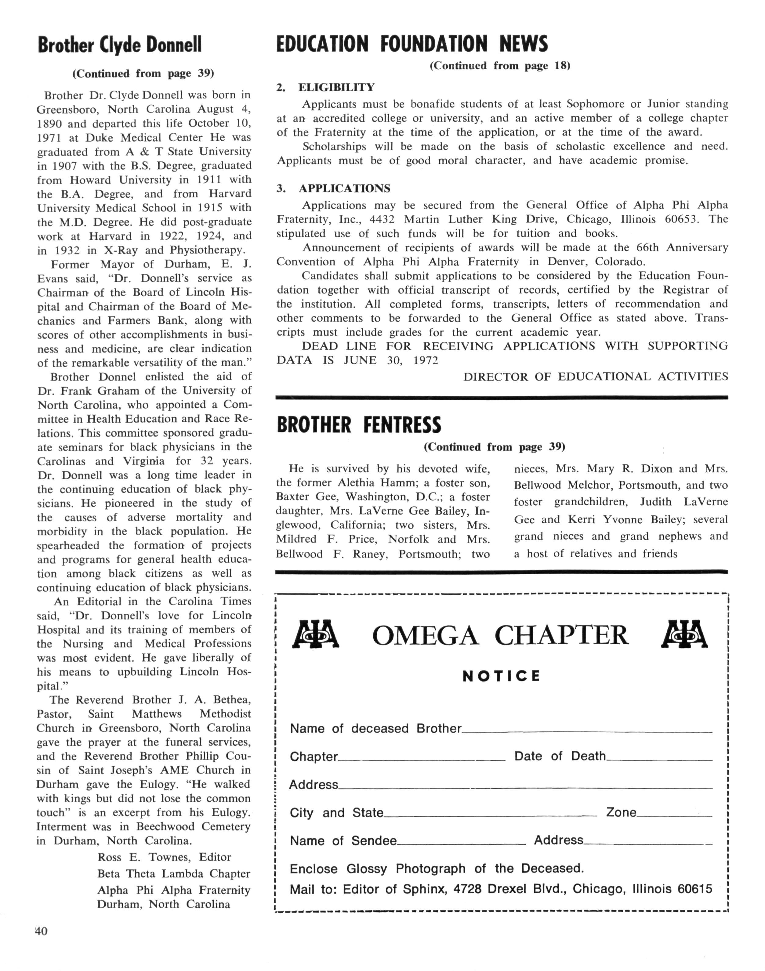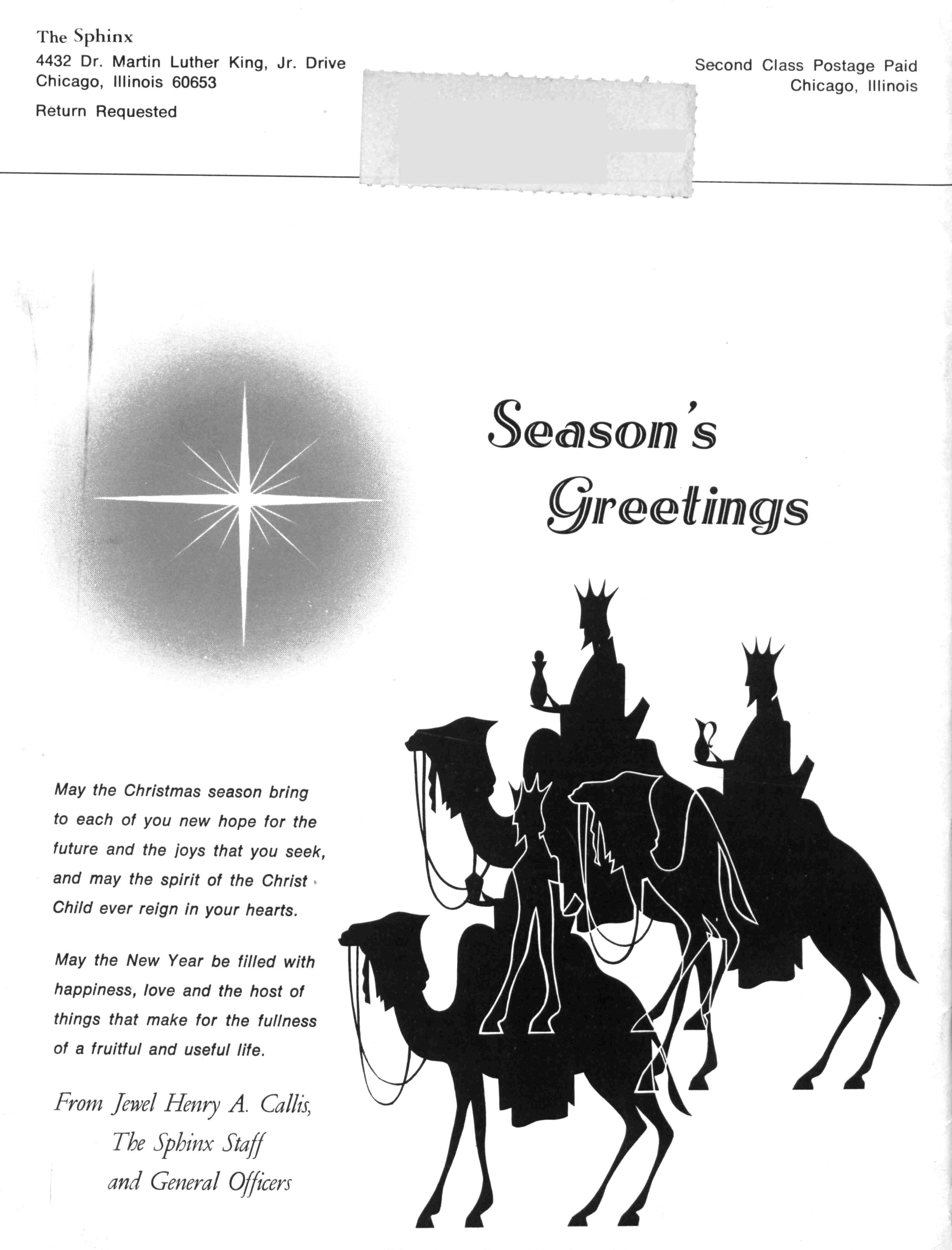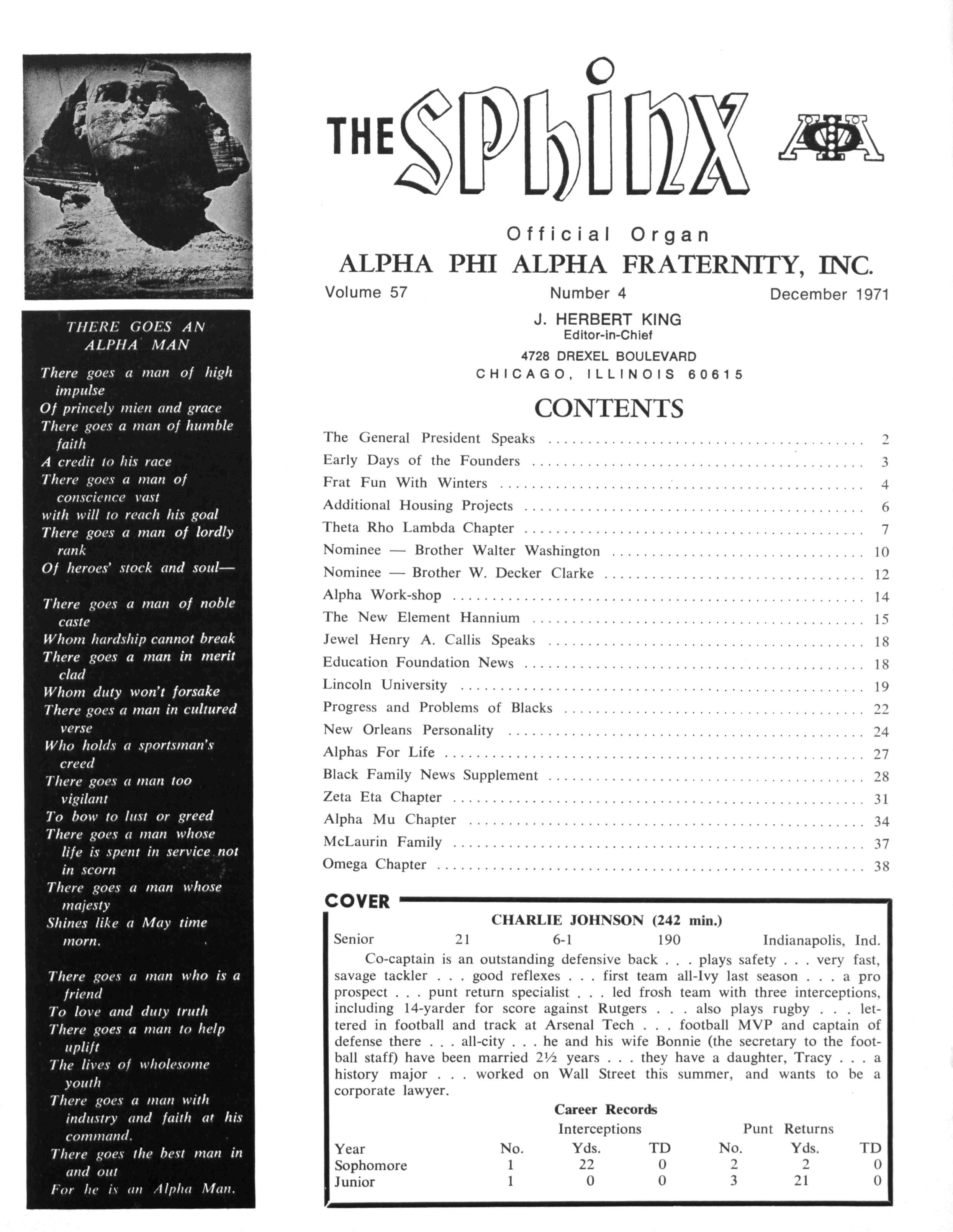 The Sphinx is the official magazine of the Alpha Phi Alpha Fraternity, Inc., 4432 Dr Martin Luther King Dr., Chicago, III., with editorial offices at 4728 Drexel Blvd., Chicago, III 60615 Published four times a year: February, May, October and December Address all editorial mail to 4728 Drexel Blvd., Chicago, III. 60615. Change of Address: Send both addresses to Alpha Phi Alpha Fraternity, 4432 Dr Martin Luther King Drive, Chicago, III Manuscripts or art submitted to The Sphinx should be accompanied by addressed envelopes and return postage Editor assumes no responsibility for return of unsolicited manuscripts or art