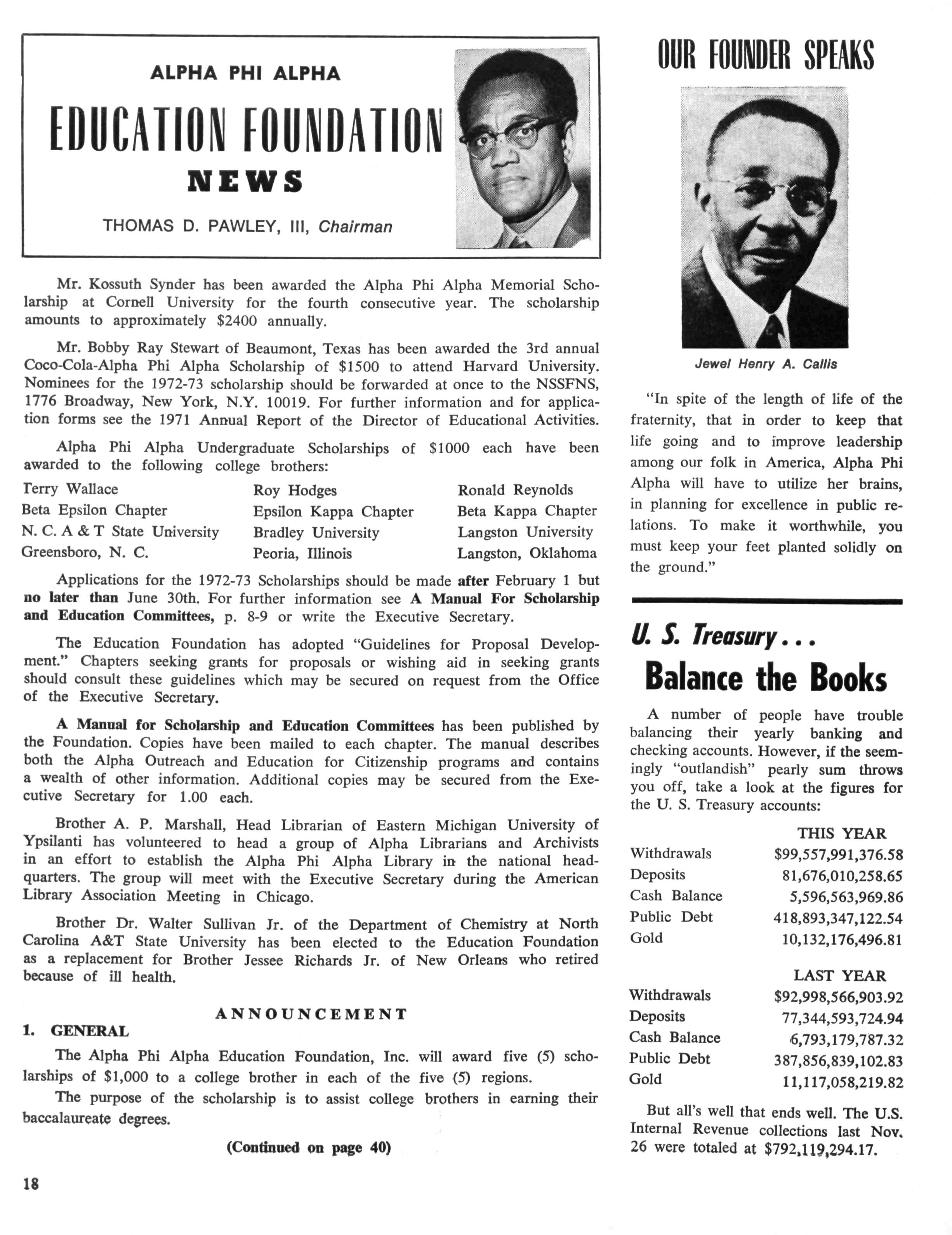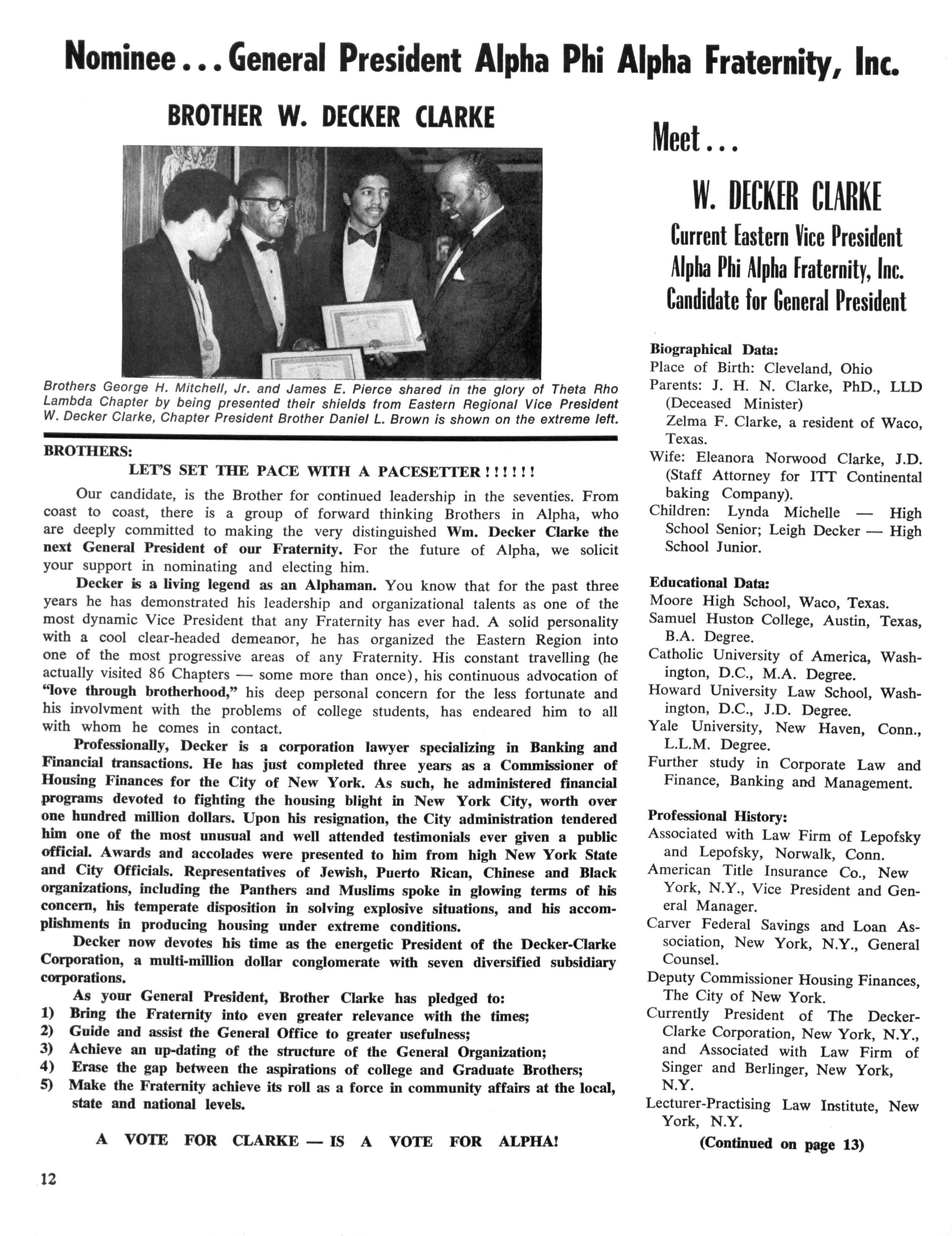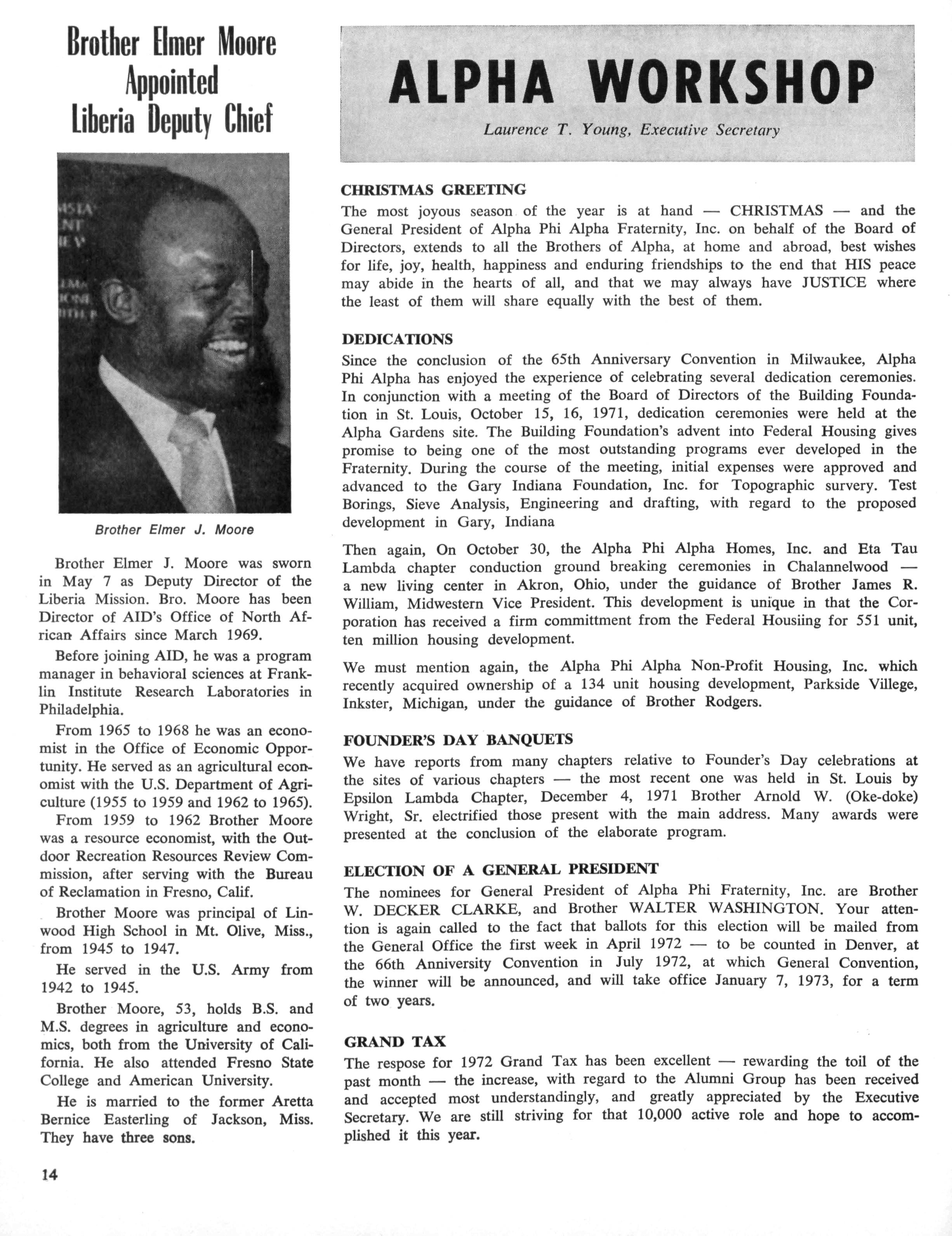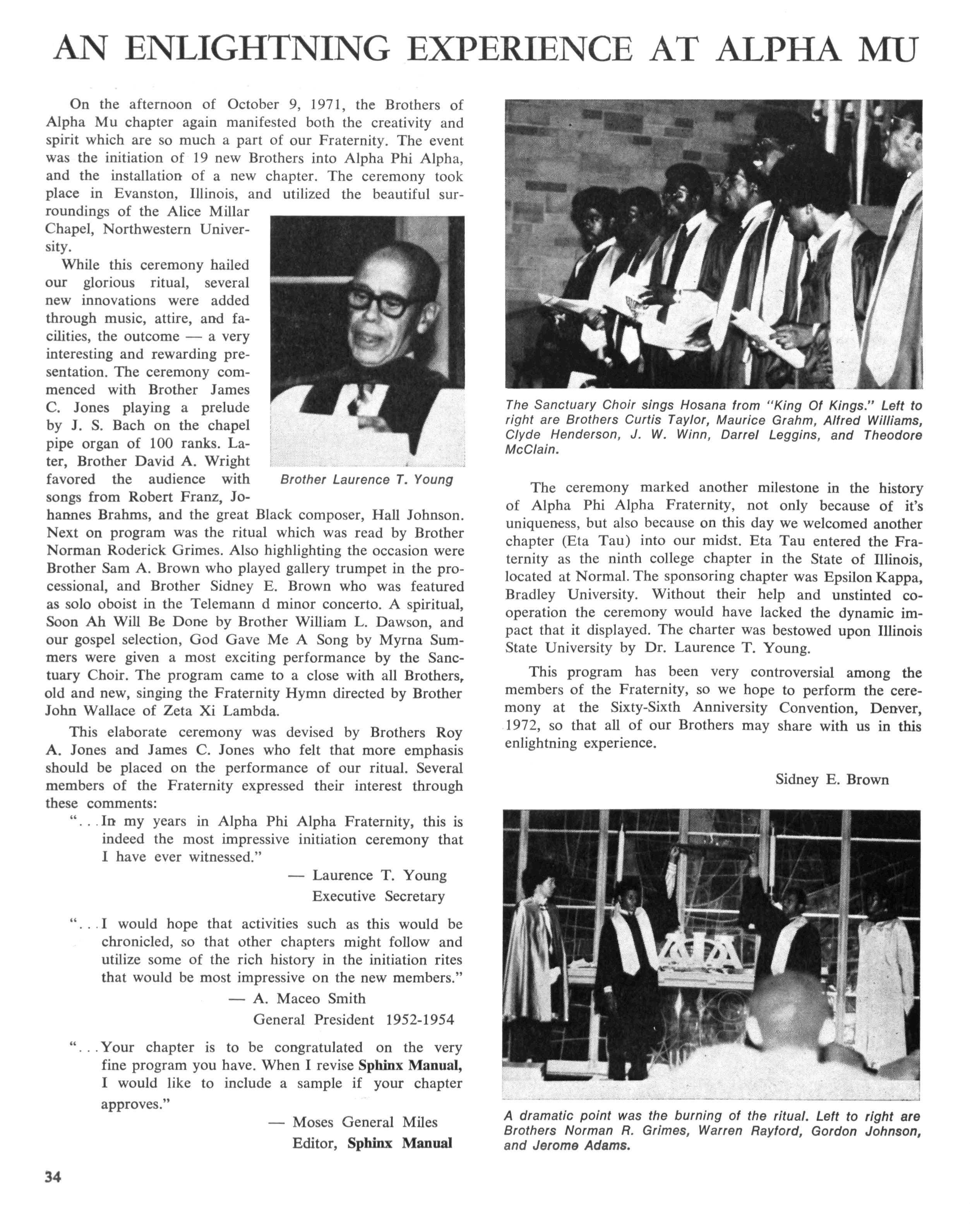 The Sphinx is the official magazine of the Alpha Phi Alpha Fraternity, Inc., 4432 Dr Martin Luther King Dr., Chicago, III., with editorial offices at 4728 Drexel Blvd., Chicago, III 60615 Published four times a year: February, May, October and December Address all editorial mail to 4728 Drexel Blvd., Chicago, III. 60615. Change of Address: Send both addresses to Alpha Phi Alpha Fraternity, 4432 Dr Martin Luther King Drive, Chicago, III Manuscripts or art submitted to The Sphinx should be accompanied by addressed envelopes and return postage Editor assumes no responsibility for return of unsolicited manuscripts or art