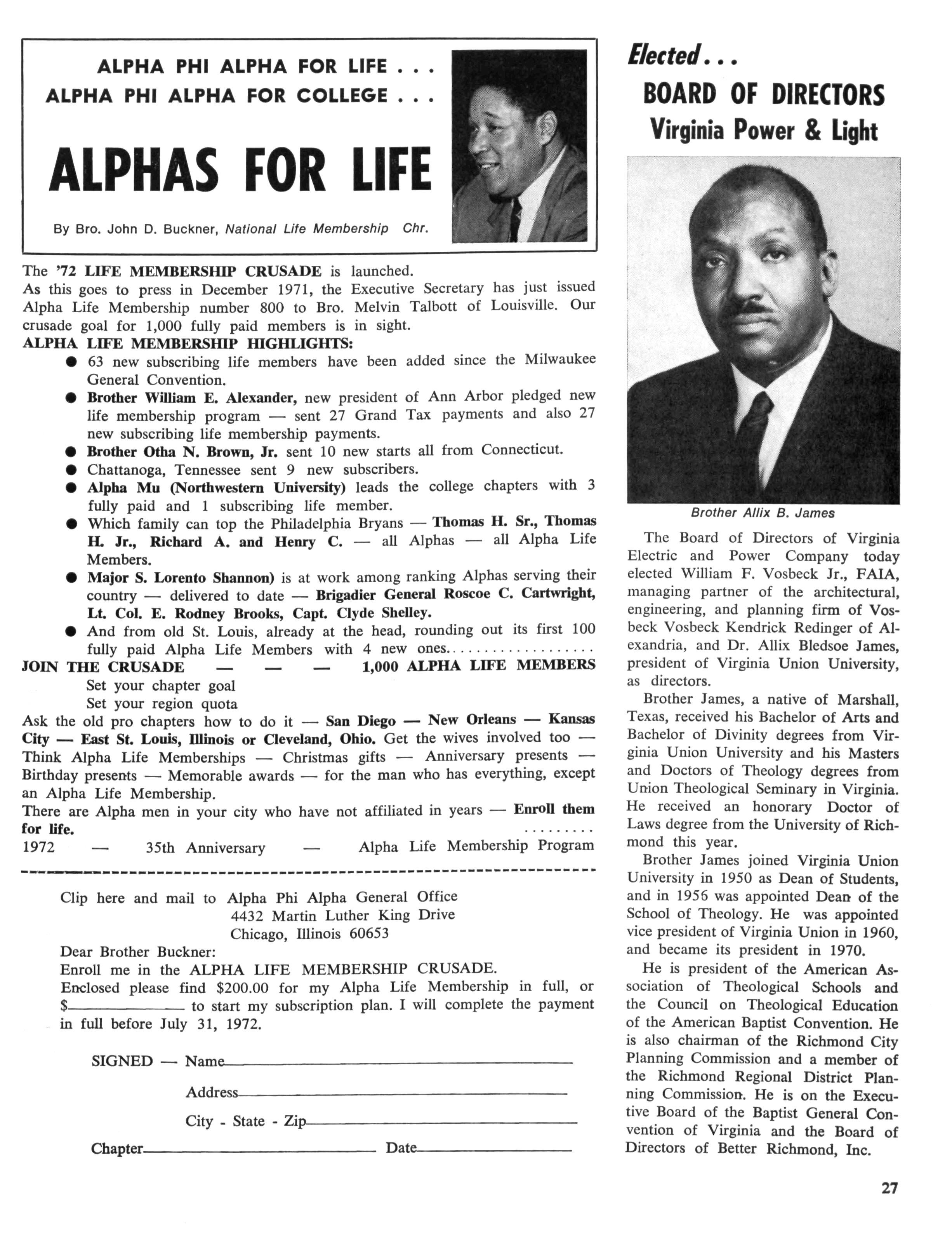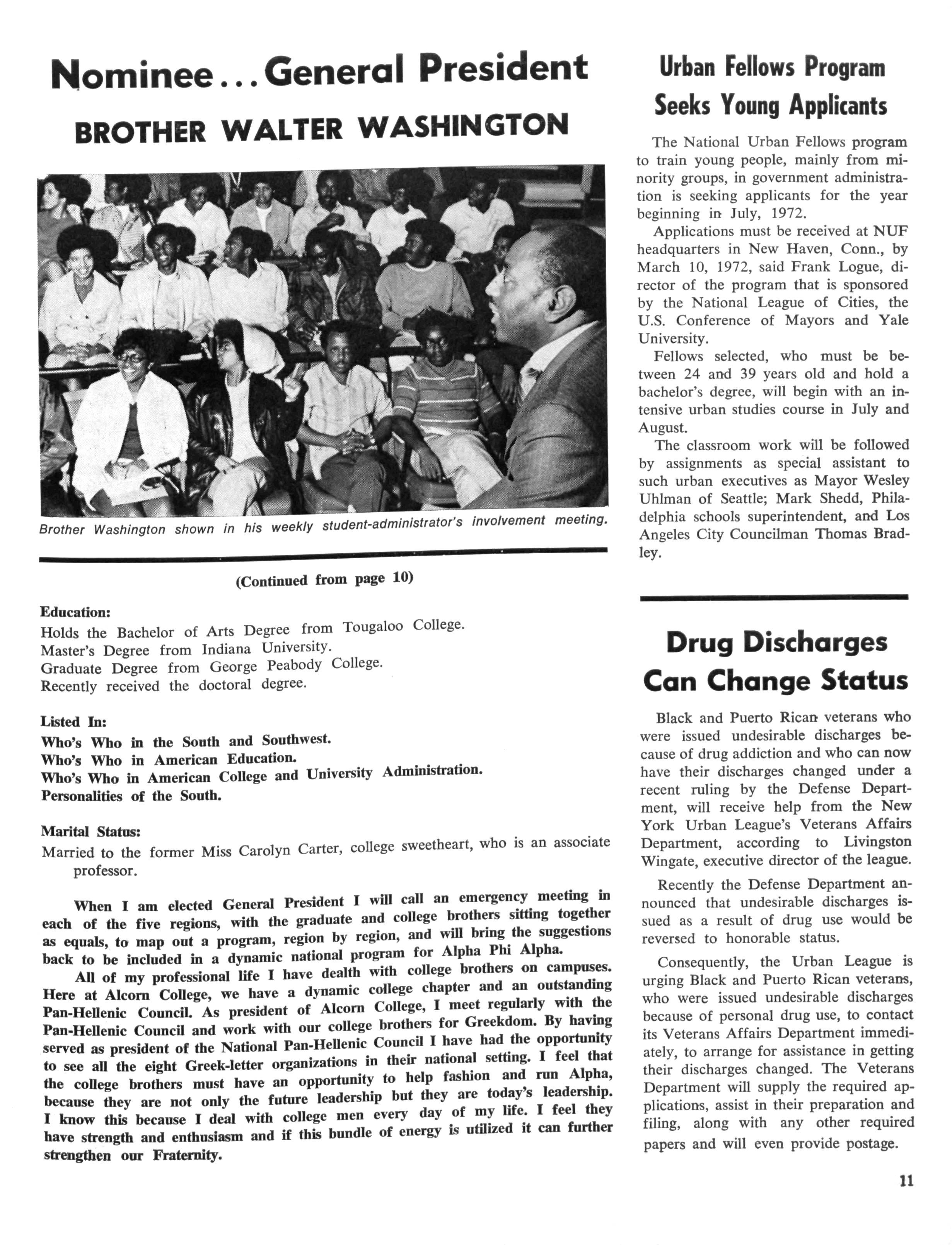 The month of April has been designated "Alpha Outreach and Education for Citizenship Month." Please encourage each chapter in your region to begin developing a program that will extend Alpha's involvement into the critical needs of the respective chapter's community. Our 1971-72 Public Policy Statement should be utilized as a source for the development of a project or program throughout the year, but particularly during Alpha Outreach and Education for Citizenship Month