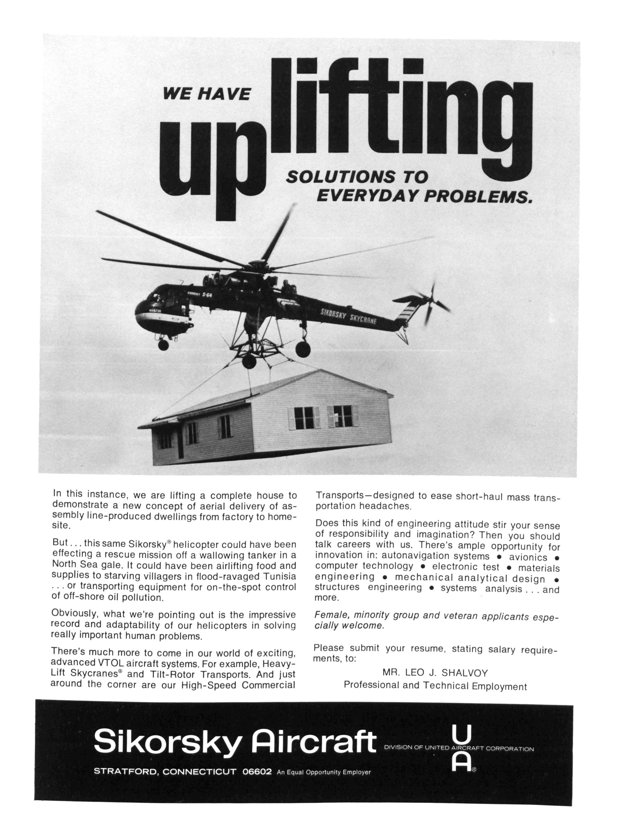 But.. this same Sikorsky* helicopter could have been effecting a rescue mission off a wallowing tanker in a North Sea gale. It could have been airlifting food and supplies to starving villagers in flood-ravaged Tunisia or transporting equipment for on-the-spot control of off-shore oil pollution