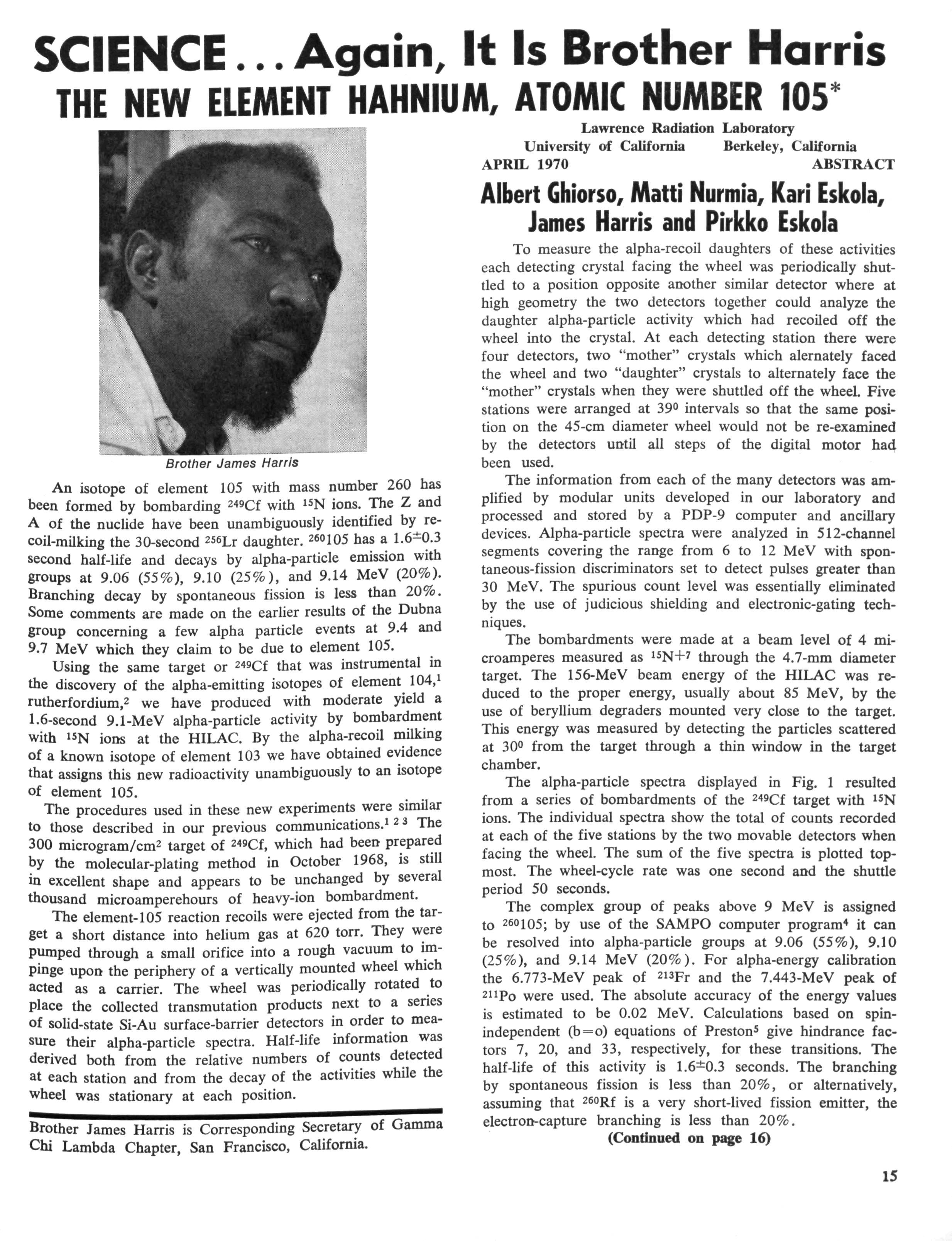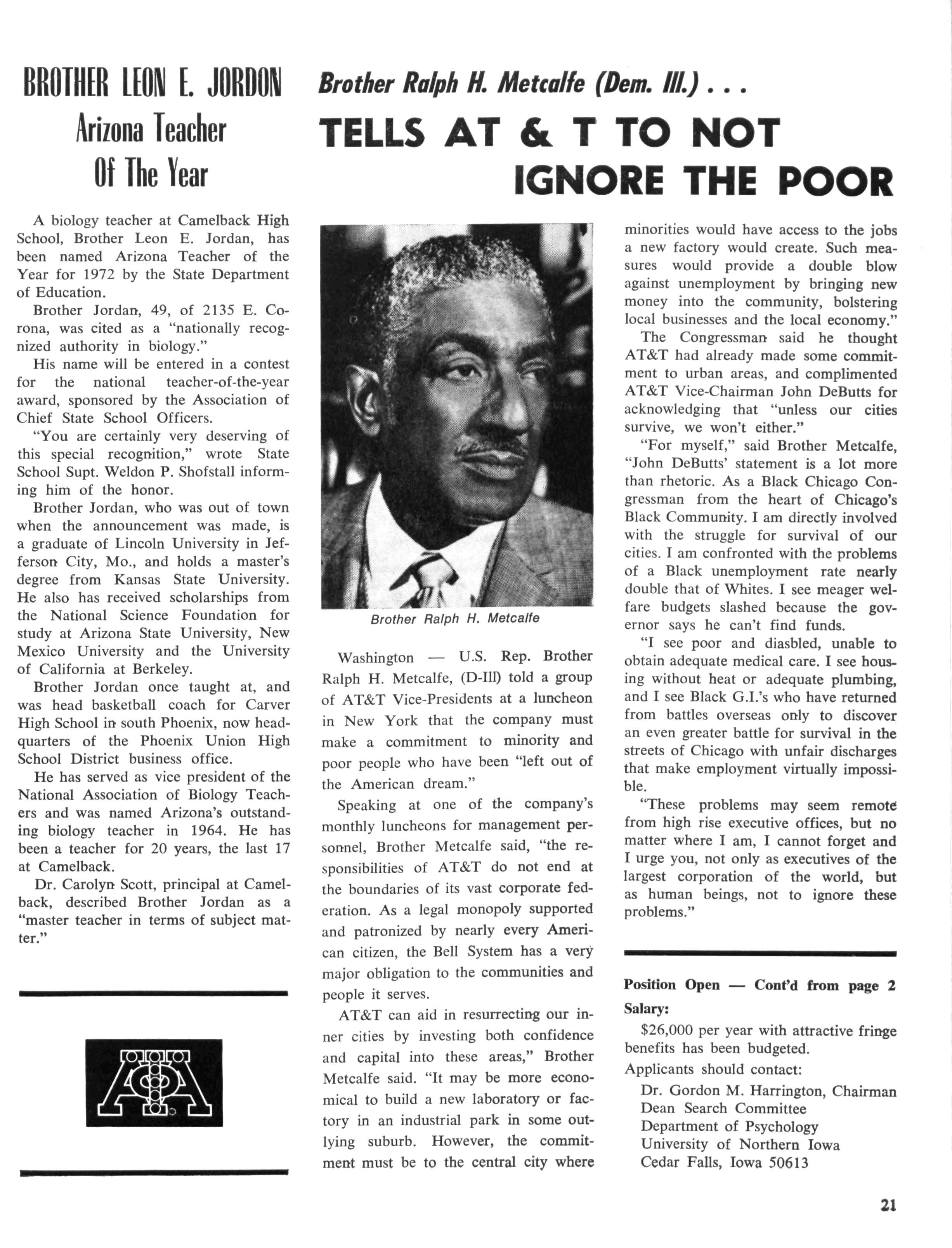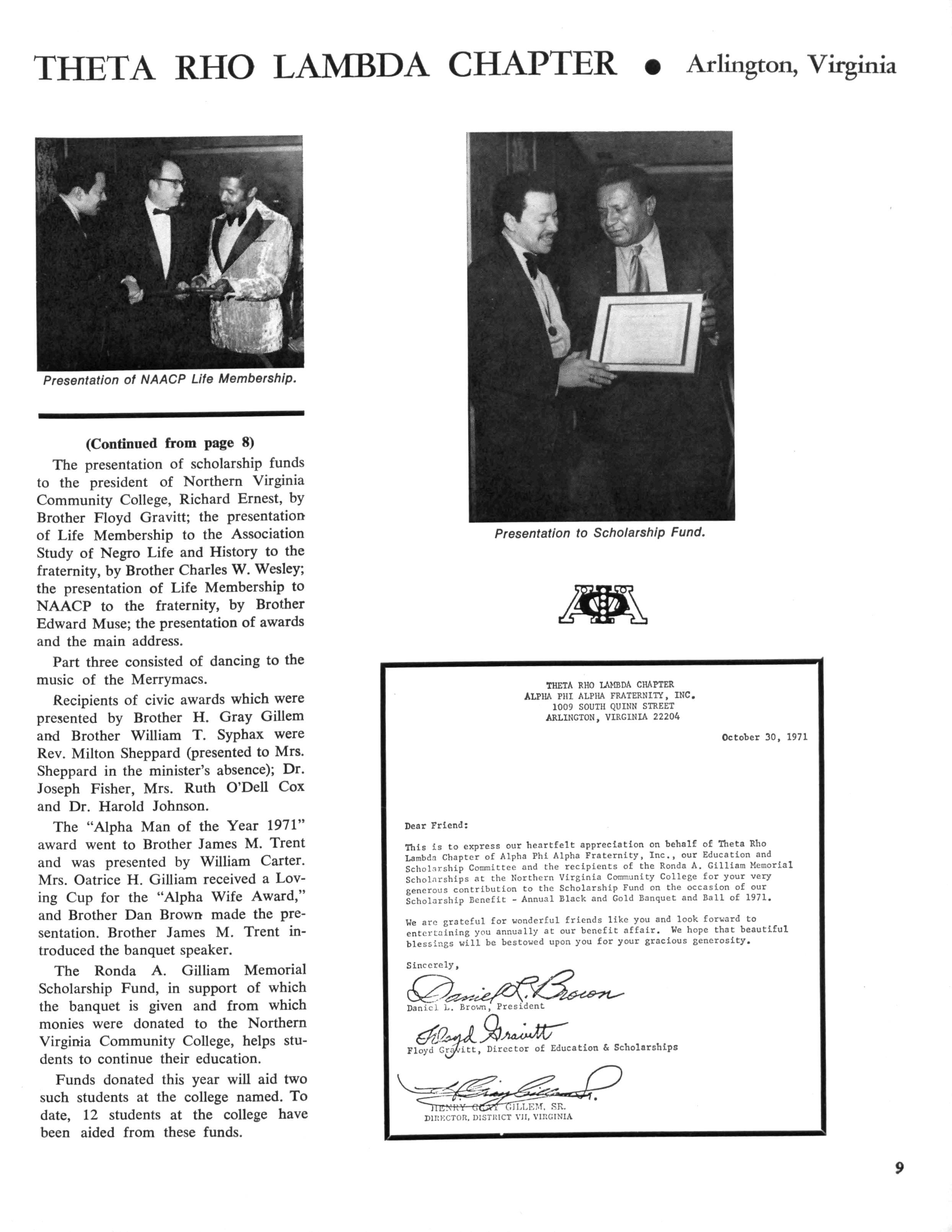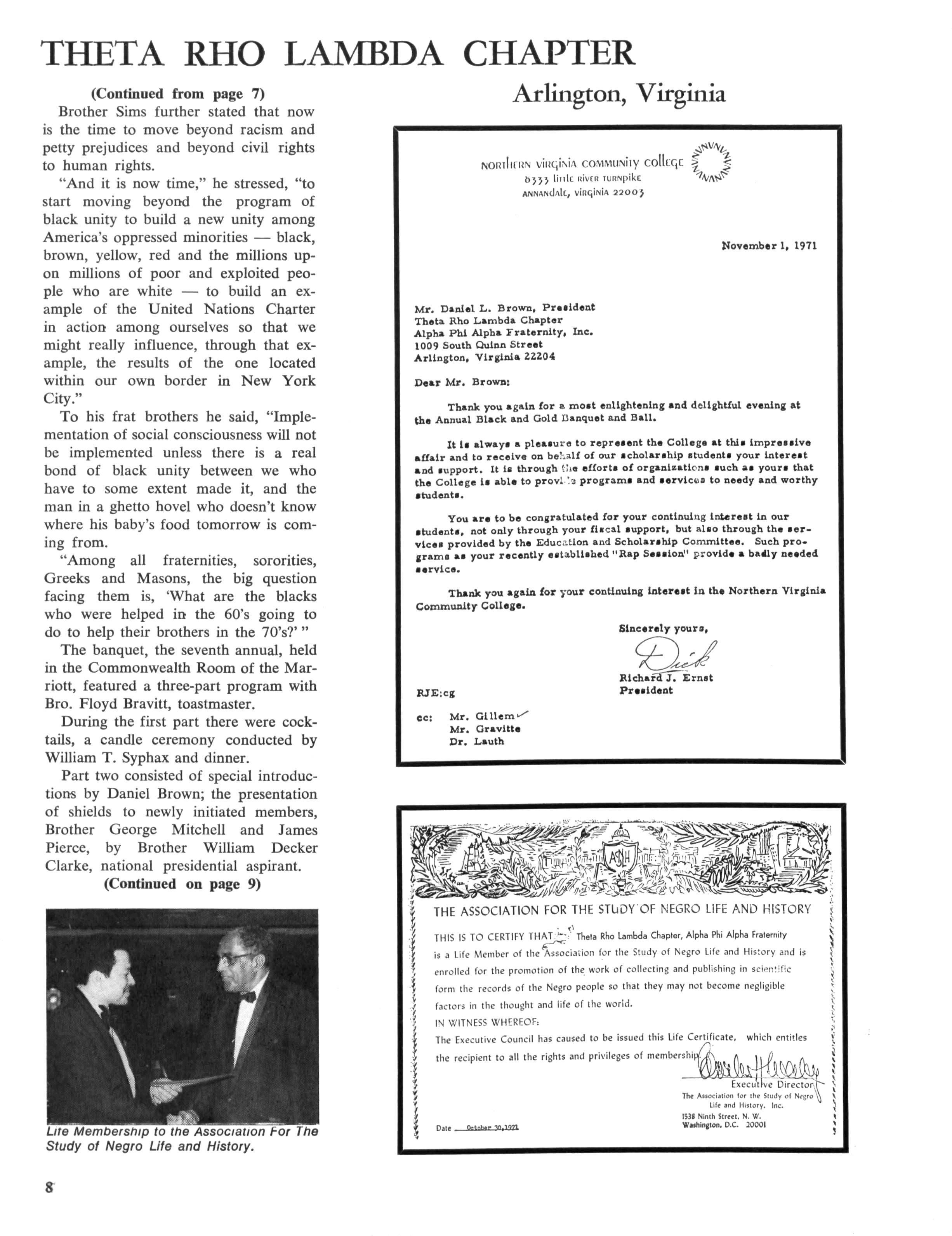 Recently, the chapter lost a brother to the Omega chapter. He is A. L. Morgan, former principal of Marion Anderson Jr High School Brother A L Morgan, upon retiring from his work as an educator was recognized on Morgan Day, May 2, 1971, as proclaimed by the mayor Robert J LaFortune, of the city of Tulsa. Brother Morgan retired May 29, and expired July 3, 1971 Another brother no longer connected with the chapter is Tollie W. Harris. He is now living in Los Angeles, Cali-