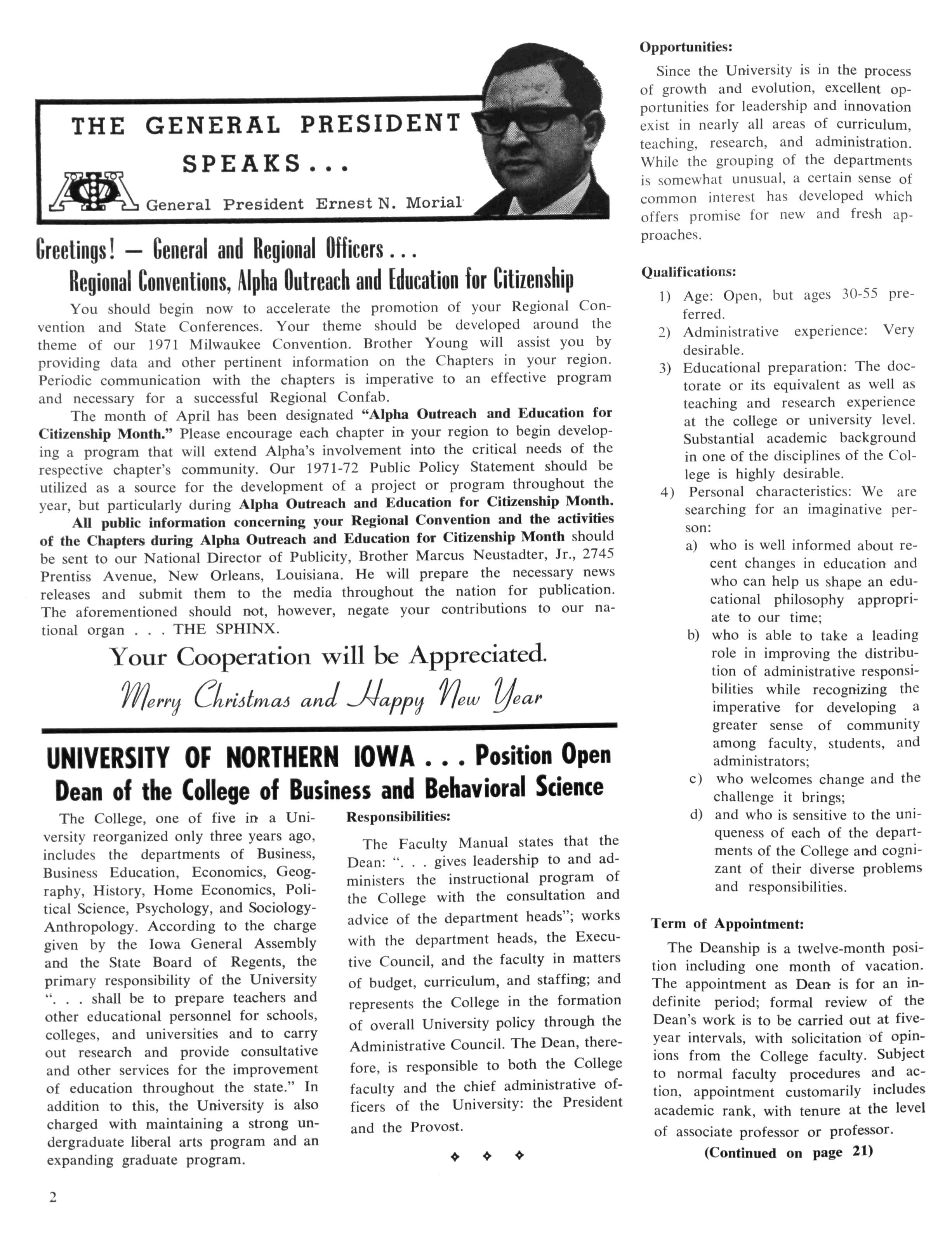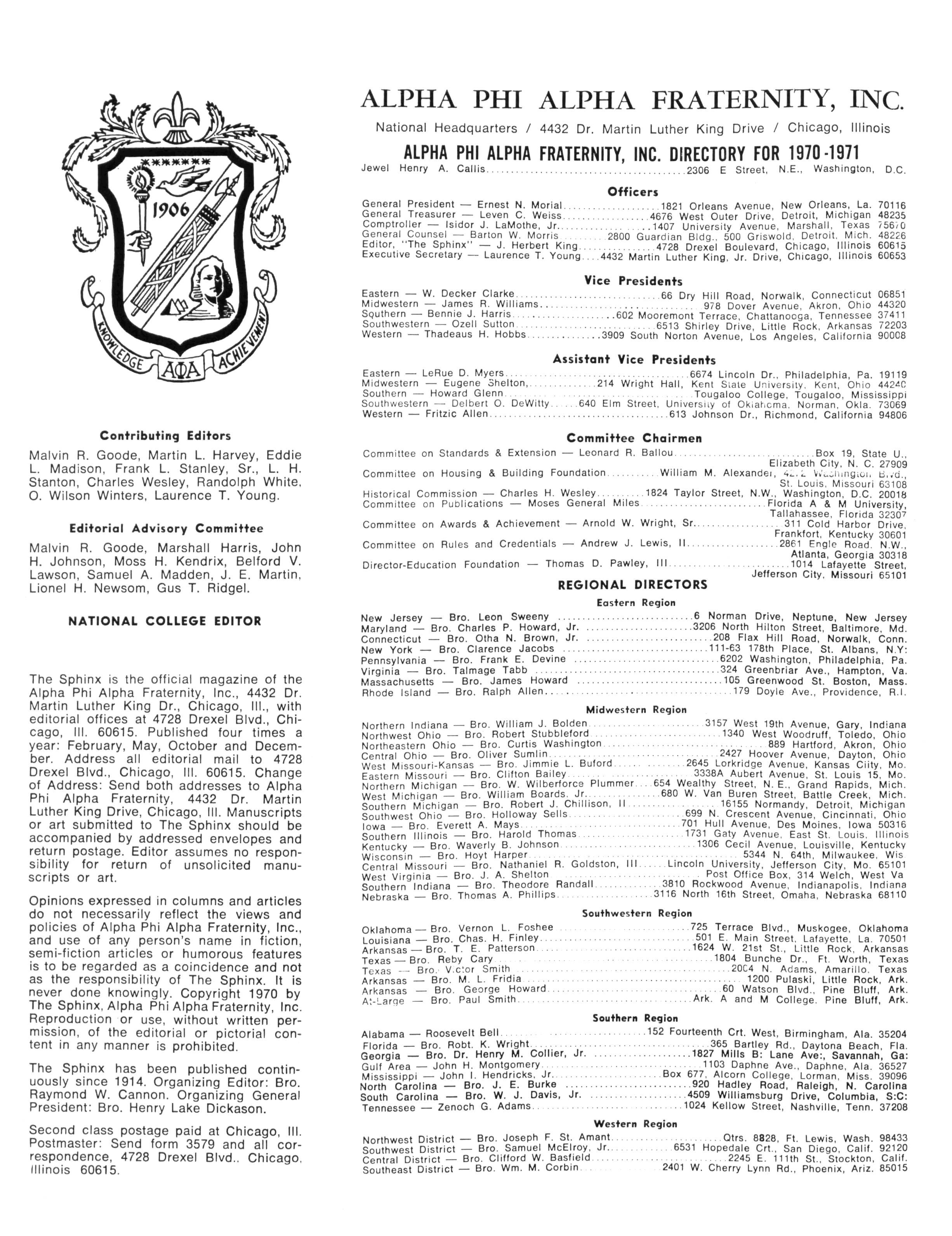 Opinions expressed in columns and articles do not necessarily reflect the views and policies of Alpha Phi Alpha Fraternity, Inc., and use of any person's name in fiction, semi-fiction articles or humorous features is to be regarded as a coincidence and not as the responsibility of The Sphinx It is never done knowingly Copyright 1970 by The Sphinx, Alpha Phi Alpha Fraternity, Inc Reproduction or use, without written permission, of the editorial or pictorial content in any manner is prohibited
