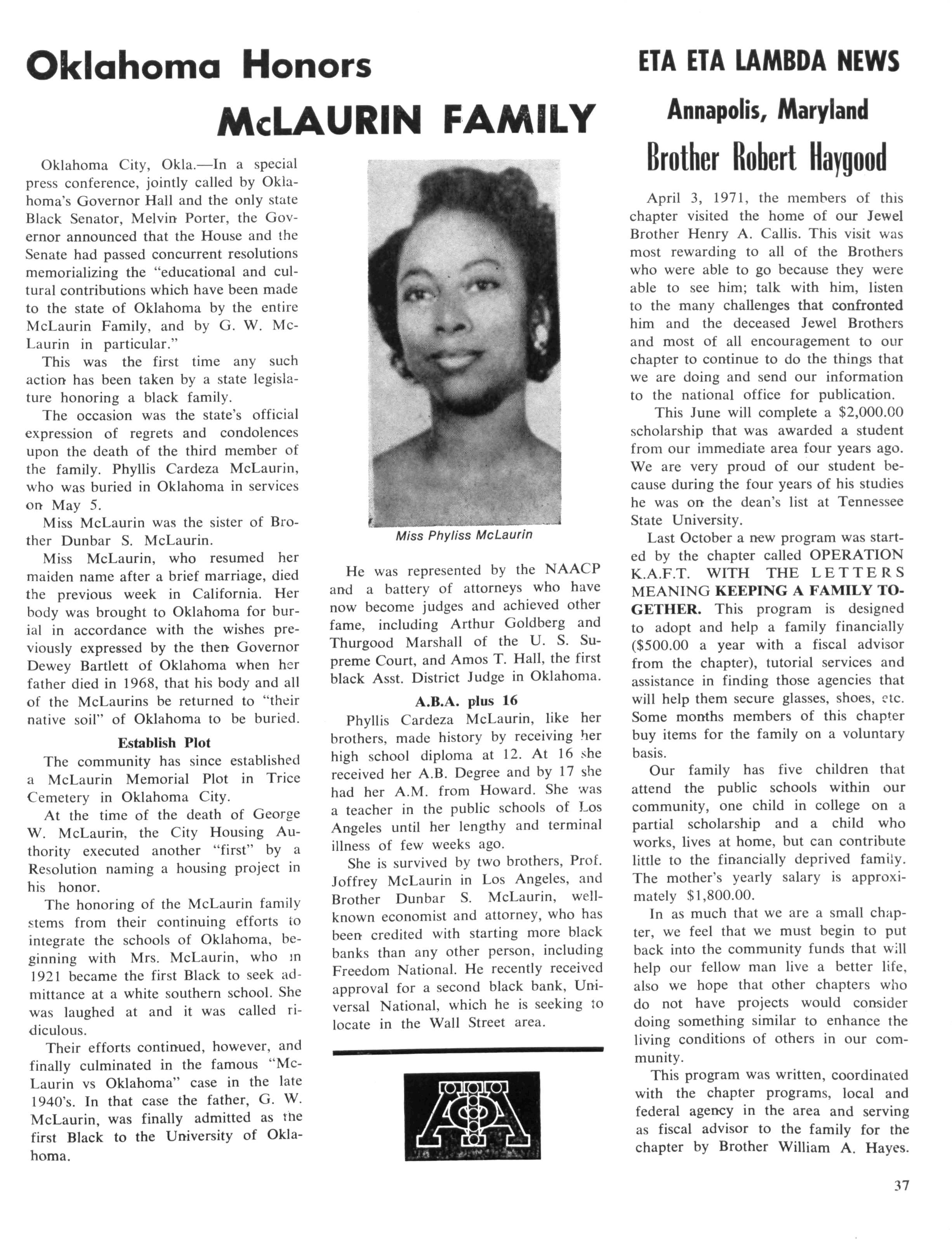 Oklahoma City, Okla.—In a special press conference, jointly called by Oklahoma's Governor Hall and the only state Black Senator, Melvin Porter, the Governor announced that the House and the Senate had passed concurrent resolutions memorializing the "educational and cultural contributions which havebeen made to the state of Oklahoma by the entire McLaurin Family, and by G. W. McLaurin in particular."