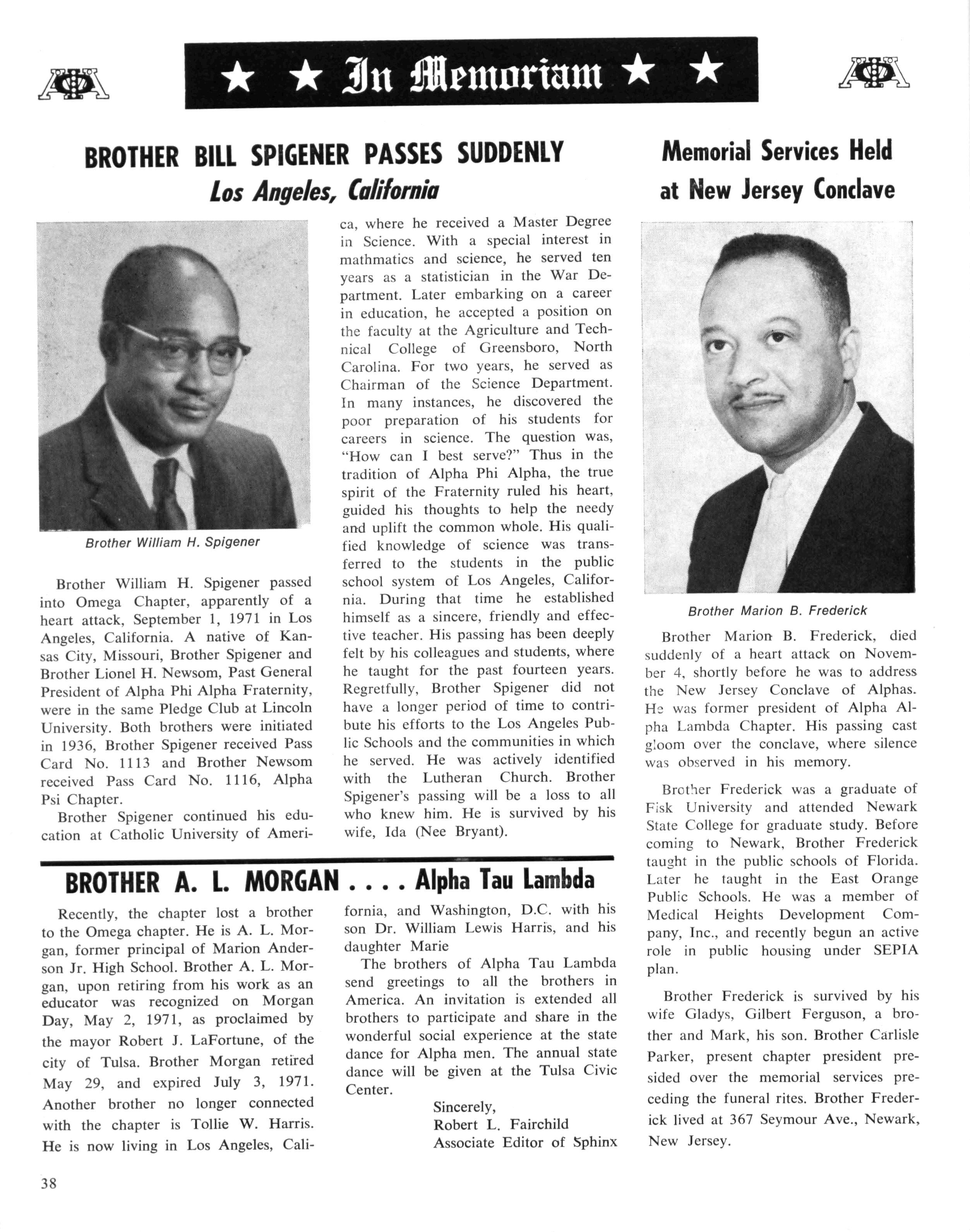Brother William H Spigener passed into Omega Chapter, apparently of a heart attack, September 1, 1971 in Los Angeles, California A native of Kansas City, Missouri, Brother Spigener and Brother Lionel H Newsom, Past General President of Alpha Phi Alpha Fraternity, were in the same Pledge Club at Lincoln University Both brothers were initiated in 1936, Brother Spigener received Pass Card No 1113 and Brother Newsom received Pass Card No 1116, Alpha Psi Chapter
