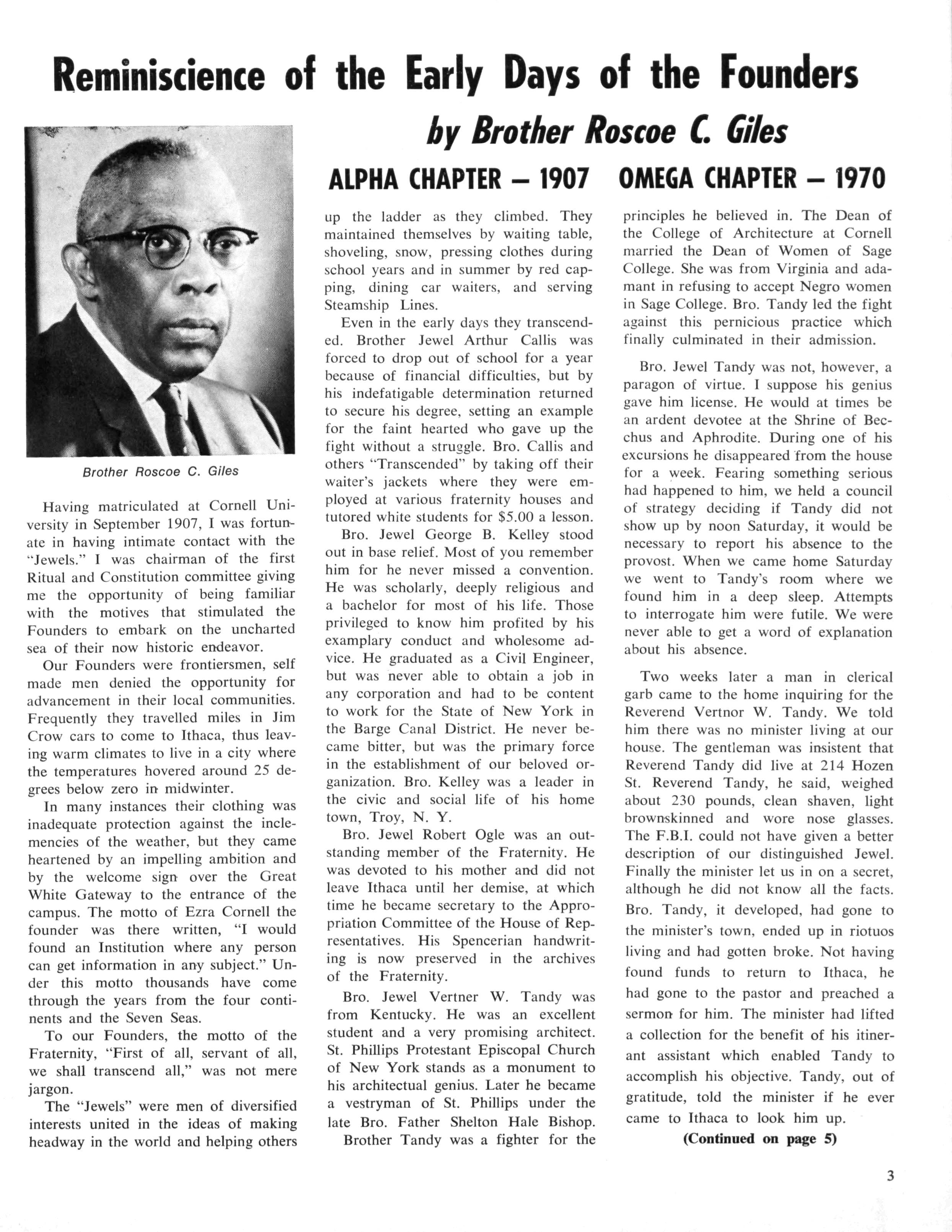 principles he believed in The Dean of the College of Architecture at Cornell married the Dean of Women of Sage College She was from Virginia and adamant in refusing to accept Negro women in Sage College Bro Tandy led the fight against this pernicious practice which finally culminated in their admission