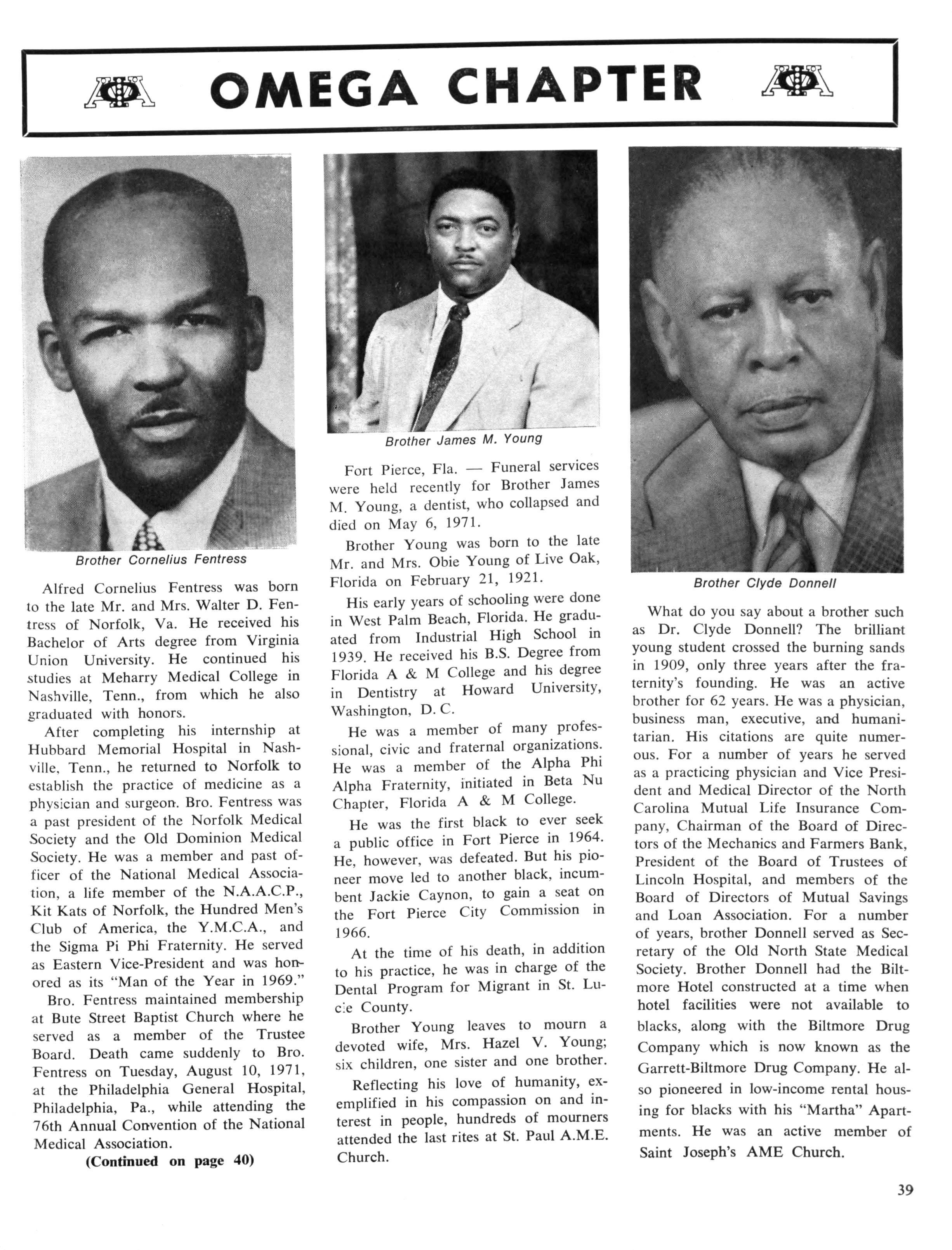 What do you say about a brother such as Dr Clyde Donnell? The brilliant young student crossed the burning sands in 1909, only three years after the fraternity's founding He was an active brother for 62 years He was a physician, business man, executive, and humanitarian His citations are quite numerous. For a number of years he served as a practicing physician and Vice President and Medical Director of the North Carolina Mutual Life Insurance Company, Chairman of the Board of Directors of the Mechanics and Farmers Bank, President of the Board of Trustees of Lincoln Hospital, and members of the Board of Directors of Mutual Savings and Loan Association For a number of years, brother Donnell served as Secretary of the Old North State Medical Society. Brother Donnell had the Biltmore Hotel constructed at a time when hotel facilities were not available to blacks, along with the Biltmore Drug Company which is now known as the Garrett-Biltmore Drug Company He also pioneered in low-income rental housing for blacks with his "Martha" Apartments He was an active member of Saint Joseph's AME Church