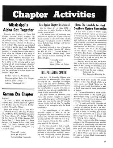 The brothers of Alpha Tau Lambda send greetings to all the brothers in America. An invitation is extended all brothers to participate and share in the wonderful social experience at the state dance for Alpha men The annual state dance will be given at the Tulsa Civic Center