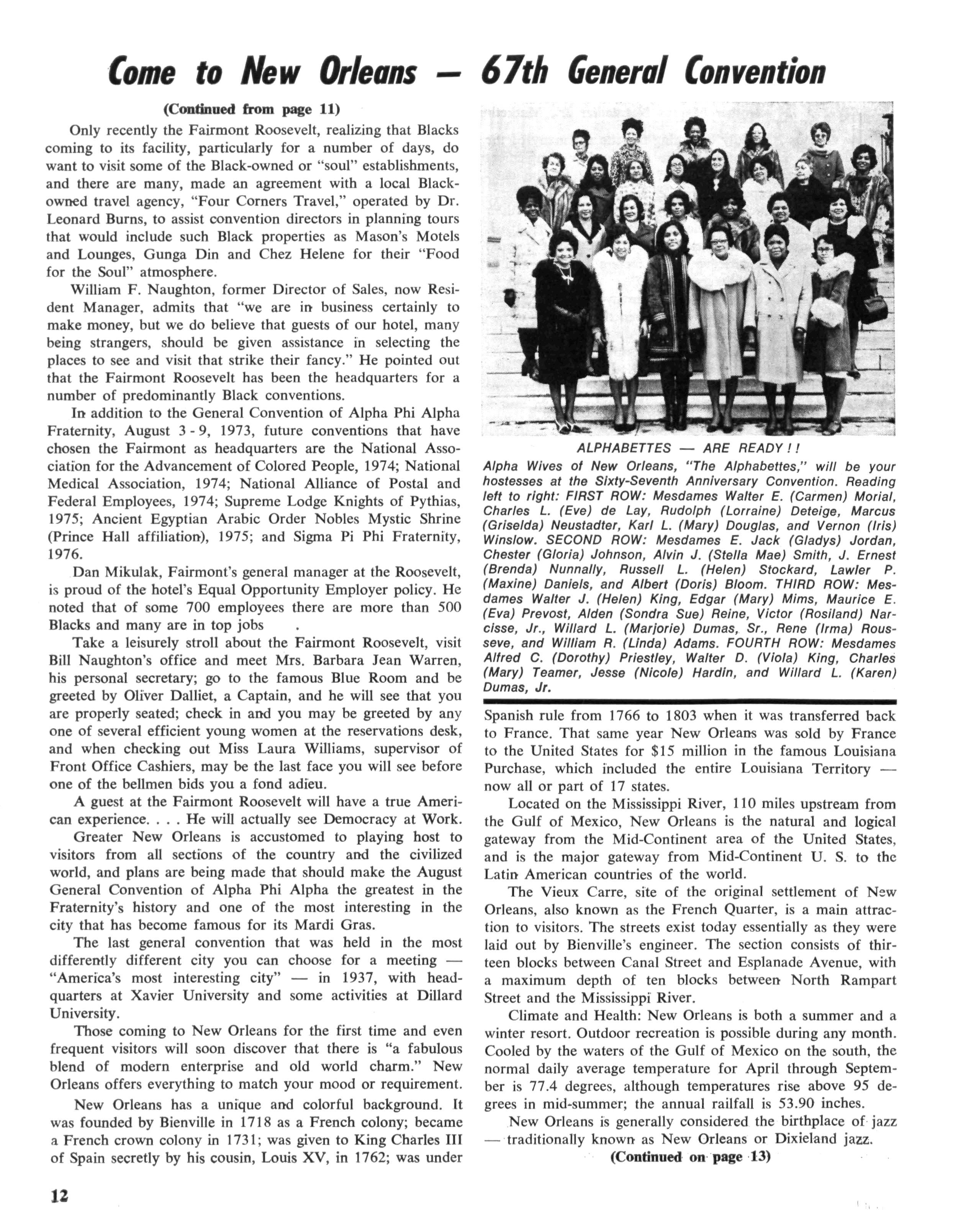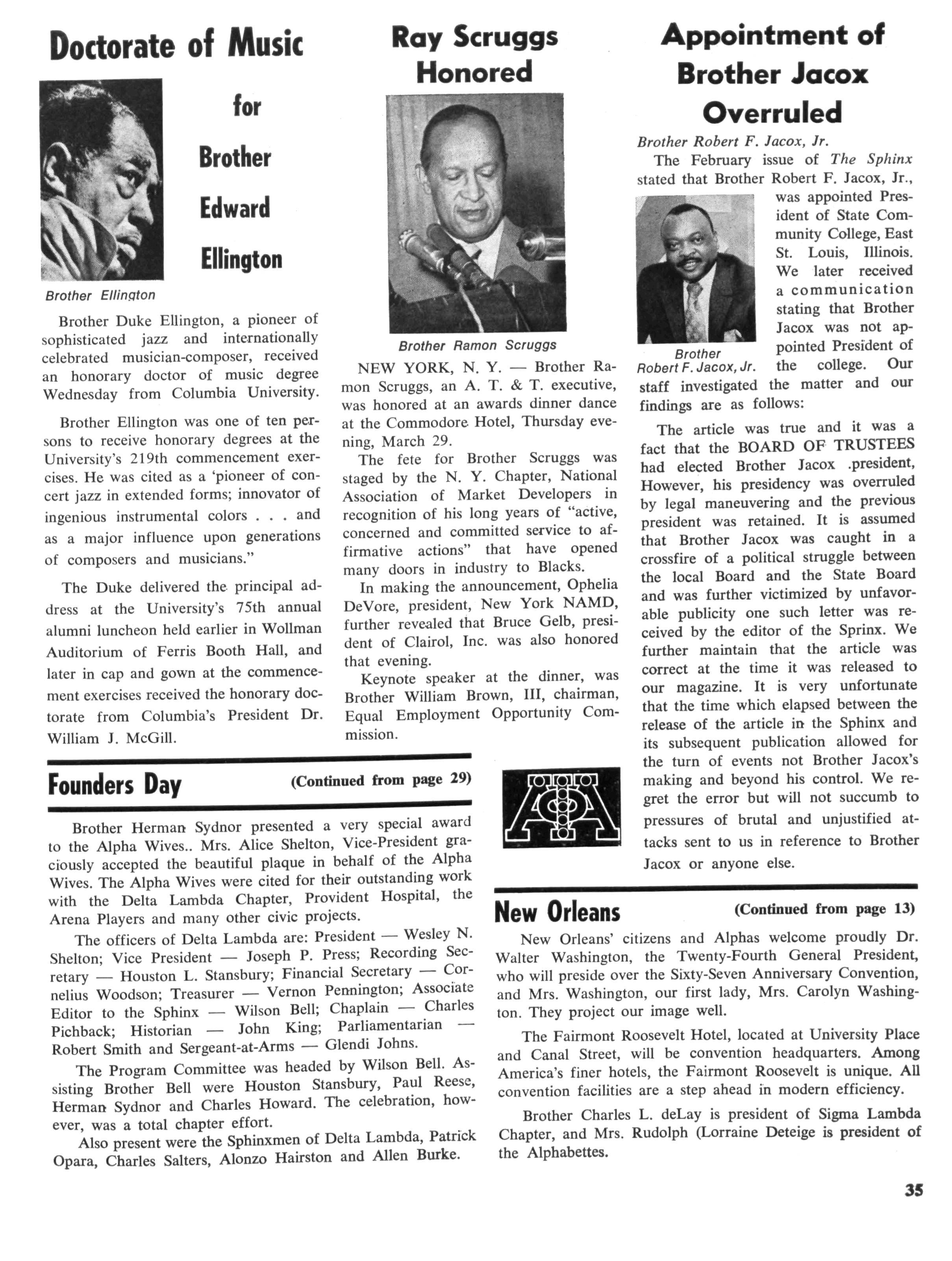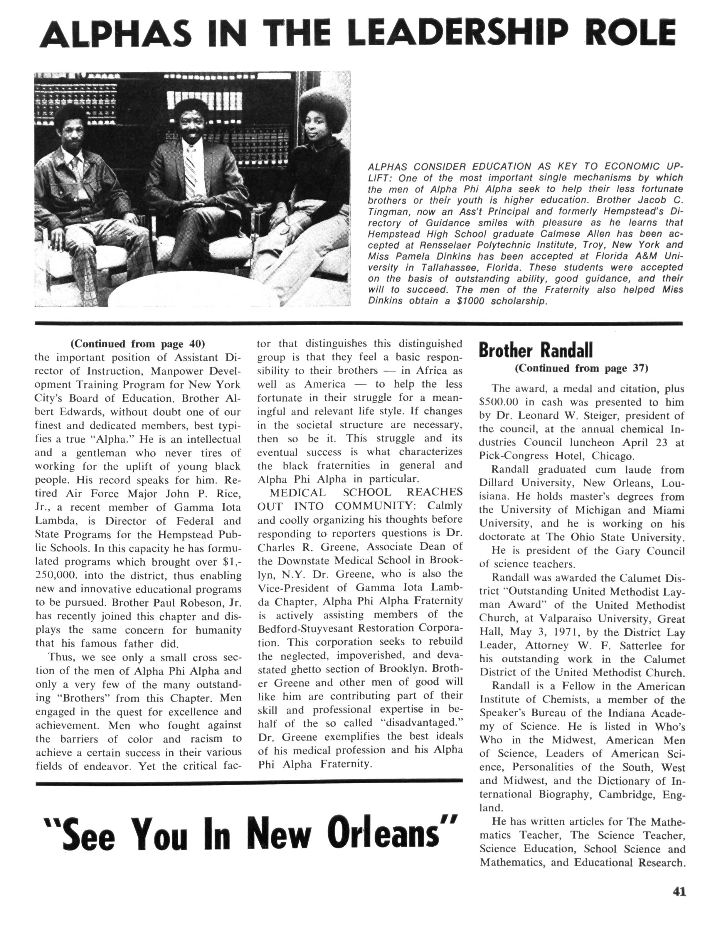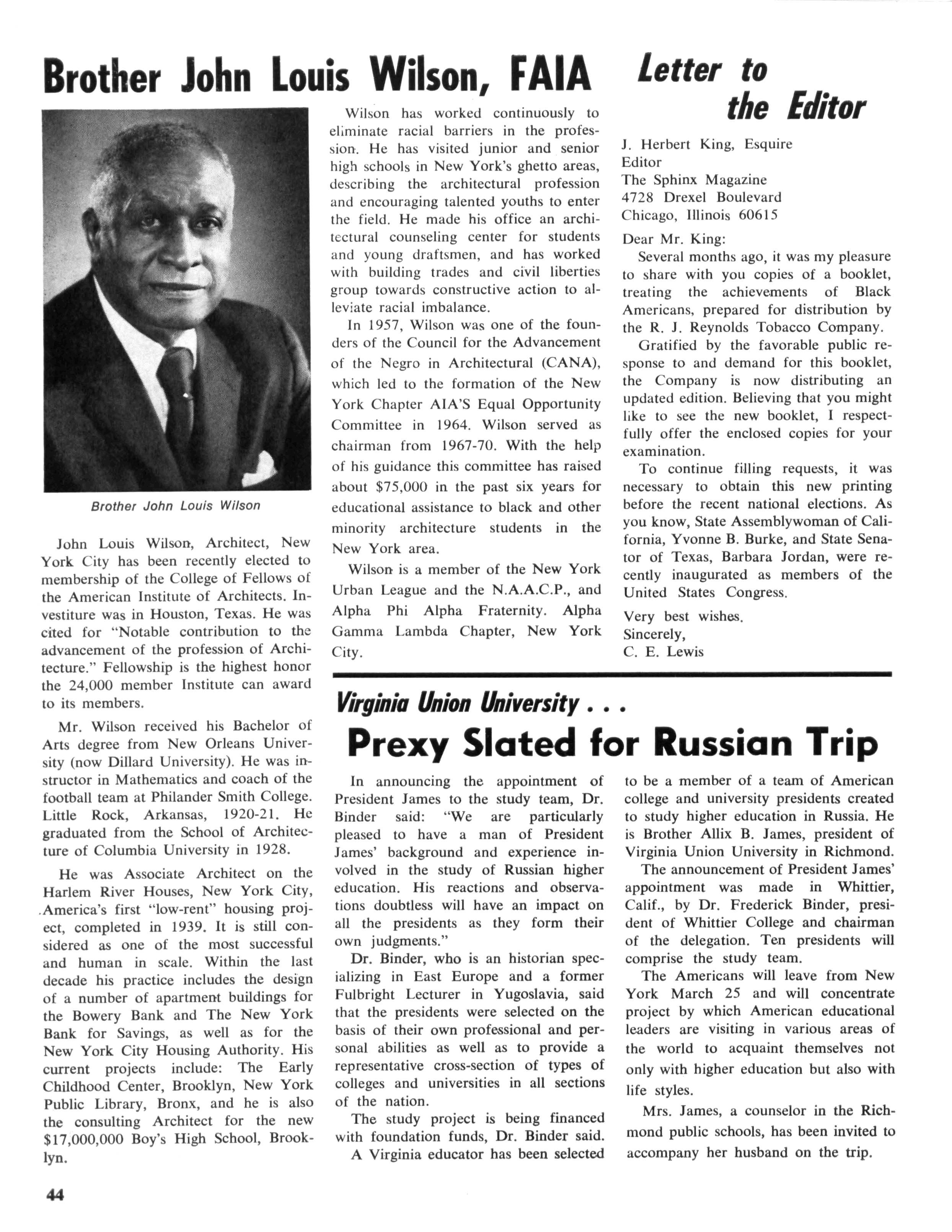 J Herbert King of Chicago, 111., the editor of The Sphinx, the Fraternity's official organ, a member of the national committee, made a visit to New Orleans to make preliminary arrangements for staging and coordinating the program While at Xavier University, he met with Emile J LaBranche, Jr., Director of Student Placement; Rudolph Detiege and James Phillips of Sigma Lambda Chapter, co-chairmen in the local area; Walter E. Morial, convention general chairman; Walter