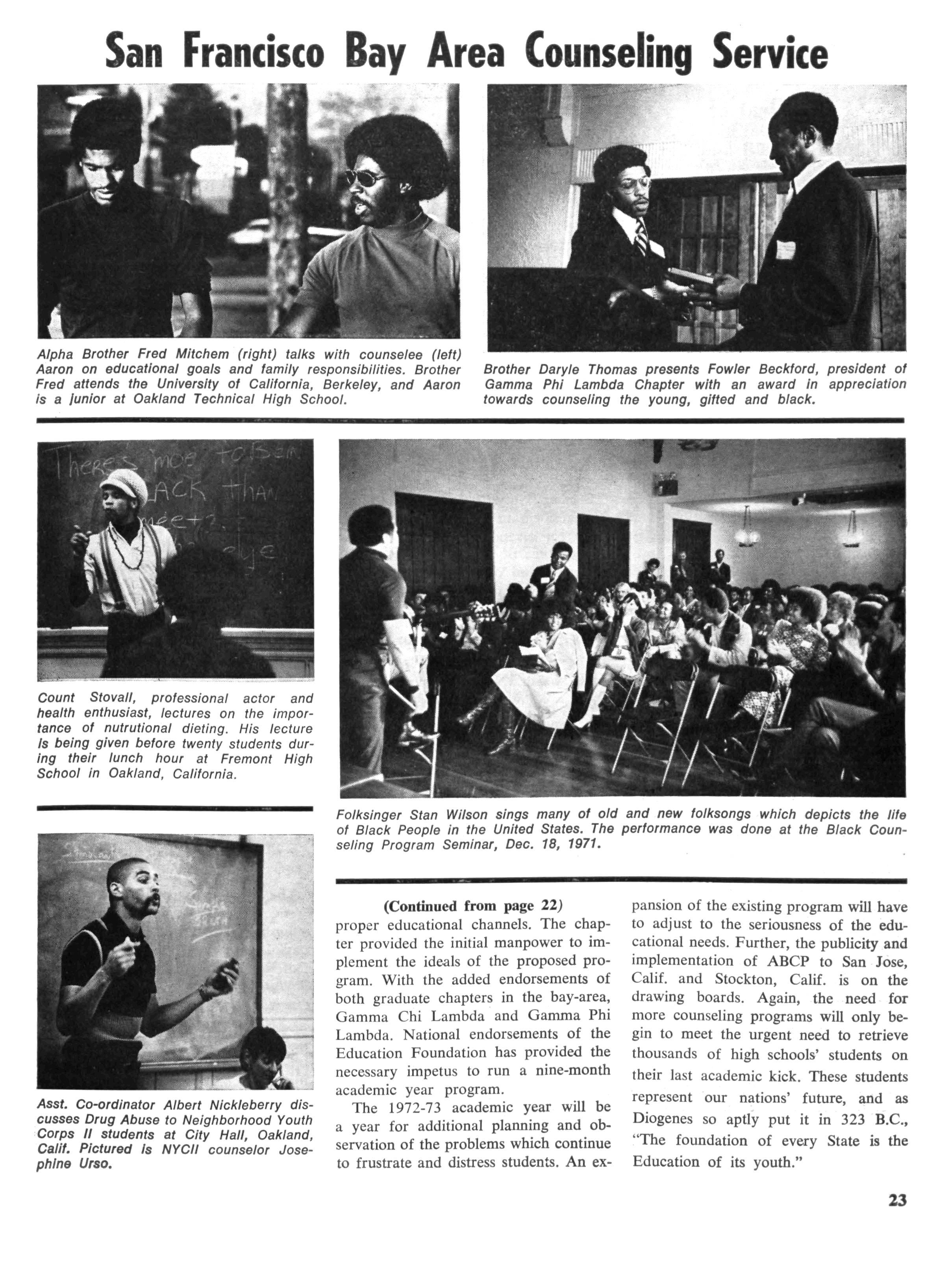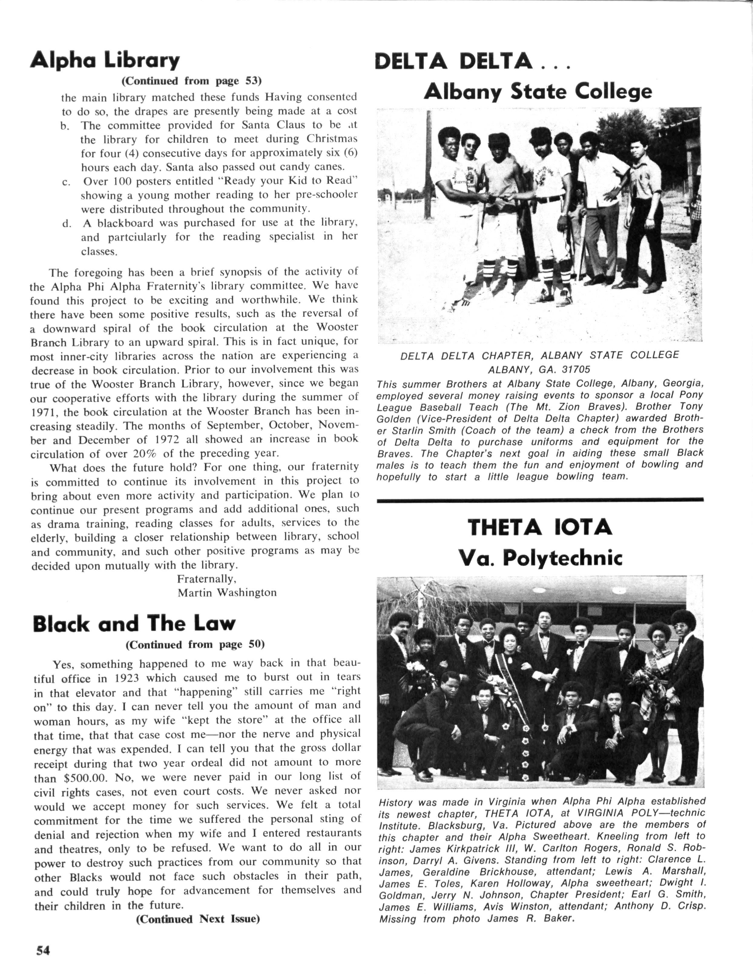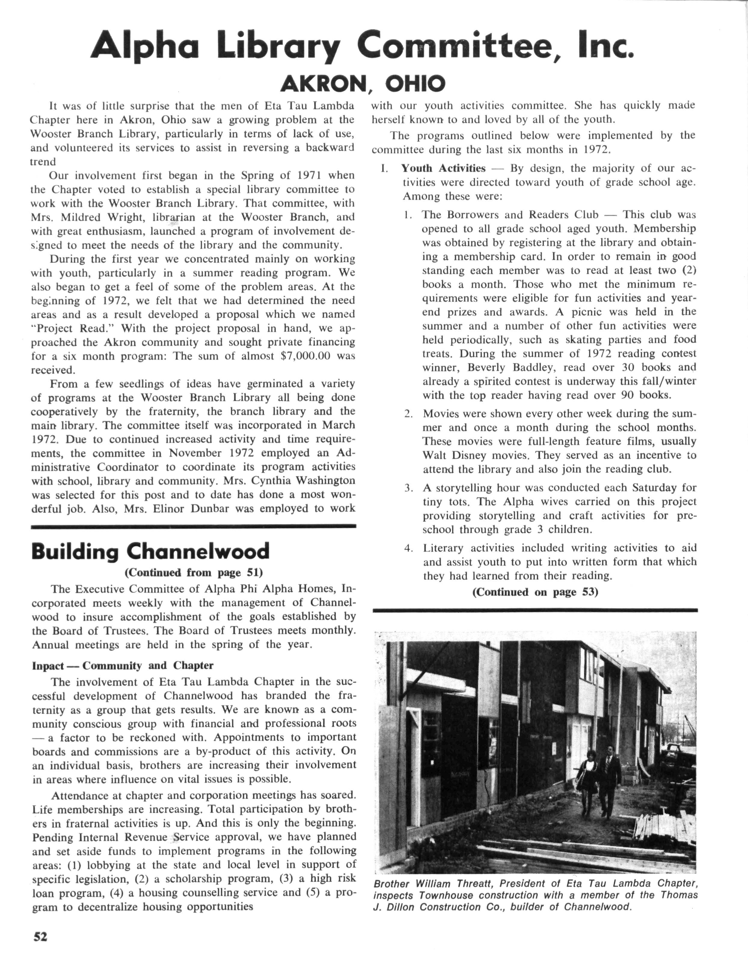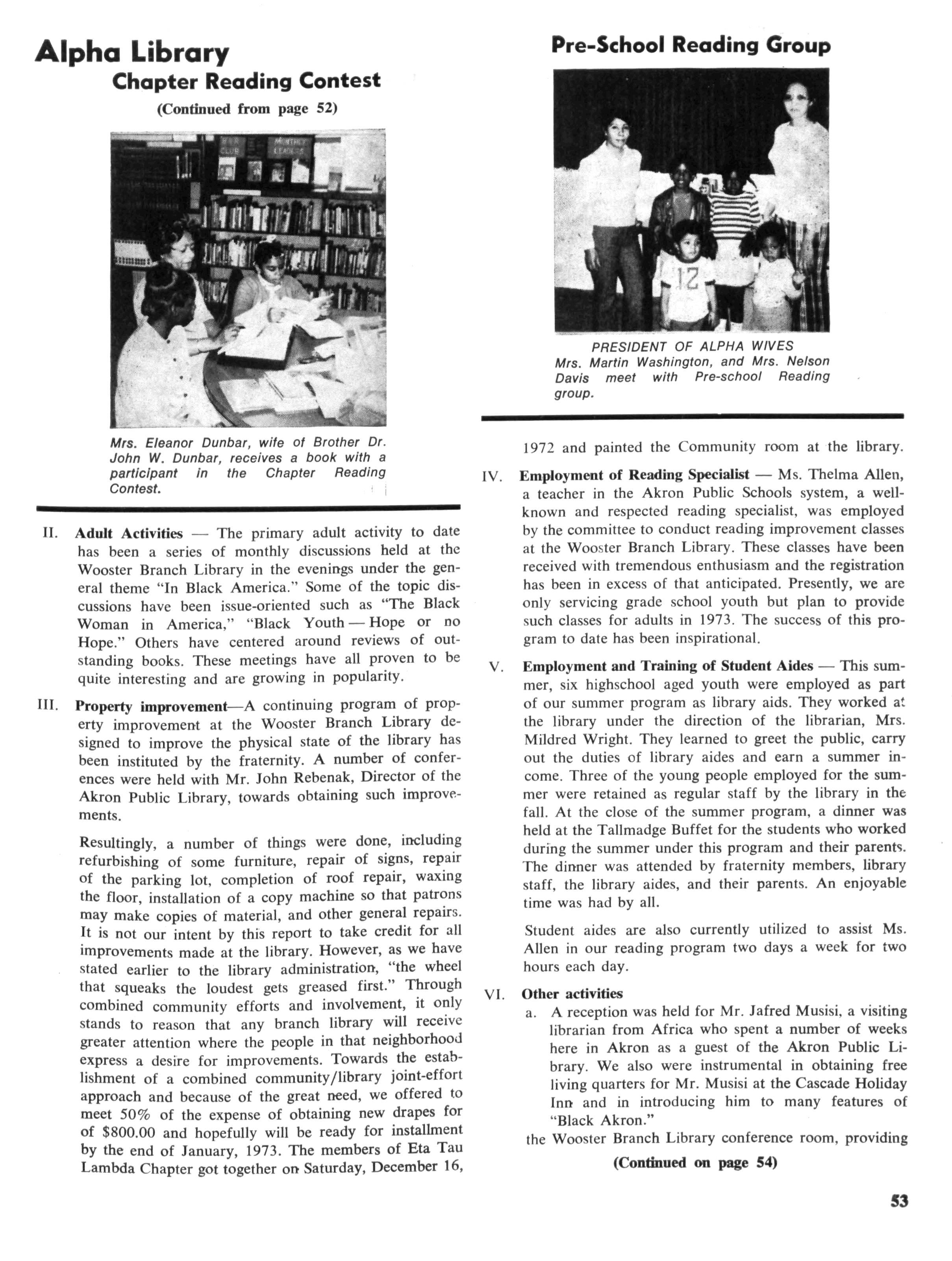 The foregoing has been a brief synopsis of the activity of the Alpha Phi Alpha Fraternity's library committee. We have found this project to be exciting and worthwhile We think there have been some positive results, such as the reversal of a downward spiral of the book circulation at the Wooster Branch Library to an upward spiral. This is in fact unique, for most inner-city libraries across the nation are experiencing a decrease in book circulation Prior to our involvement this was true of the Wooster Branch Library, however, since we began our cooperative efforts with the library during the summer of 1971, the book circulation at the Wooster Branch has been increasing steadily. The months of September, October, November and December of 1972 all showed an increase in book circulation of over 20% of the preceding year
