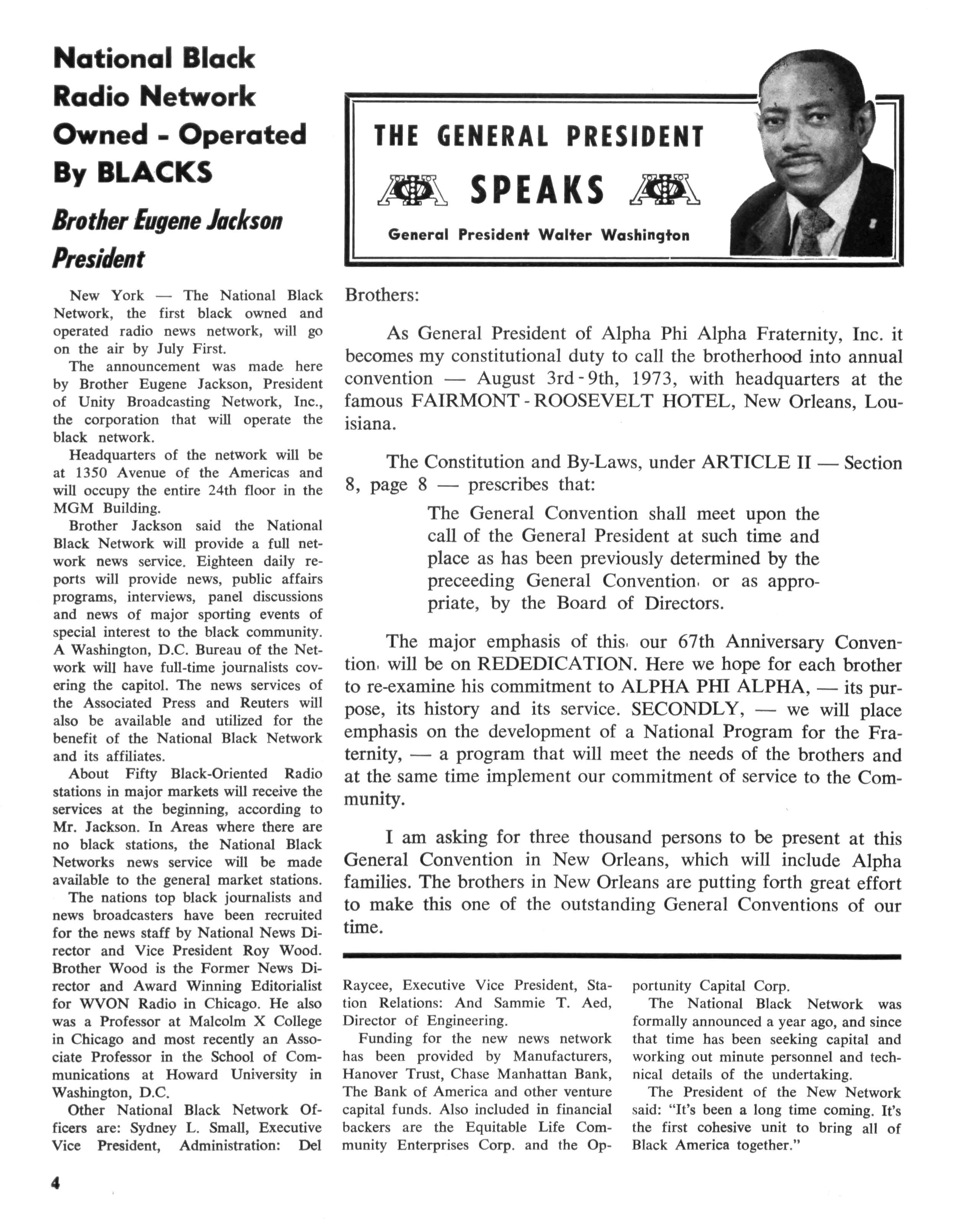 Brother Jackson said the National Black Network will provide a full network news service. Eighteen daily reports will provide news, public affairs programs, interviews, panel discussions and news of major sporting events of special interest to the black community. A Washington, D.C Bureau of the Network will have full-time journalists covering the capitol. The news services of the Associated Press and Reuters will also be available and utilized for the benefit of the National Black Network and its affiliates.