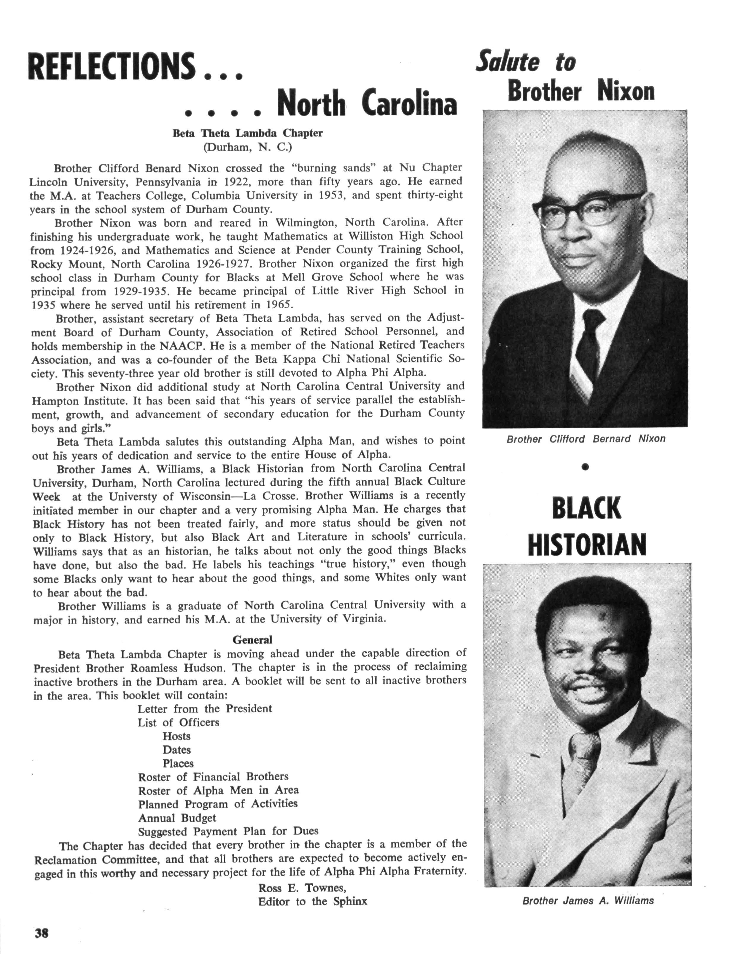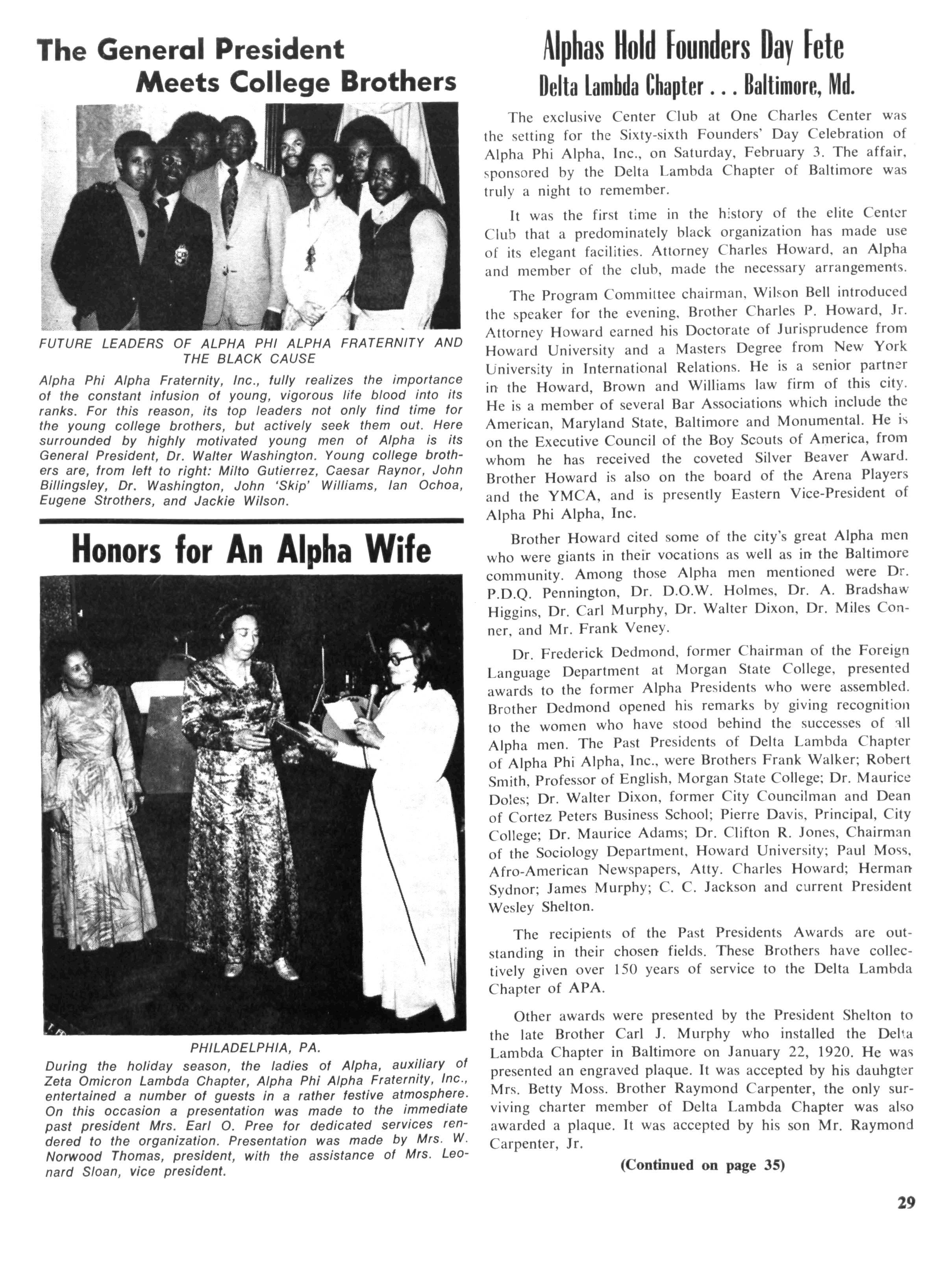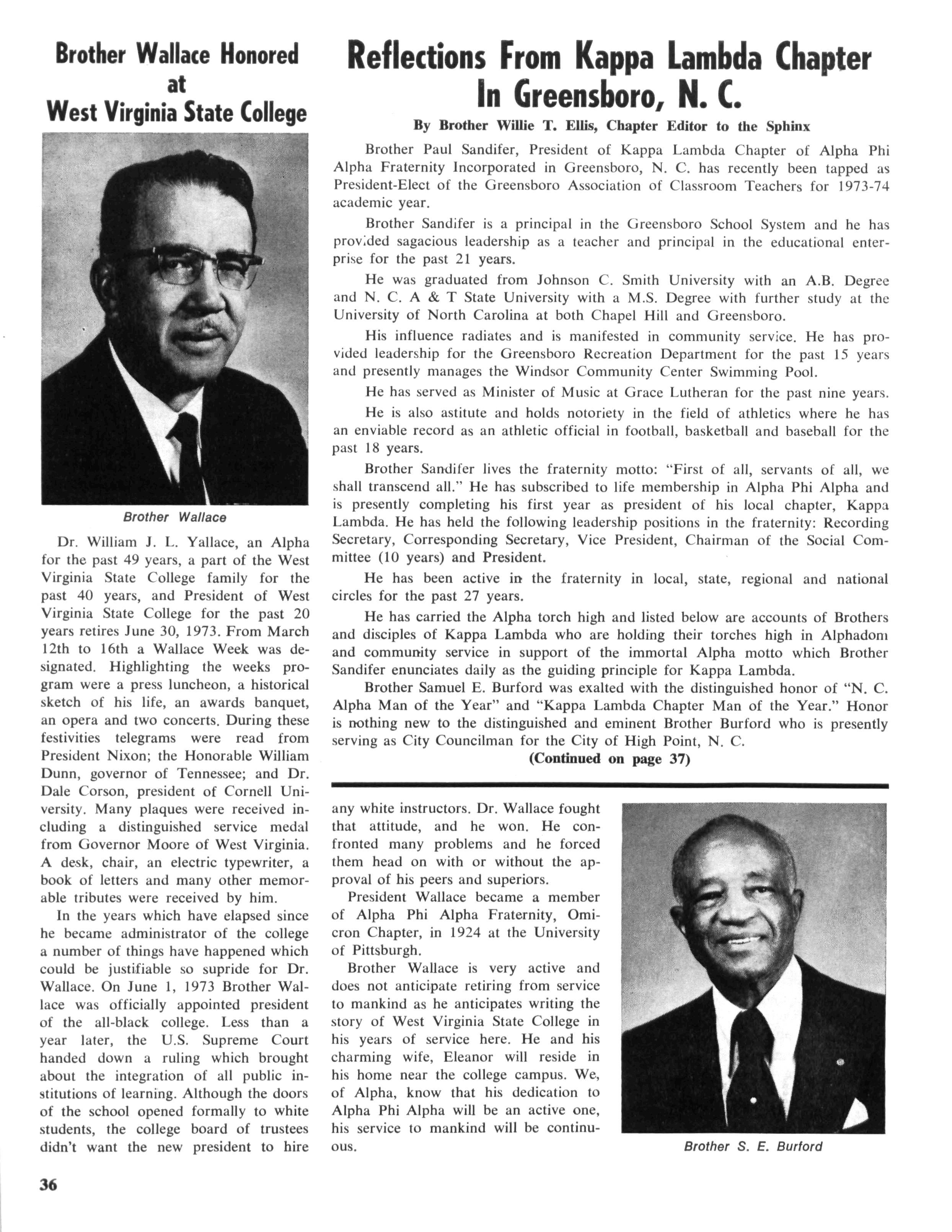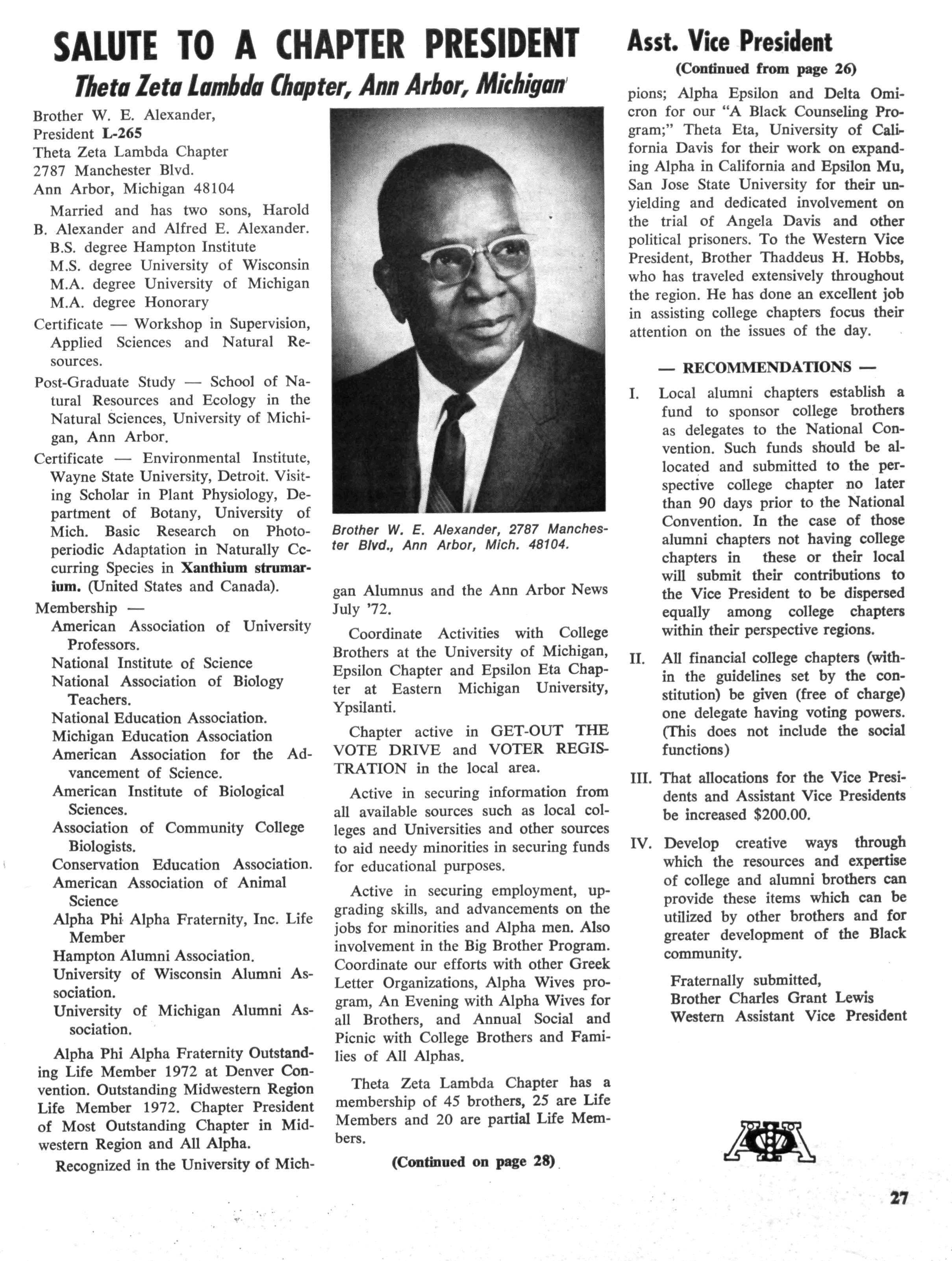 At the time of his death he was a member of the Board of Directors of Norfolk State College, also professor emeritus of this school. He was a fifty year member of Alpha and in recent years was named Alpha Man of The Year by The Eastern Region. In his last efforts to serve his community and his fraternity he directed an attempt by the Norfolk chapter to obtain a two million dollar low-cost housing grant