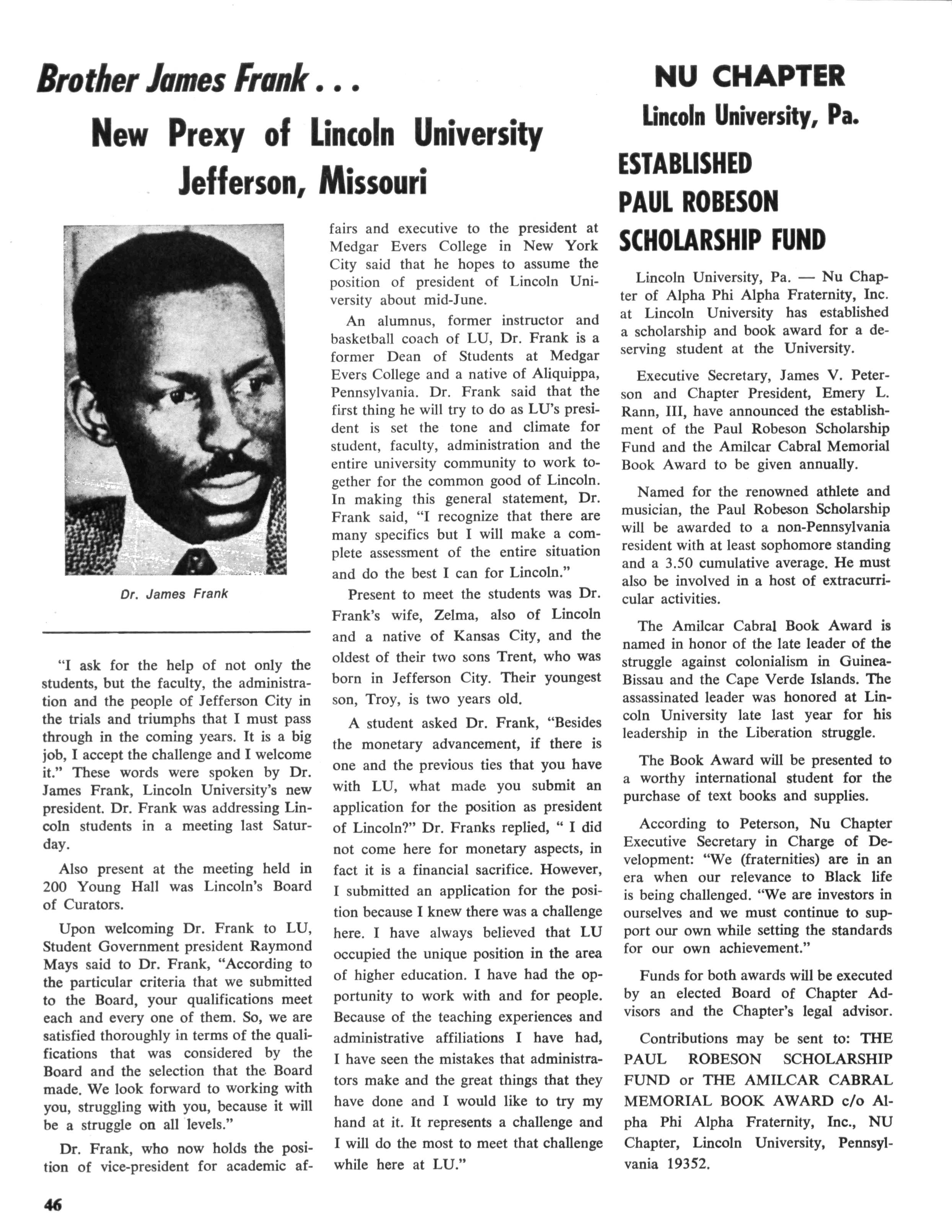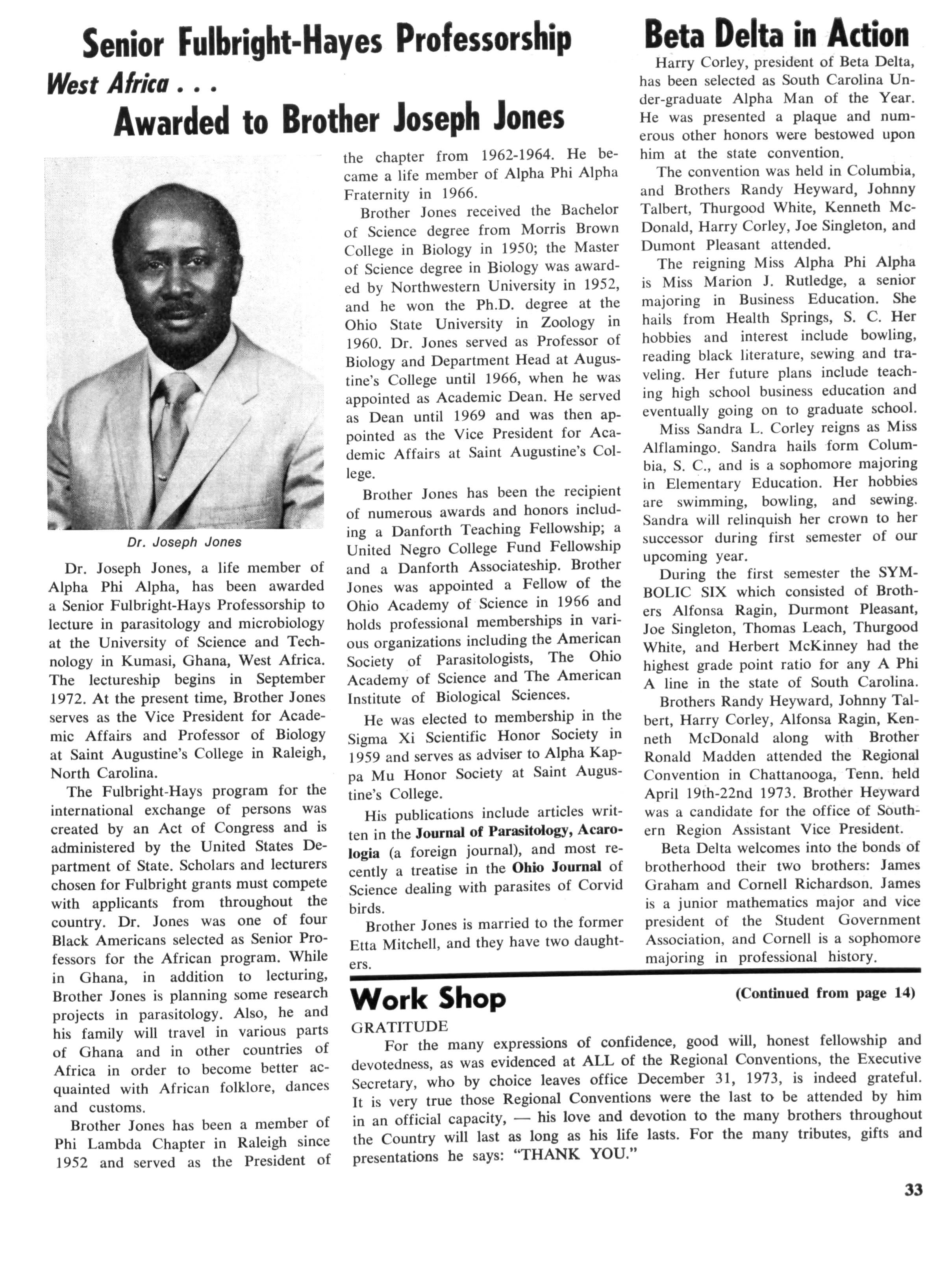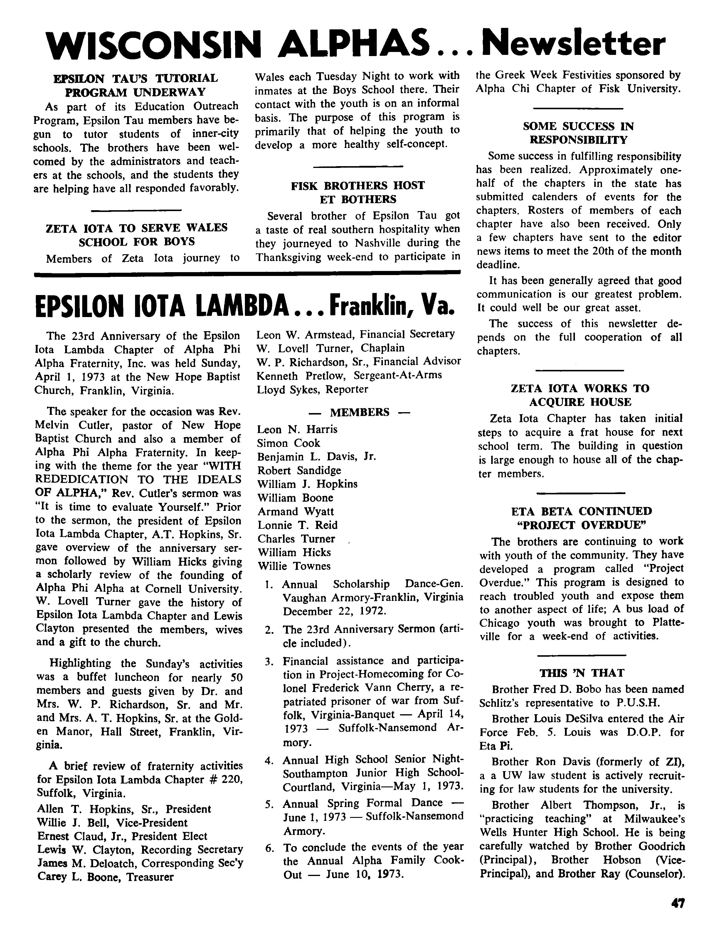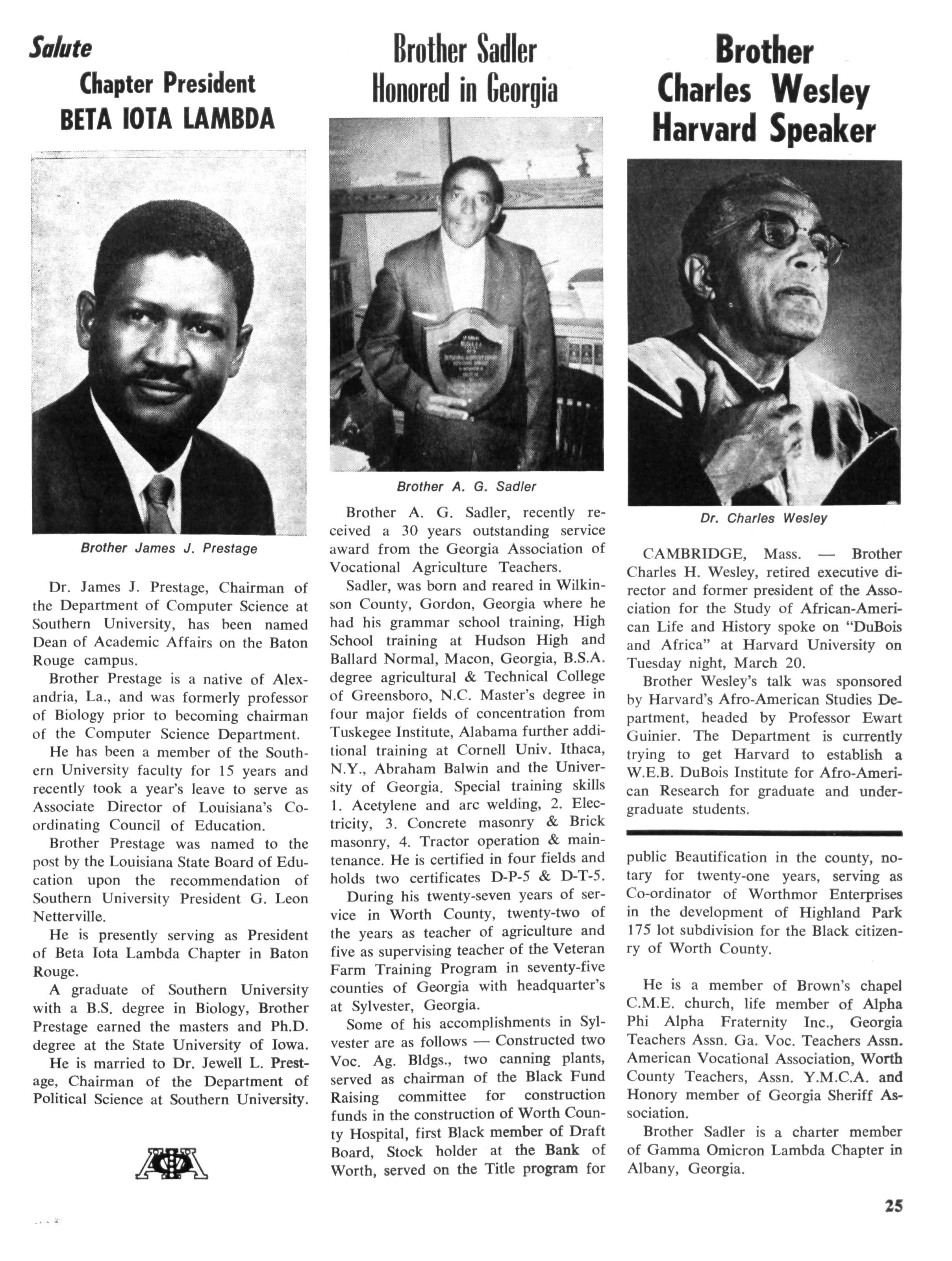 At the time of his death he was a member of the Board of Directors of Norfolk State College, also professor emeritus of this school. He was a fifty year member of Alpha and in recent years was named Alpha Man of The Year by The Eastern Region. In his last efforts to serve his community and his fraternity he directed an attempt by the Norfolk chapter to obtain a two million dollar low-cost housing grant