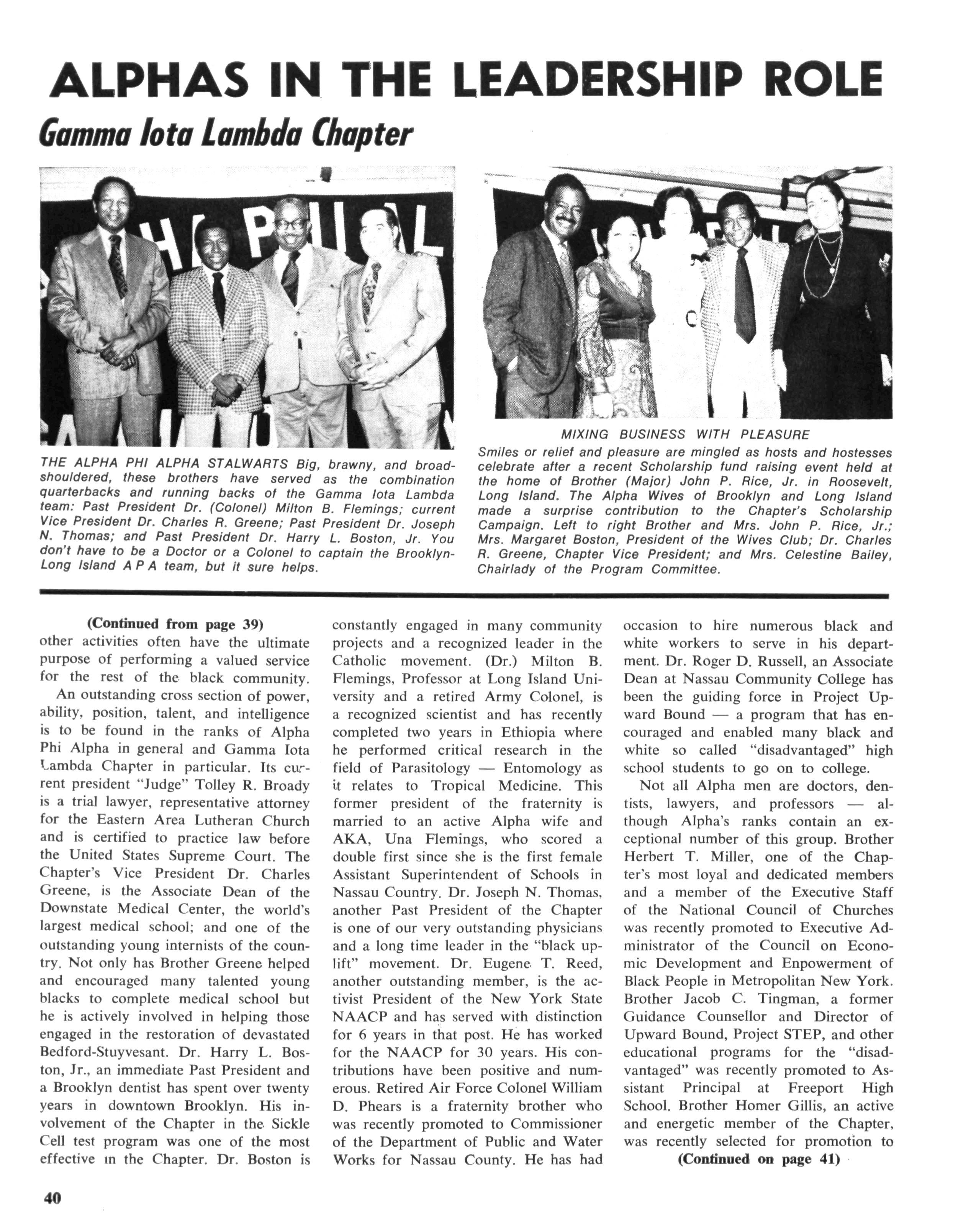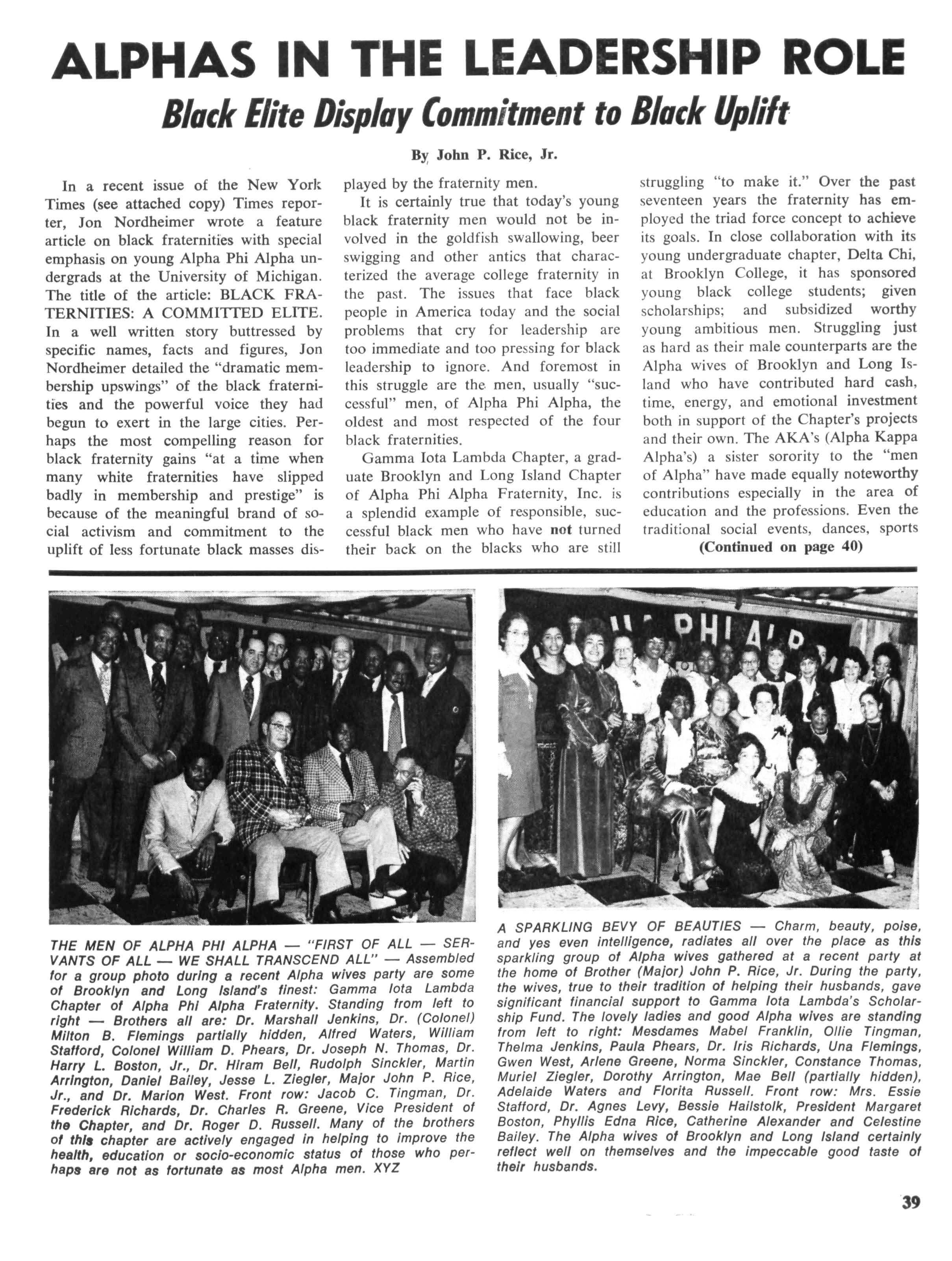 History was made in Virginia when Alpha Phi Alpha established its newest chapter, THETA IOTA, at VIRGINIA POLY—technic Institute. Blacksburg, Va. Pictured above are the members of this chapter and their Alpha Sweetheart. Kneeling from left to right: James Kirkpatrick III, W. Carlton Rogers, Ronald S. Robinson, Darryl A. Givens. Standing from left to right: Clarence L. James, Geraldine Brickhouse, attendant; Lewis A. Marshall, James E. Toles, Karen Holloway, Alpha sweetheart; Dwight I. Goldman, Jerry N. Johnson, Chapter President; Earl G. Smith, James E. Williams, Avis Winston, attendant; Anthony D. Crisp. Missing from photo James R. Baker.