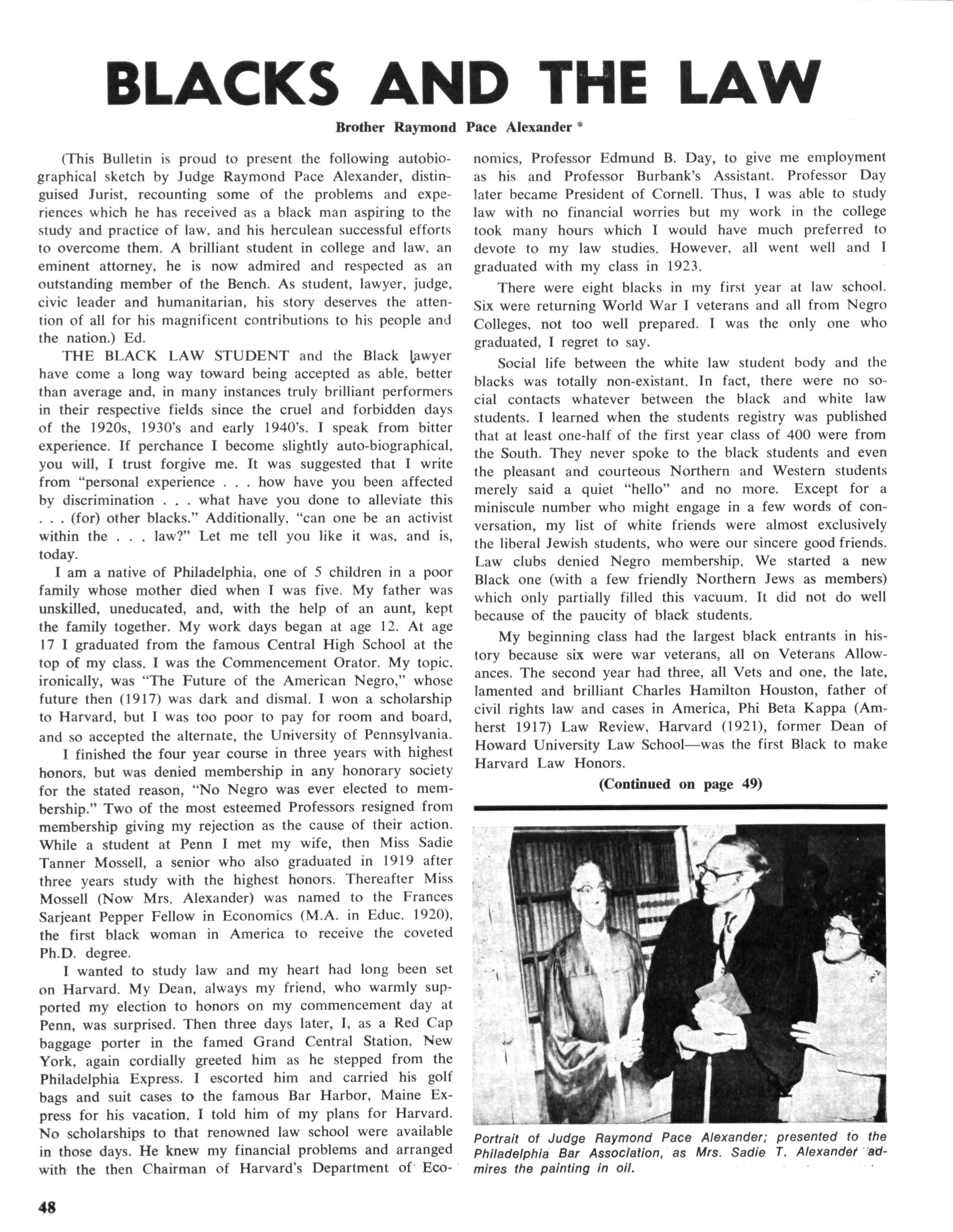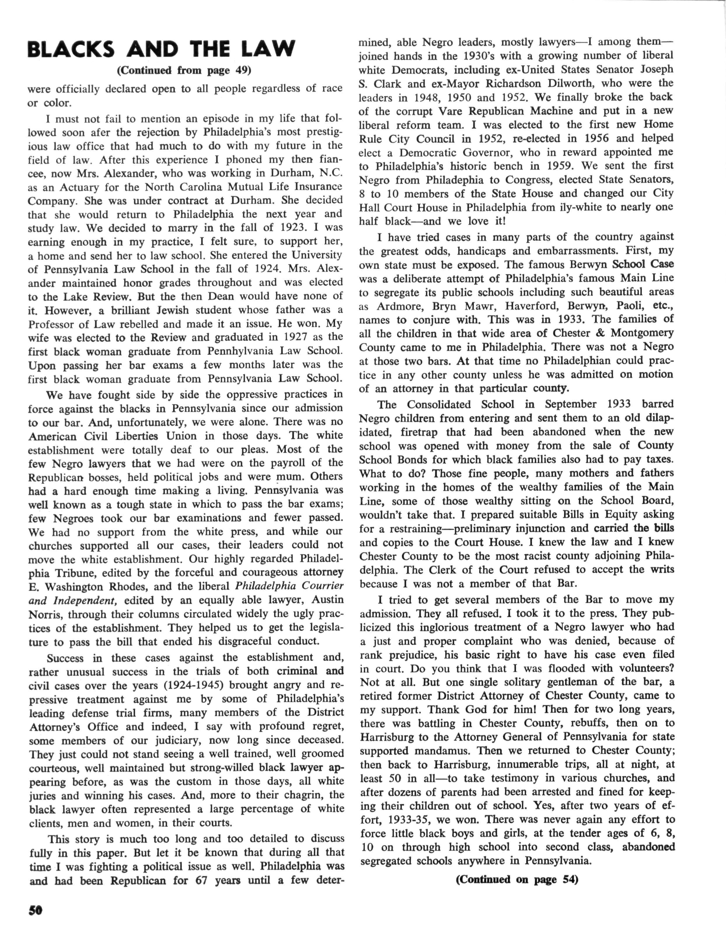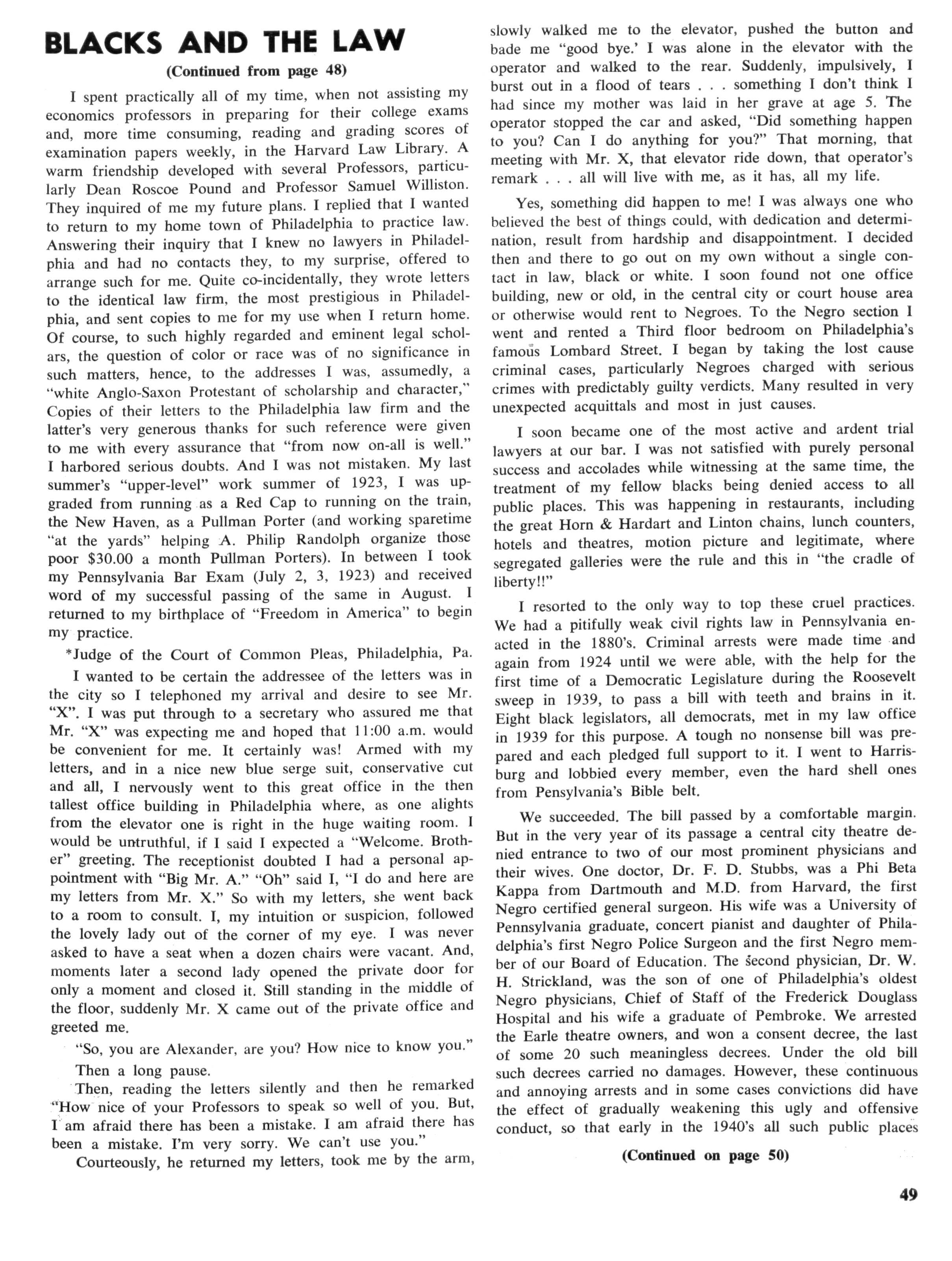 Yes, something happened to me way back in that beautiful office in 1923 which caused me to burst out in tears in that elevator and that "happening" still carries me "right on" to this day I can never tell you the amount of man and woman hours, as my wife "kept the store" at the office all that time, that that case cost me—nor the nerve and physical energy that was expended I can tell you that the gross dollar receipt during that two year ordeal did not amount to more than $500.00 No, we were never paid in our long list of civil rights cases, not even court costs We never asked nor would we accept money for such services. We felt a total commitment for the time we suffered the personal sting of denial and rejection when my wife and I entered restaurants and theatres, only to be refused We want to do all in our power to destroy such practices from our community so that other Blacks would not face such obstacles in their path, and could truly hope for advancement for themselves and their children in the future.