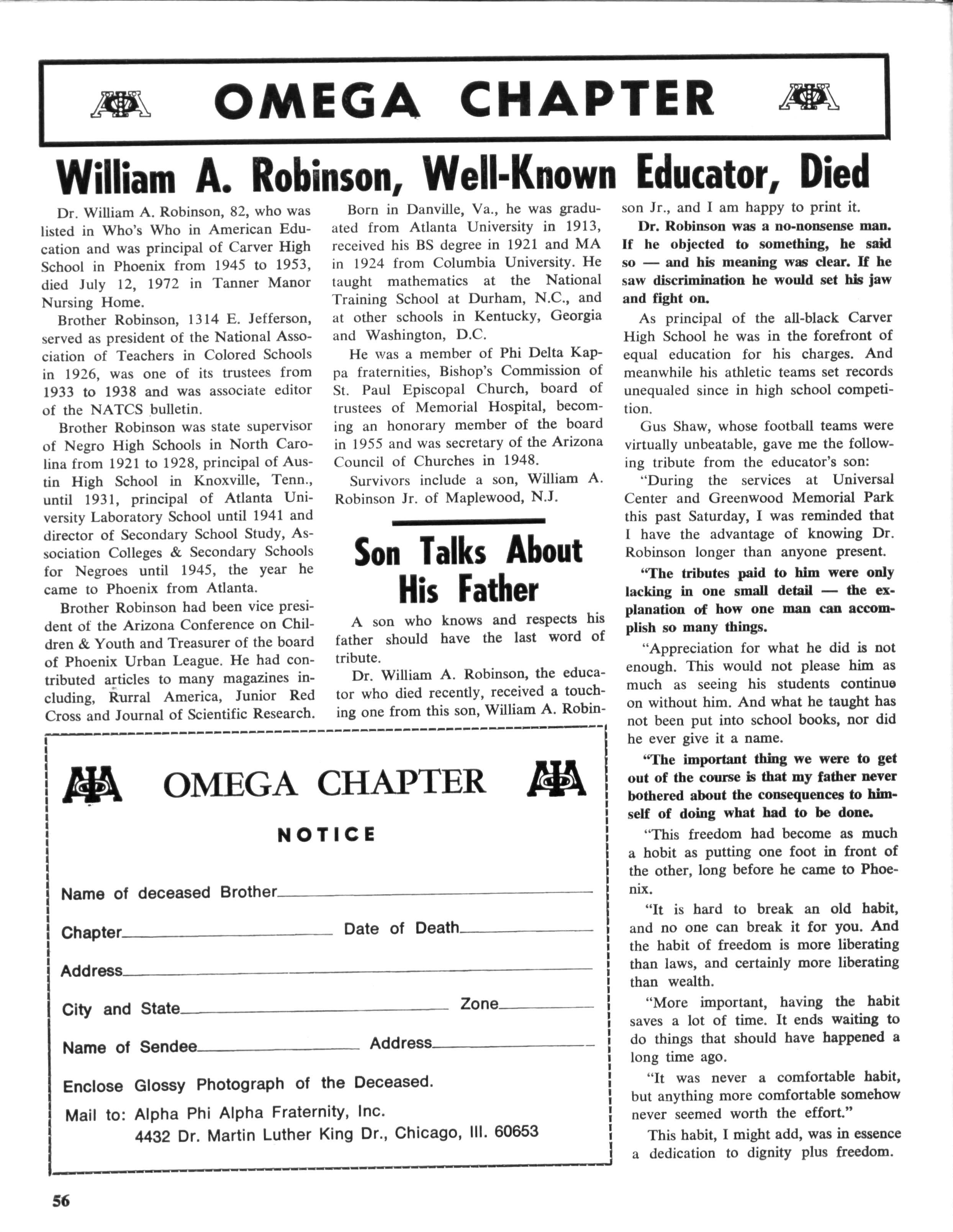 Dr William A Robinson, 82, who was listed in Who's Who in American Education and was principal of Carver High School in Phoenix from 1945 to 1953, died July 12, 1972 in Tanner Manor Nursing Home.