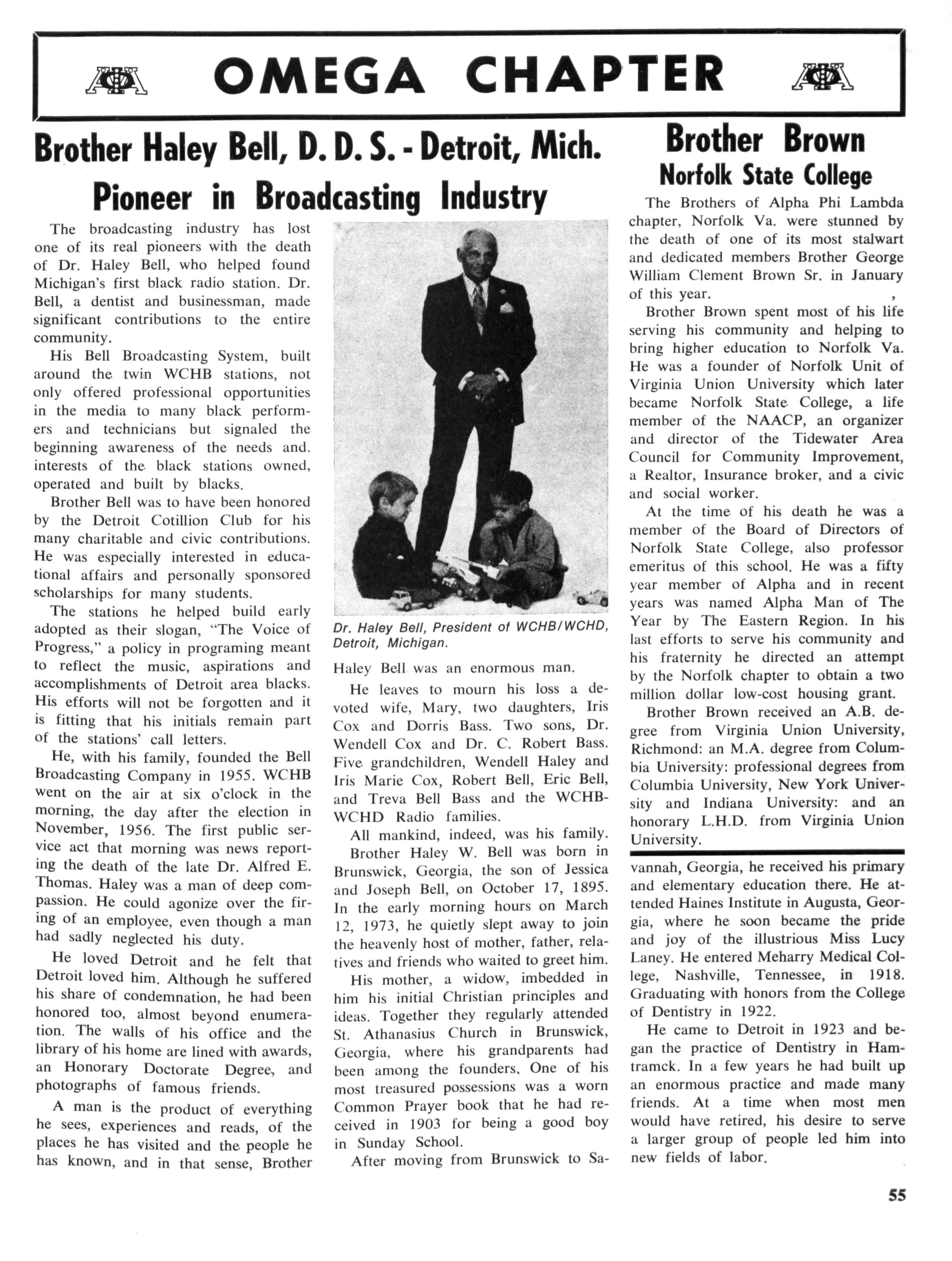 He, with his family, founded the Bell Broadcasting Company in 1955. WCHB went on the air at six o'clock in the morning, the day after the election in November, 1956 The first public service act that morning was news reporting the death of the late Dr. Alfred E. Thomas Haley was a man of deep compassion He could agonize over the firing of an employee, even though a man had sadly neglected his duty