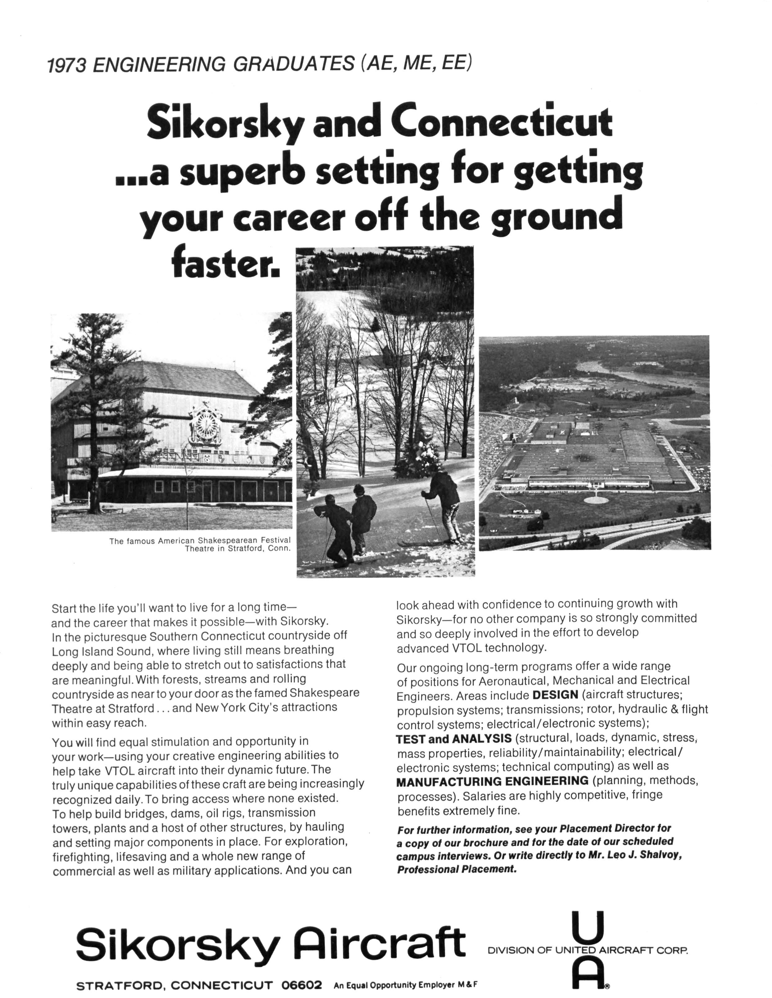 Start the life you'll want to live for a long time— and the career that makes it possible—with Sikorsky In the picturesque Southern Connecticut countryside off Long Island Sound, where living still means breathing deeply and being able to stretch out to satisfactions that are meaningful With forests, streams and rolling countryside as near to your door asthe famed Shakespeare Theatre at Stratford and New York City's attractions within easy reach.