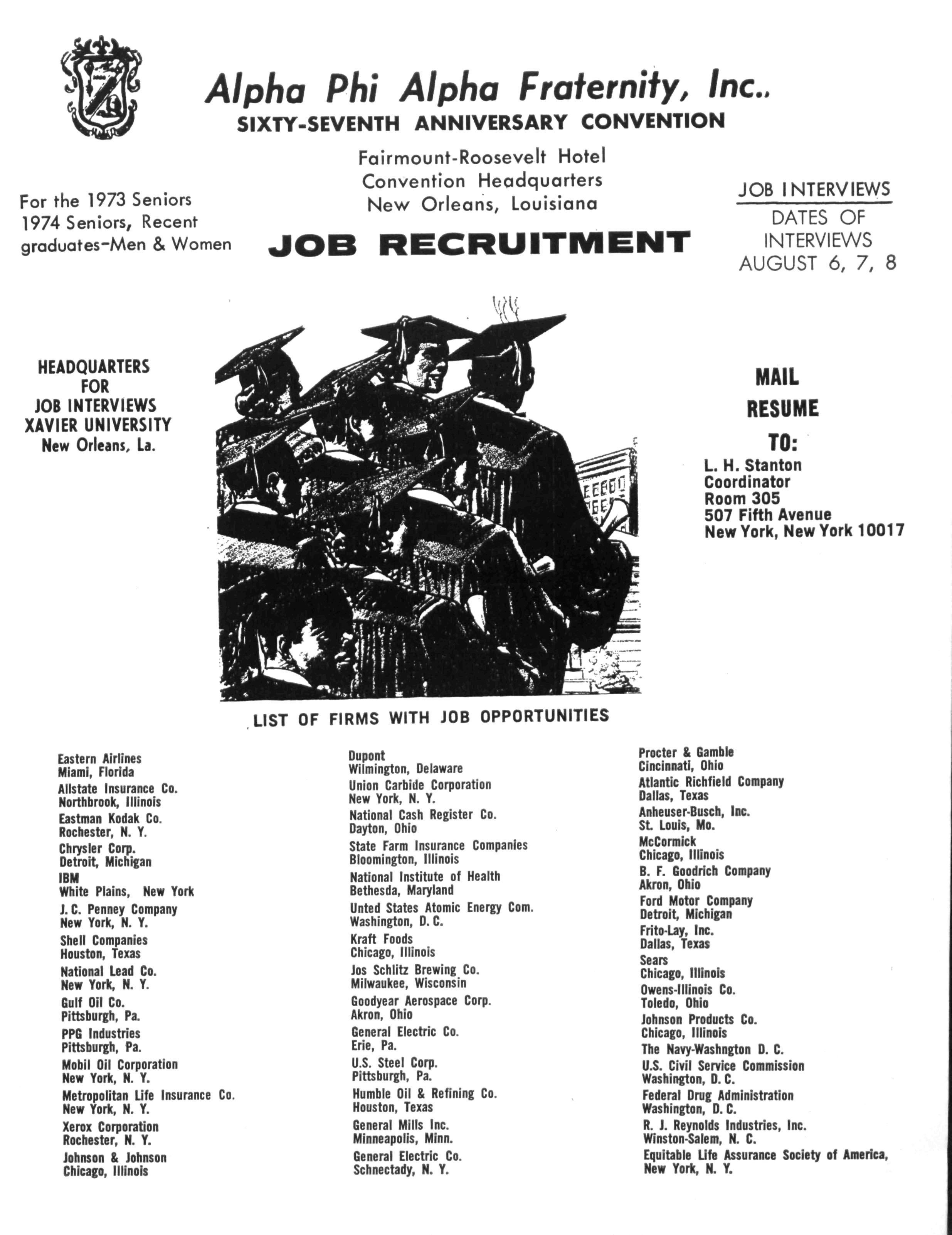 New Orleans, La. — Among the events of the 67th anniversary convention of Alpha Phi Alpha Fraternity, Inc., August 3 - 9, will be the Job Placement and Recruitment Interviews that will be conducted by more than sixty major employers representing business, industry, the professions, labor and government, including the various branches of the armed forces