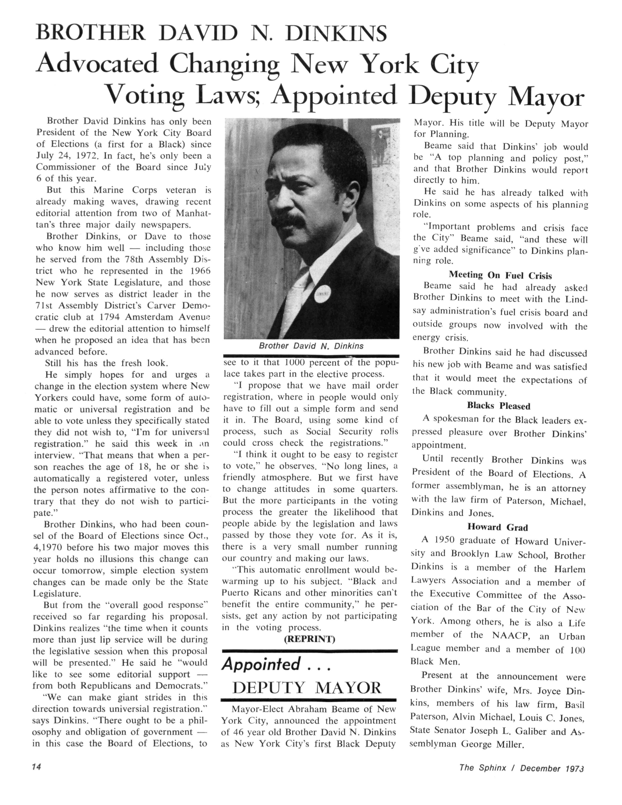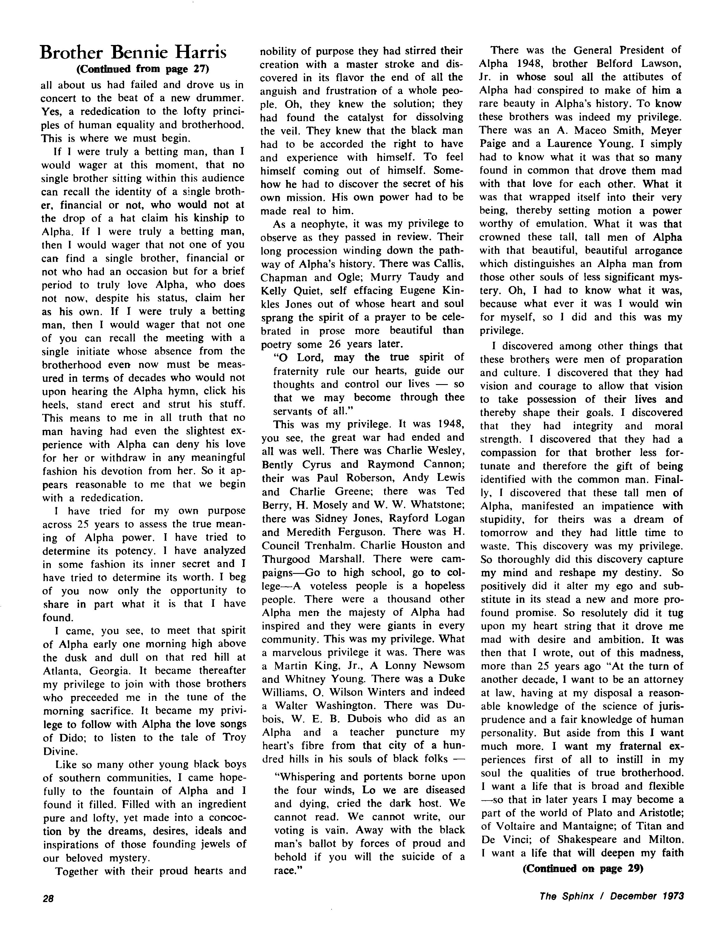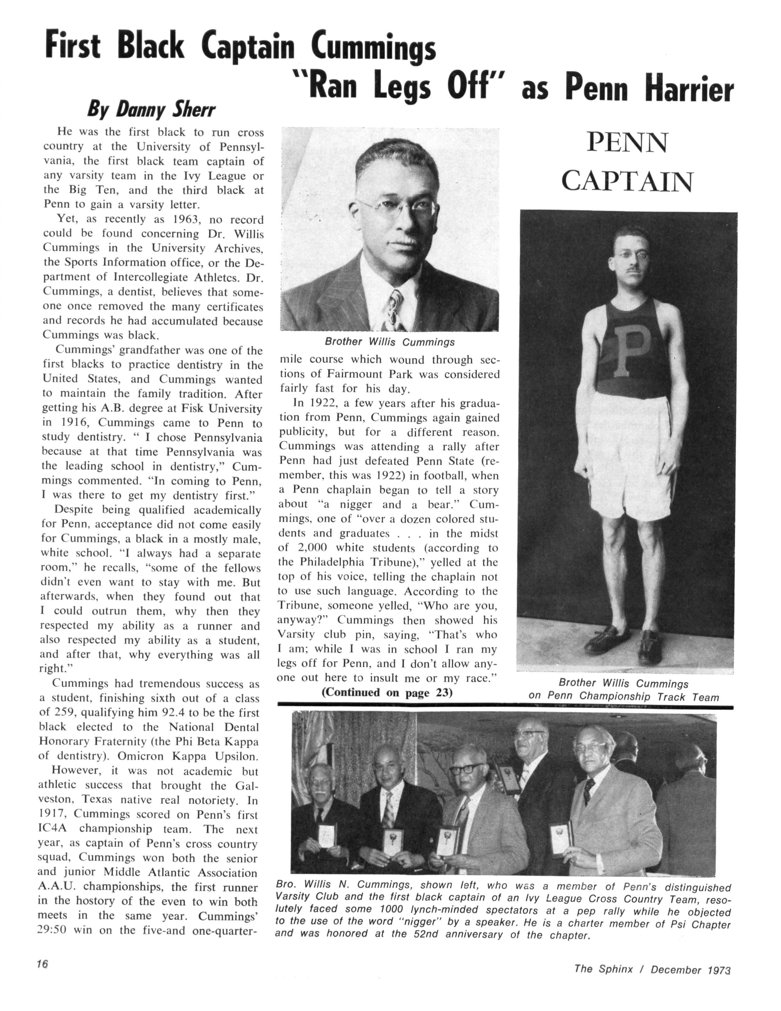 Enclosed is a copy of an article published last month in the daily paper of the University of Pennsylvania, the school I graduated from Several of our brothers here in New York and Philadelphia thought I should send you a copy As they thought a notice of it in the Sphinx would be of interest to all of our brothers, especially the younger ones who are interested in Black History The article makes known historical facts that very few people know about. Hope it will interest you Merry Christmas and Happy New Year. Thanks and stay heakhy, I am Yours fraternally, Brother Willis N Cummings