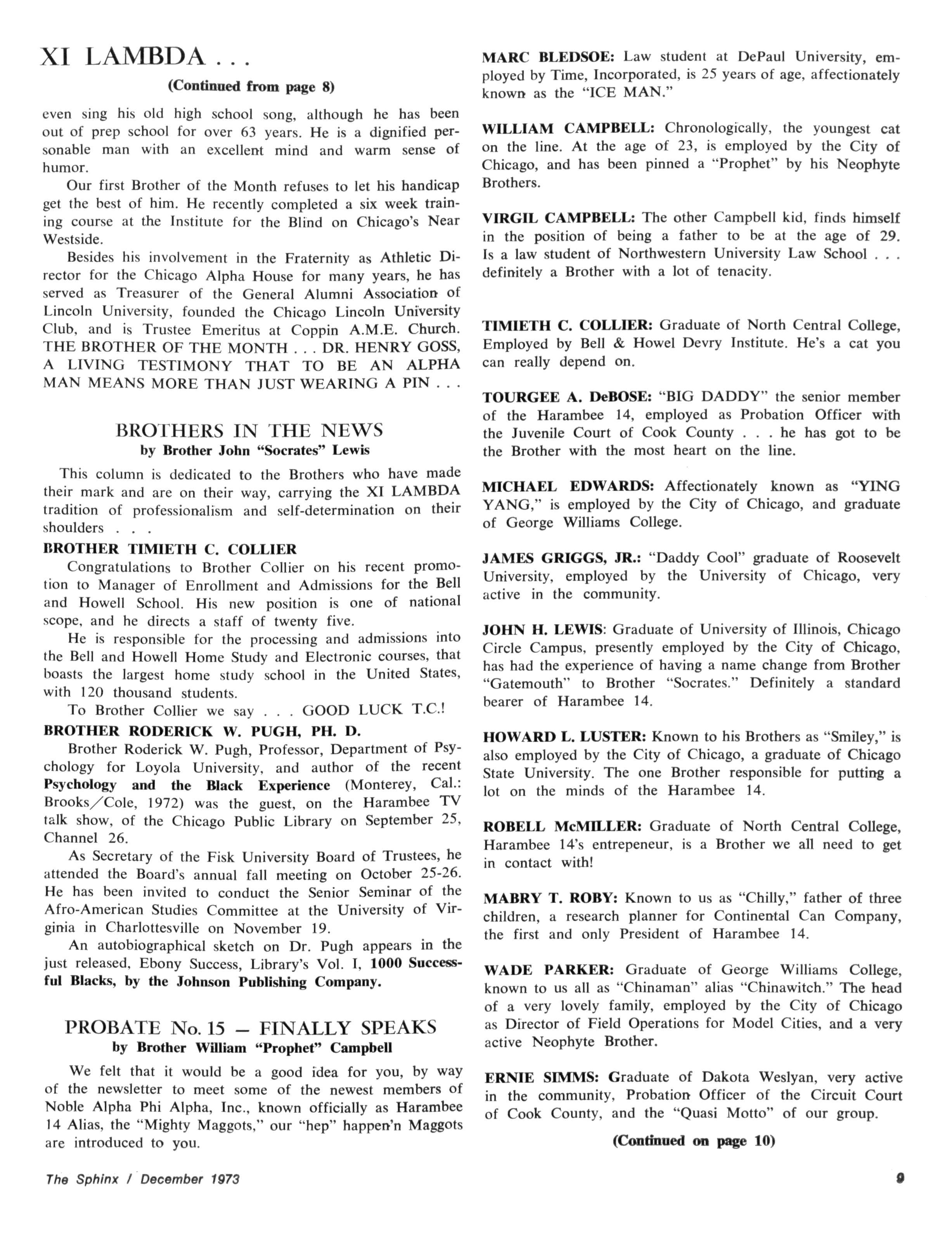 The Sphinx is the official magazine of the Alpha Phi Alpha Fraternity, Inc., 4432 Dr Martin Luther King Dr., Chicago, III., with editorial offices at 4728 Drexel Blvd., Chicago, III 60615 Published four times a year: February, May, October and December Address all editorial mail to 4728 Drexel Blvd., Chicago, III 60615 Change of Address: Send both addresses to Alpha Phi Alpha Fraternity, 4432 Dr Martin Luther King Drive, Chicago, III Manuscripts or art submitted to The Sphinx should be accompained by addressed envelopes and return postage Editor assumes no responsibility for return of unsolicited manuscripts or art