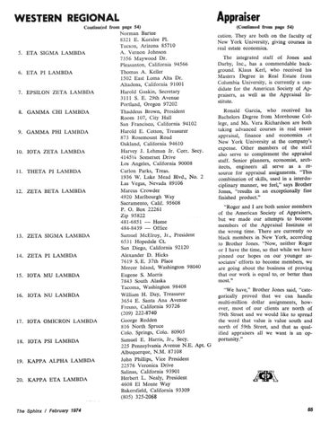 Continued from page 54) Norman Bartee 8321 E. Koralee PI. Tucson, Arizona 85710 A. Vernon Johnson 5. ETA SIGMA LAMBDA 7356 Maywood Dr. Pleasanton, California 94566 Thomas A. Keller 6. ETA PI LAMBDA 1502 East Loma Alta Dr. Altadena, California 91001 Harold Gaskin, Secretary 7. EPSILON ZETA LAMBDA 3111 S. E. 29th Avenue Portland, Oregon 97202 Thaddeus Brown, President 8. GAMMA CHI LAMBDA Room 107, City Hall San Francisco, California 94102 Harold E. Cotton, Treasurer 9. GAMMA PHI LAMBDA 873 Rosemount Road Oakland, California 94610 Harvey J. Lehman Jr. Corr. Secy. 10. IOTA ZETA LAMBDA 4145V4 Somerset Drive Los Angeles, California 90008 Carlon Parks, Treas. 11. THETA PI LAMBDA 1936 W. Lake Mead Blvd., No. 2 Las Vegas, Nevada 89106 Marcus Crowder 12. ZETA BETA LAMBDA 4920 Marlbourgh Way Sacramento, Calif. 95608 P. O. Box 22261 Zip 95822 481-6851 — Home 484-8439 — Office Samuel McElroy, Jr., President 13. ZETA SIGMA LAMBDA 6531 Hopedale C t San Diego, California 92120 Alexander D. Hicks 14. ZETA PI LAMBDA 7619 S.E. 37th Place Mercer Island, Washington 98040 Eugene S. Morris 15. IOTA MU LAMBDA 7843 South Alaska Tacoma, Washington 98408 William H. Day, Treasurer 16. IOTA NU LAMBDA 3654 E. Santa Ana Avenue Fresno, California 93726 (209) 222-8740 George Redden 17. IOTA OMICRON LAMBDA 816 North Spruce Colo. Springs, Colo. 80905 Samuel E. Harris, Jr., Secy. 18. IOTA PSI LAMBDA 225 Pennsylvania Avenue N.E. Apt. G Albuquerque, N.M. 87108 John Phillips, Vice President 19. KAPPA ALPHA LAMBDA 22576 Veronica Drive Salinas, California 93901 Herbert L. Nealy, President 20. KAPPA ETA LAMBDA 4608 El Monte Way Bakersfield, California 93309 (805) 325-2068