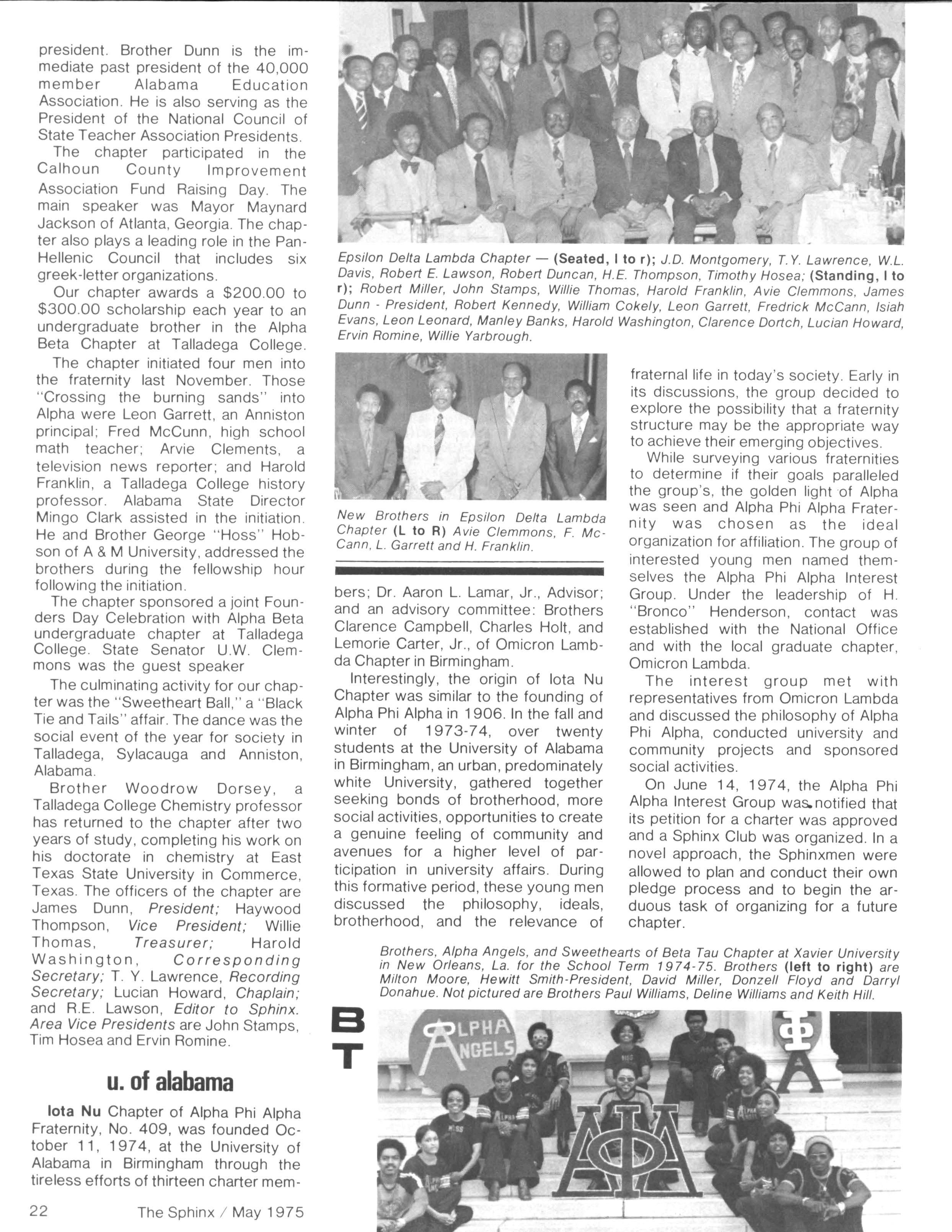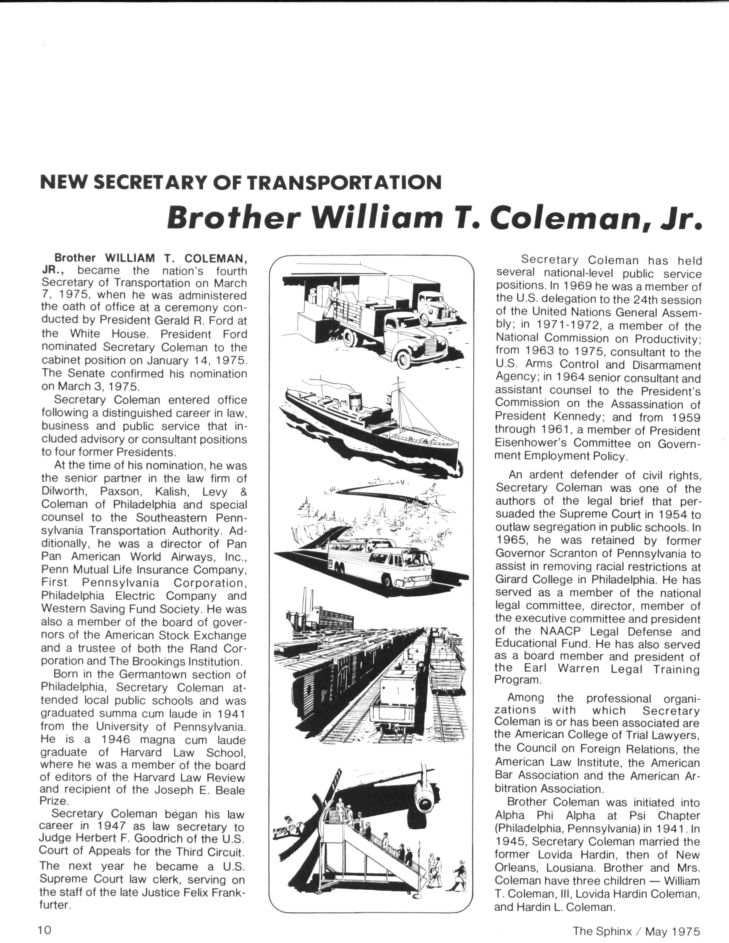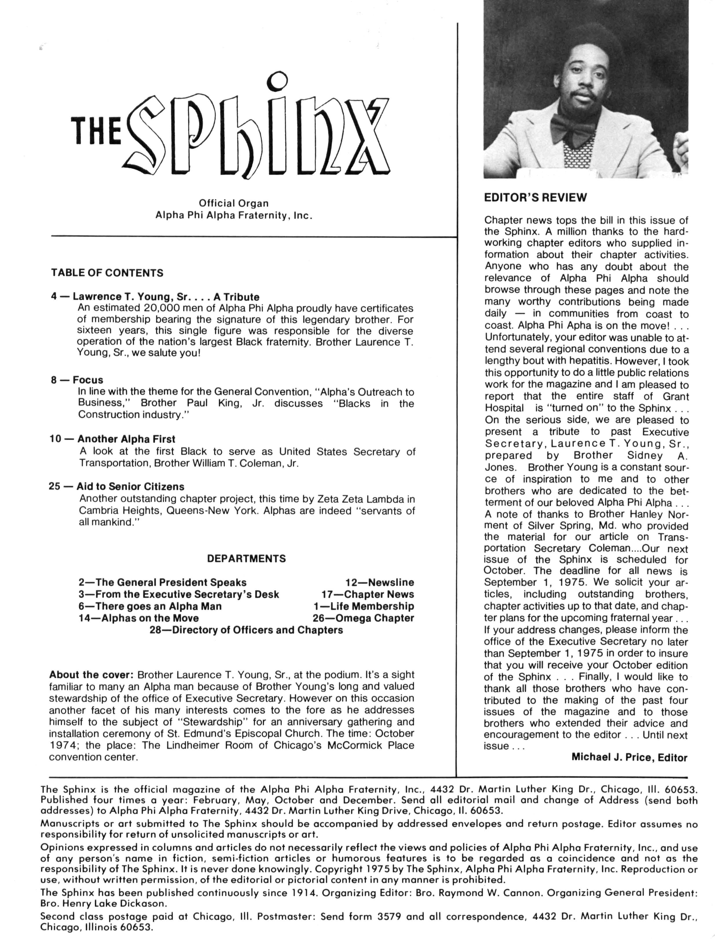 Anyone who has any doubt about the relevance of Alpha Phi Alpha should browse through these pages and note the many worthy contributions being made daily — in communities from coast to coast Alpha Phi Apha is on the move! Unfortunately, your editor was unable toattend several regional conventions due to a lengthy bout with hepatitis However, Itook this opportunity to do alittle public relations work for the magazine and Iam pleased to report that the entire staff of Grant Hospital is "turned on" to the Sphinx On the serious side, we are pleased to present a tribute to past Executive Secretary, Laurence T. Young, Sr., prepared by Brother Sidney A Jones Brother Young is a constant source of inspiration to me and to other brothers who are dedicated to the betterment of our beloved Alpha Phi Alpha A note of thanks to Brother Hanley Norment of Silver Spring, Md who provided the material for our article on Transportation Secretary Coleman....Our next issue of the Sphinx is scheduled for October The deadline for all news is September 1, 1975. We solicit your articles, including outstanding brothers, chapter activities upto that date,andchapter plans for the upcoming fraternal year... If your address changes, please inform the office of the Executive Secretary no later than September 1, 1975 in order to insure that you will receive your October edition of the Sphinx Finally, I would like to thank all those brothers who have contributed to the making of the past four issues of the magazine and to those brothers who extended their advice and encouragement to the editor. Until next issue..