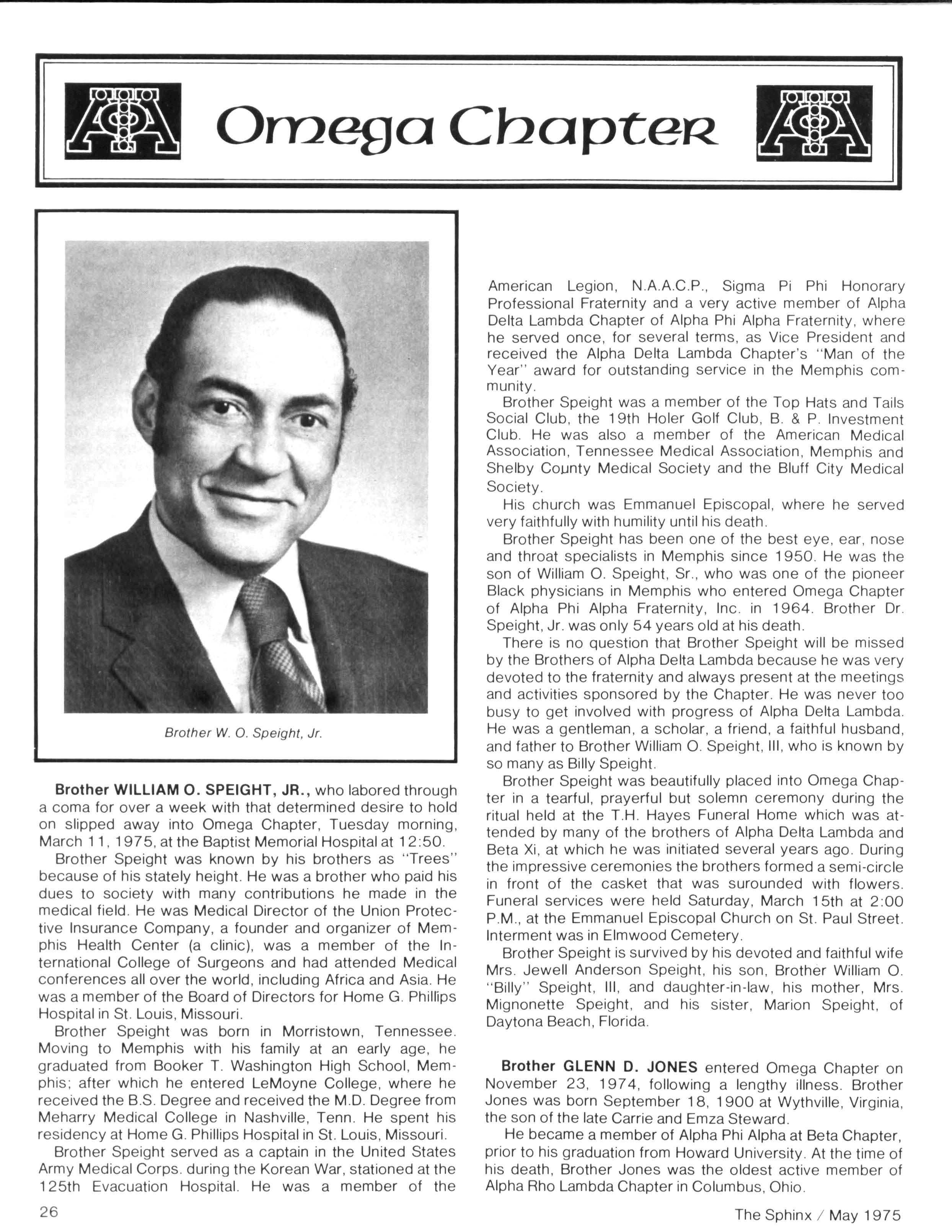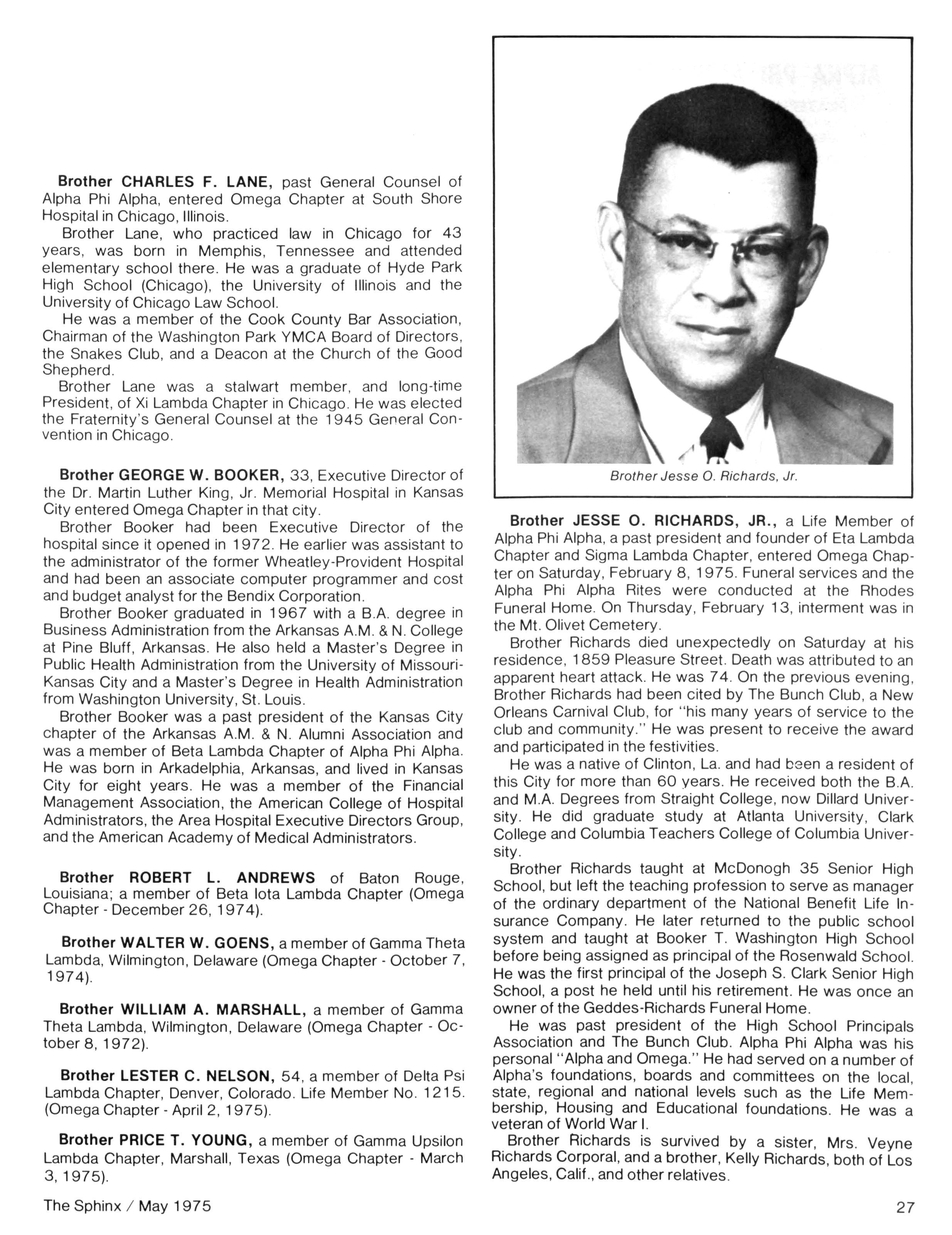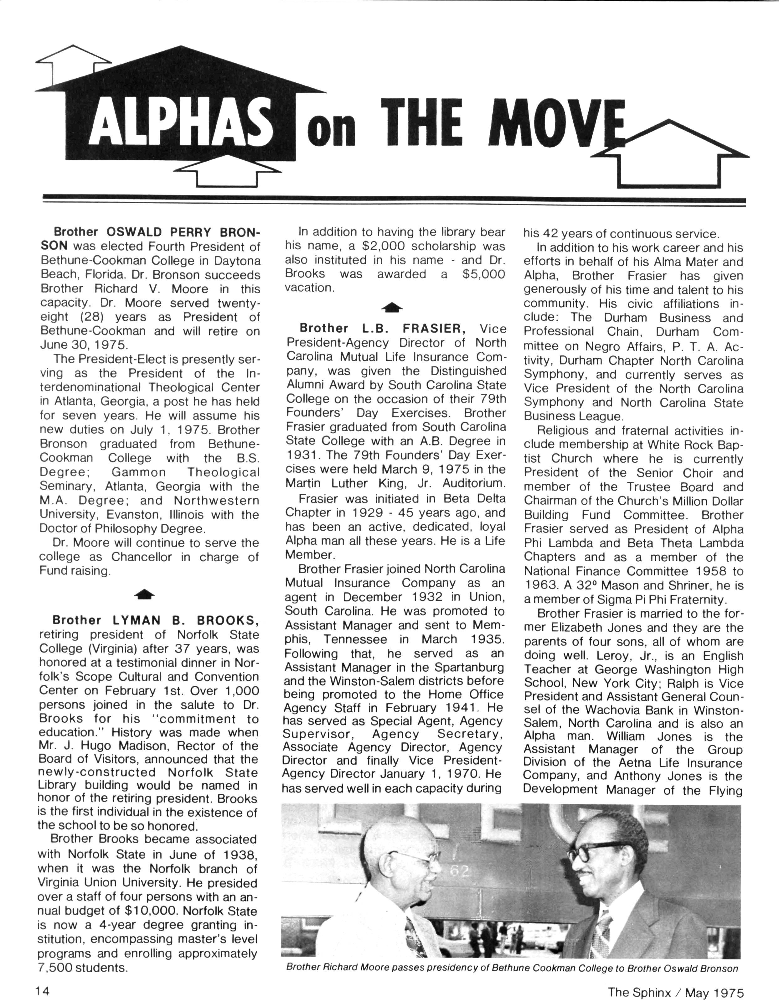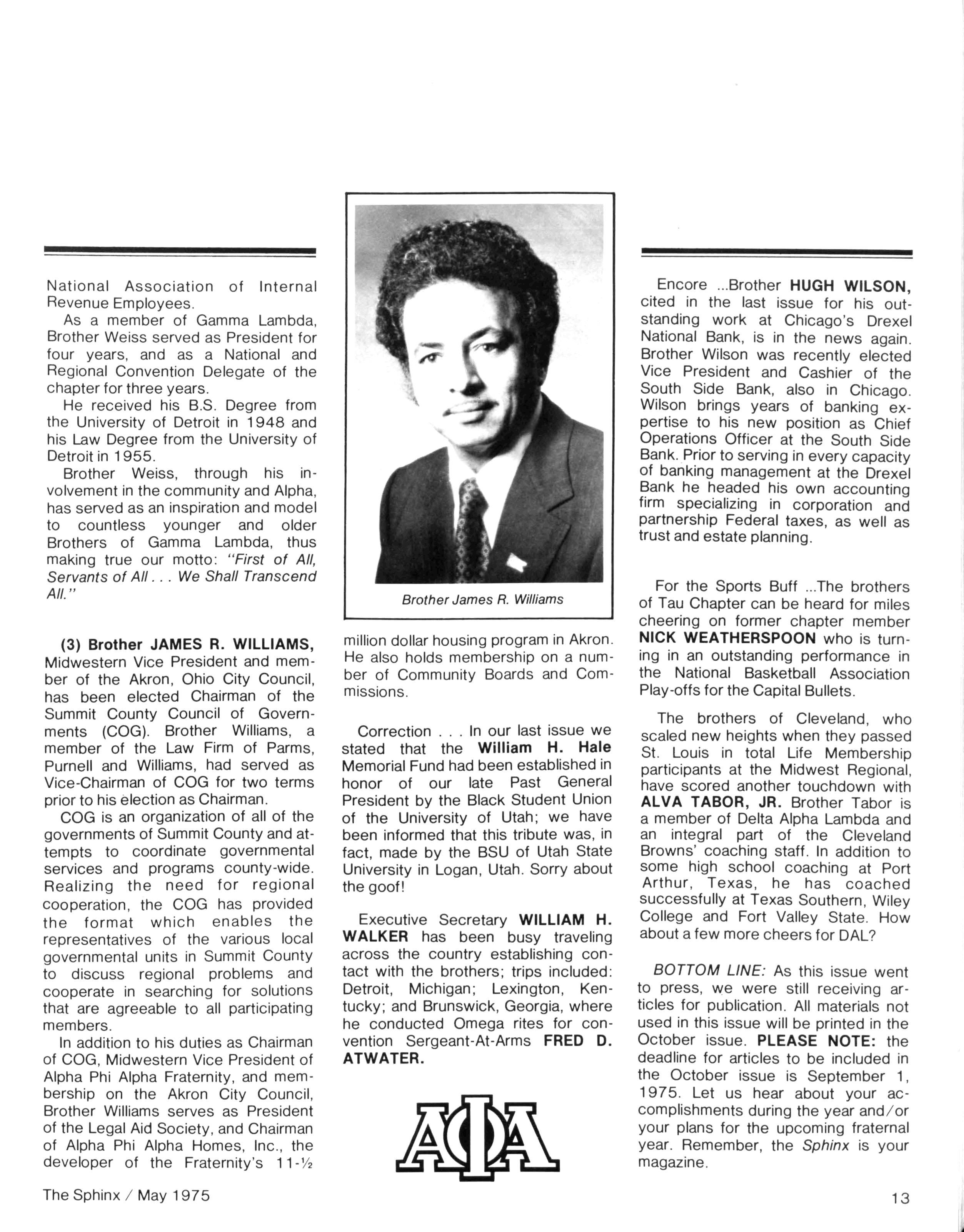 Anyone who has any doubt about the relevance of Alpha Phi Alpha should browse through these pages and note the many worthy contributions being made daily — in communities from coast to coast Alpha Phi Apha is on the move! Unfortunately, your editor was unable toattend several regional conventions due to a lengthy bout with hepatitis However, Itook this opportunity to do alittle public relations work for the magazine and Iam pleased to report that the entire staff of Grant Hospital is "turned on" to the Sphinx On the serious side, we are pleased to present a tribute to past Executive Secretary, Laurence T. Young, Sr., prepared by Brother Sidney A Jones Brother Young is a constant source of inspiration to me and to other brothers who are dedicated to the betterment of our beloved Alpha Phi Alpha A note of thanks to Brother Hanley Norment of Silver Spring, Md who provided the material for our article on Transportation Secretary Coleman....Our next issue of the Sphinx is scheduled for October The deadline for all news is September 1, 1975. We solicit your articles, including outstanding brothers, chapter activities upto that date,andchapter plans for the upcoming fraternal year... If your address changes, please inform the office of the Executive Secretary no later than September 1, 1975 in order to insure that you will receive your October edition of the Sphinx Finally, I would like to thank all those brothers who have contributed to the making of the past four issues of the magazine and to those brothers who extended their advice and encouragement to the editor. Until next issue..