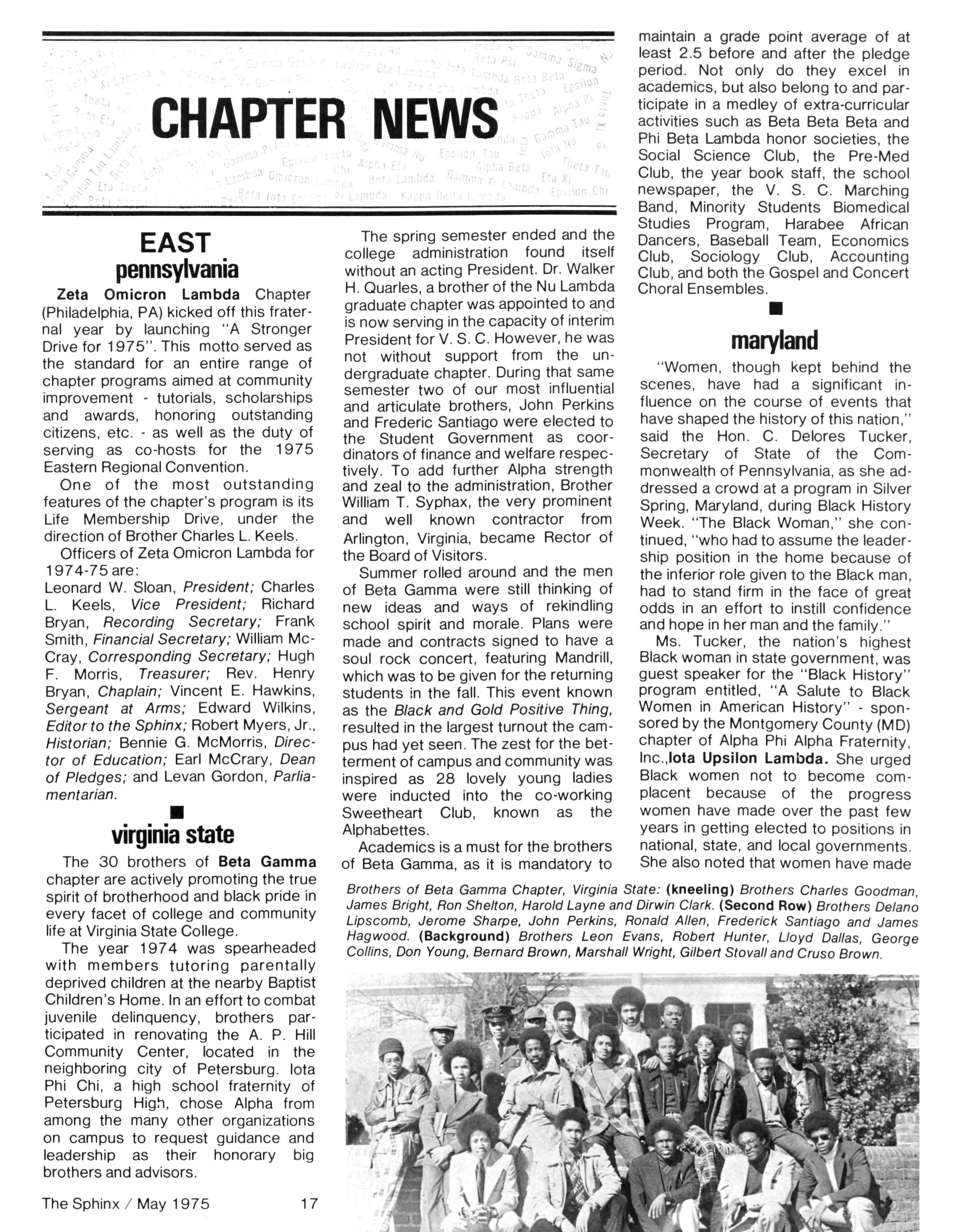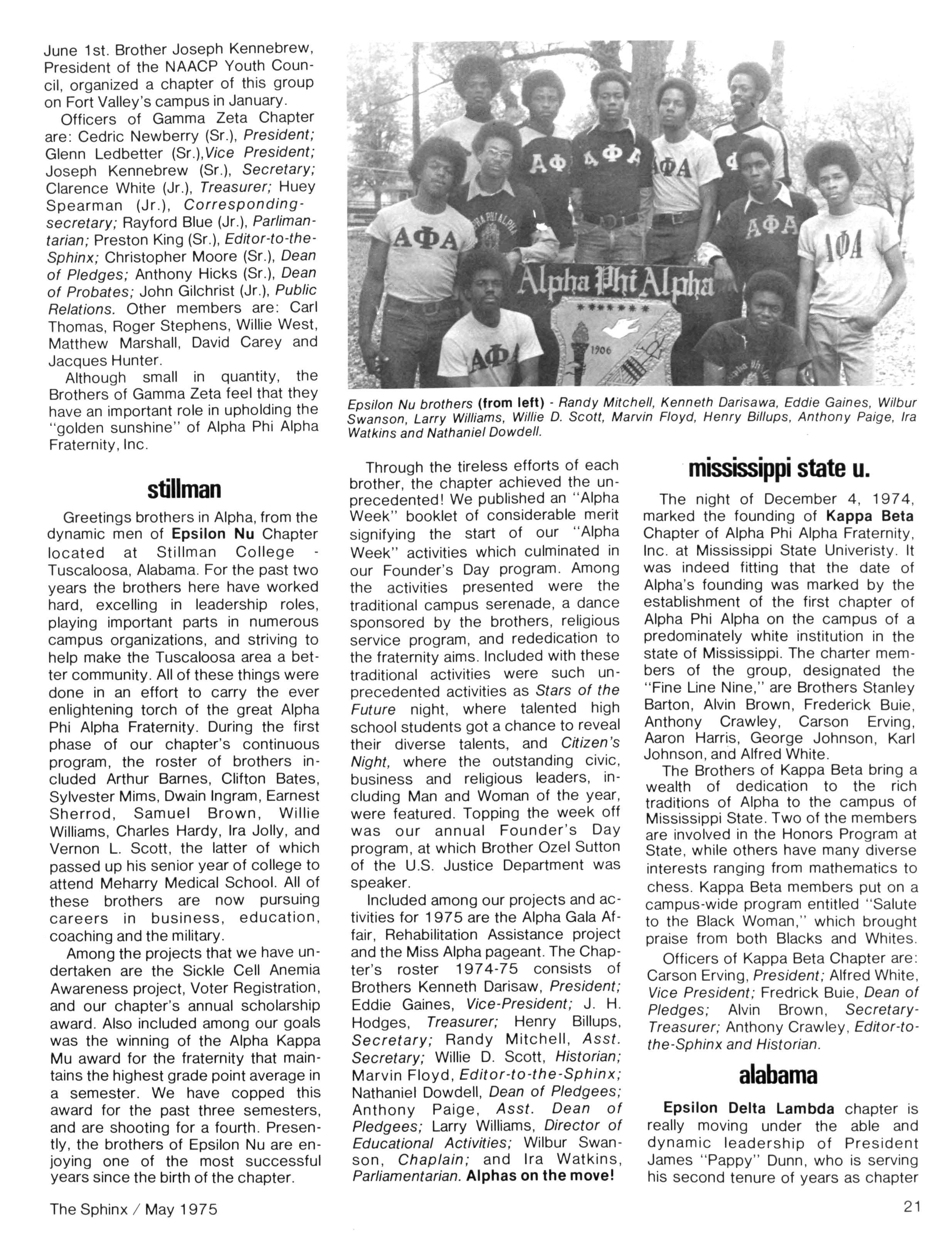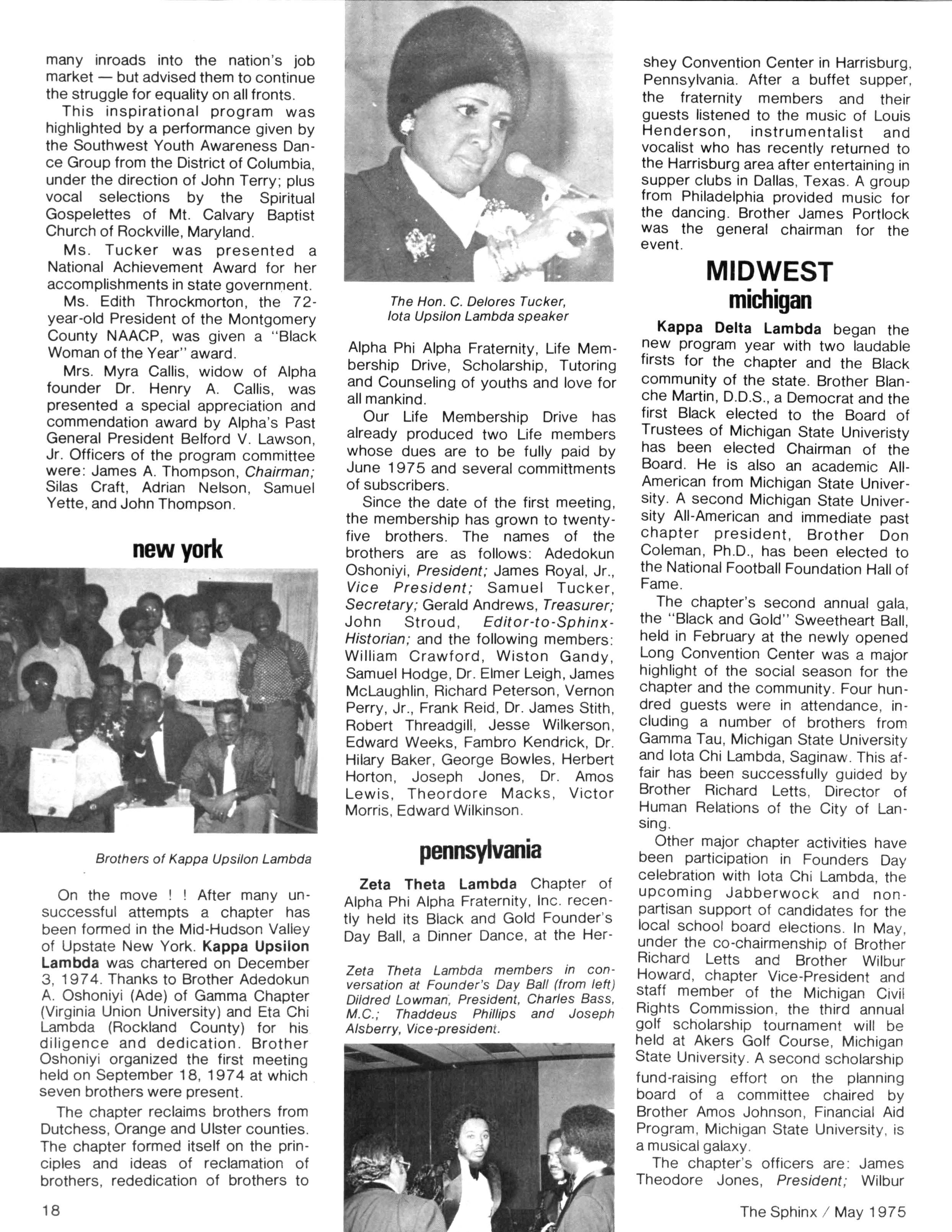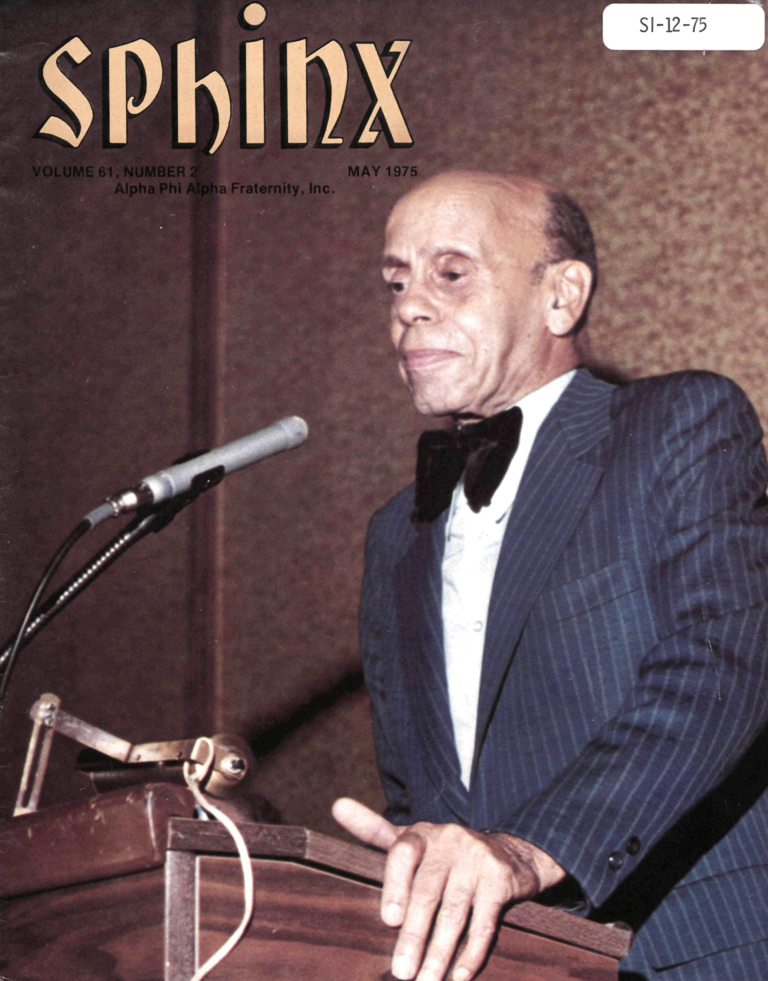 Opinions expressed in columns and articles do not necessarily reflect the views and policies of Alpha Phi Alpha Fraternity, Inc., and use of any person's name in fiction, semi-fiction articles or humorous features is to be regarded as a coincidence and not as the responsibility of The Sphinx It is never done knowingly Copyright 1975 by The Sphinx, Alpha Phi Alpha Fraternity, Inc Reproduction or use, without written permission, of the editorial or pictorial content in any manner is prohibited