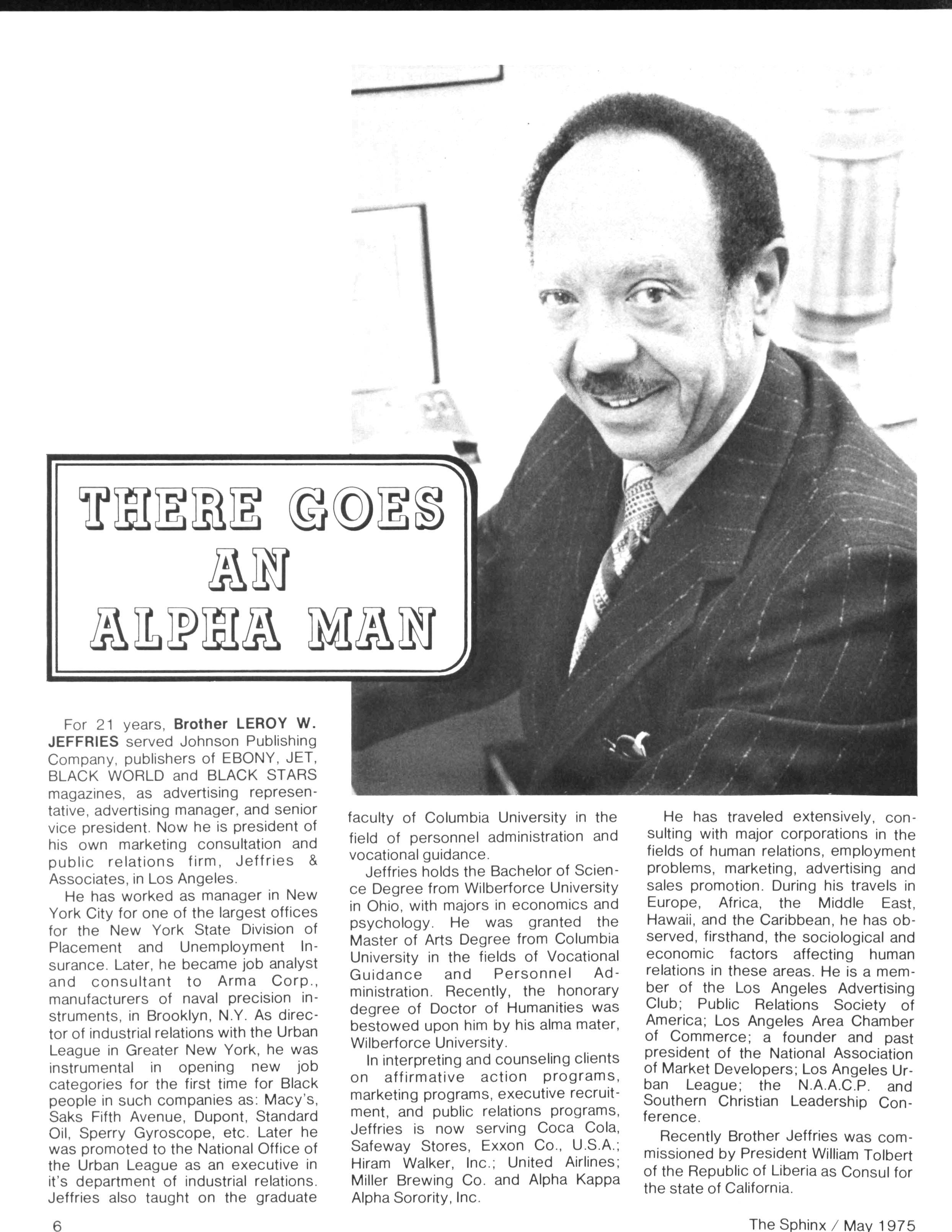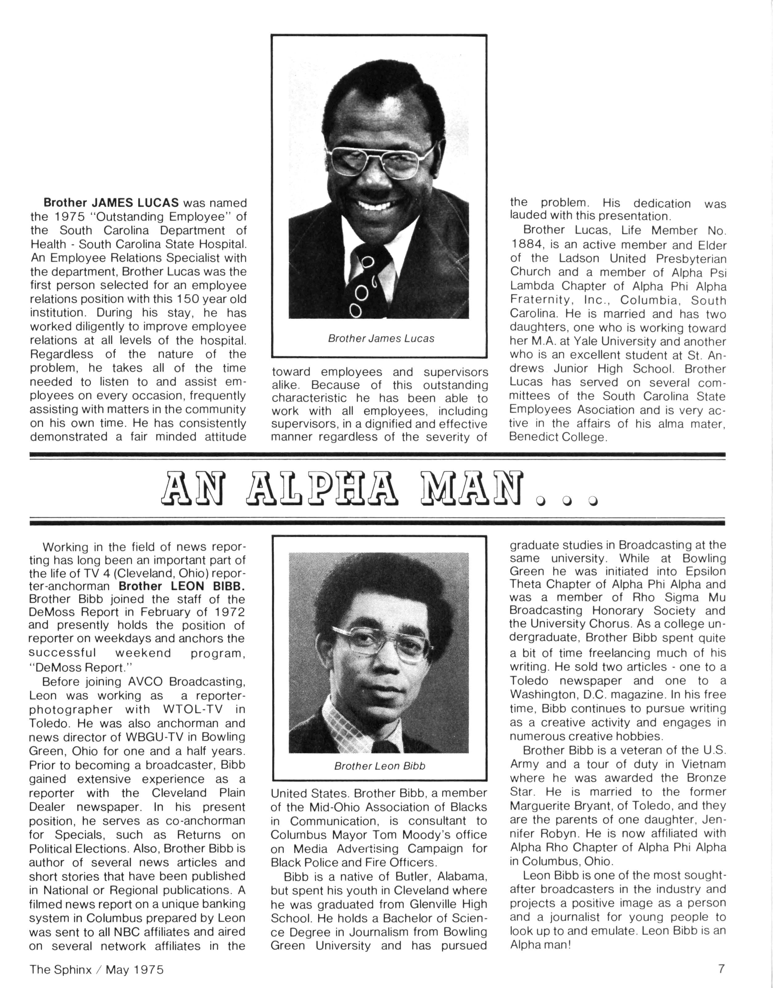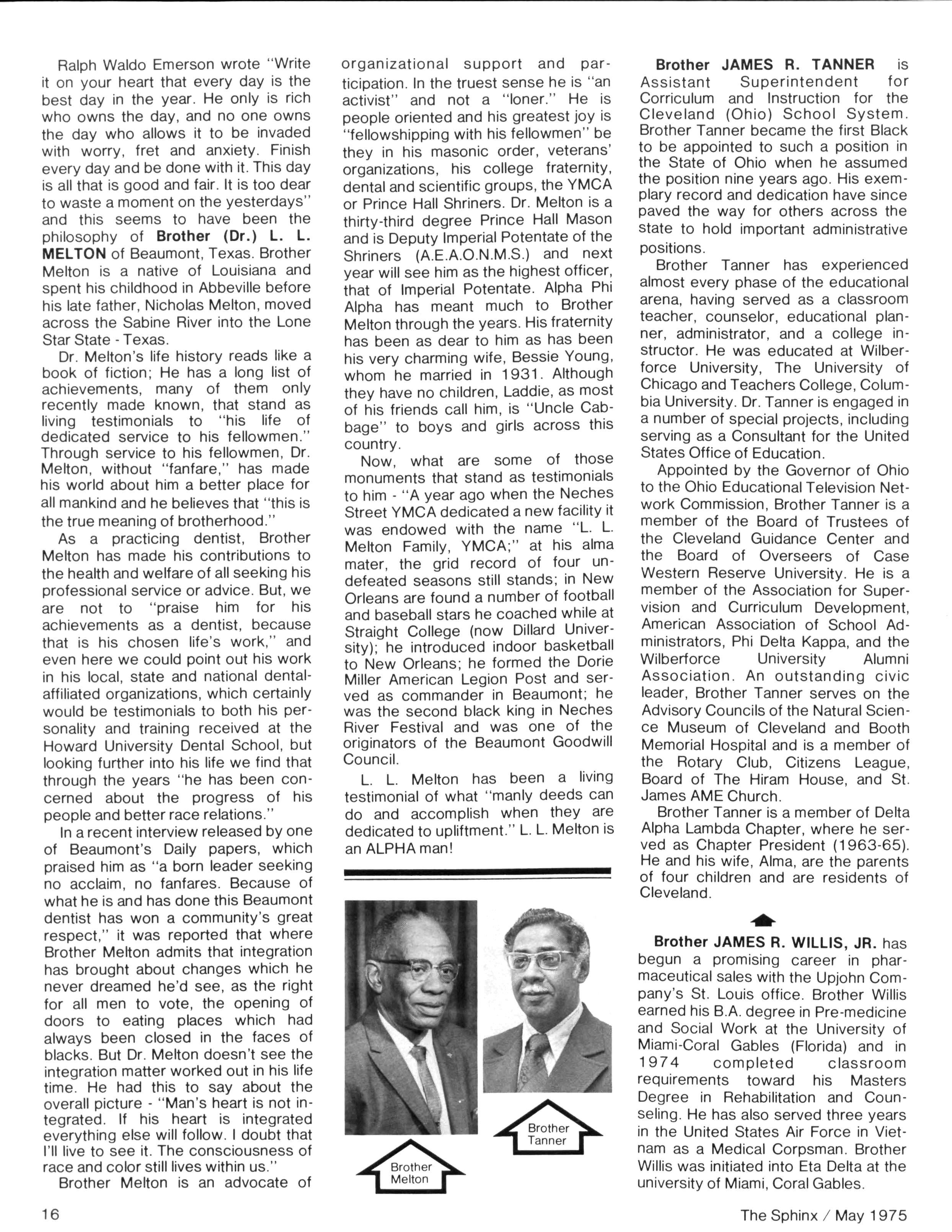 Opinions expressed in columns and articles do not necessarily reflect the views and policies of Alpha Phi Alpha Fraternity, Inc., and use of any person's name in fiction, semi-fiction articles or humorous features is to be regarded as a coincidence and not as the responsibility of The Sphinx It is never done knowingly Copyright 1975 by The Sphinx, Alpha Phi Alpha Fraternity, Inc Reproduction or use, without written permission, of the editorial or pictorial content in any manner is prohibited