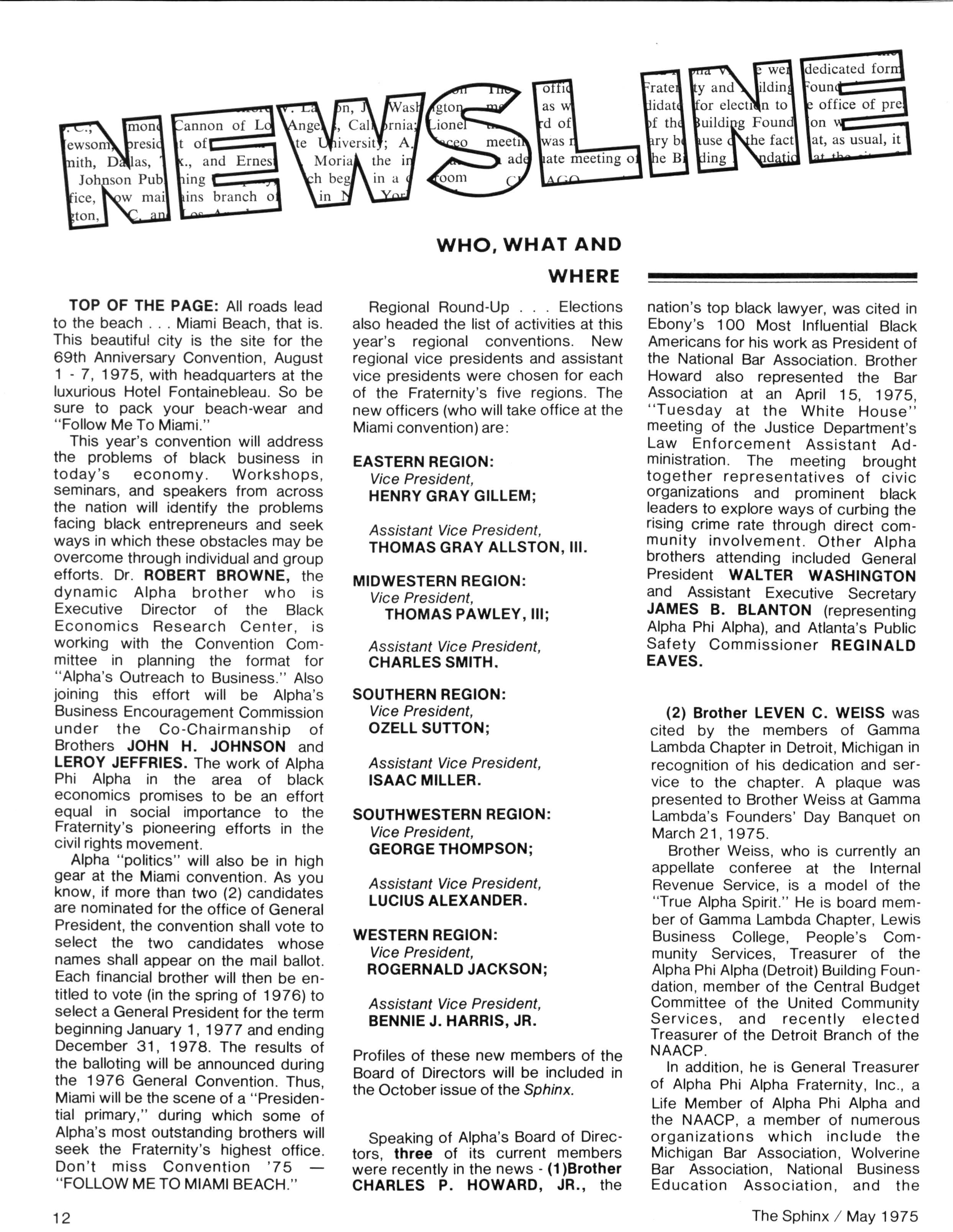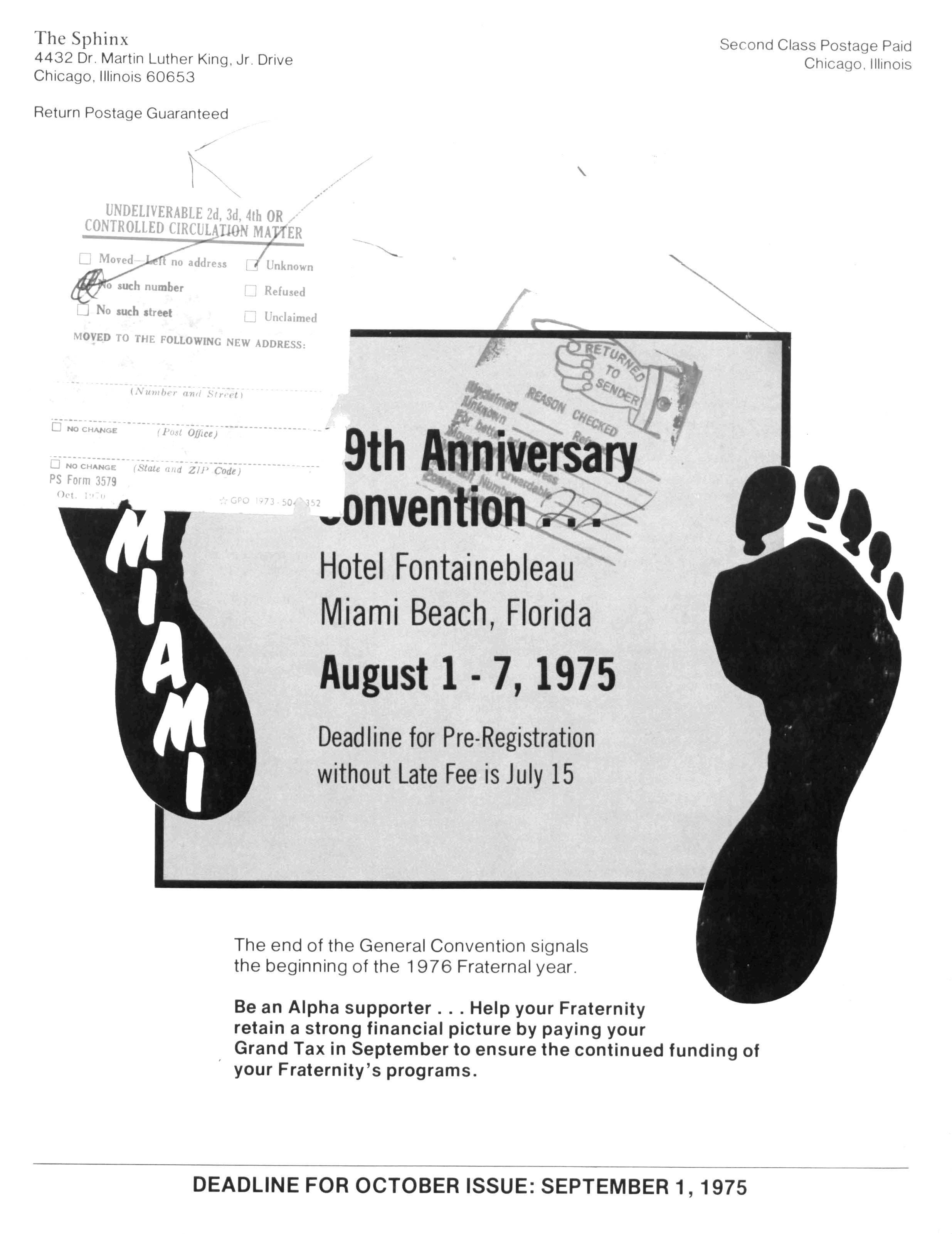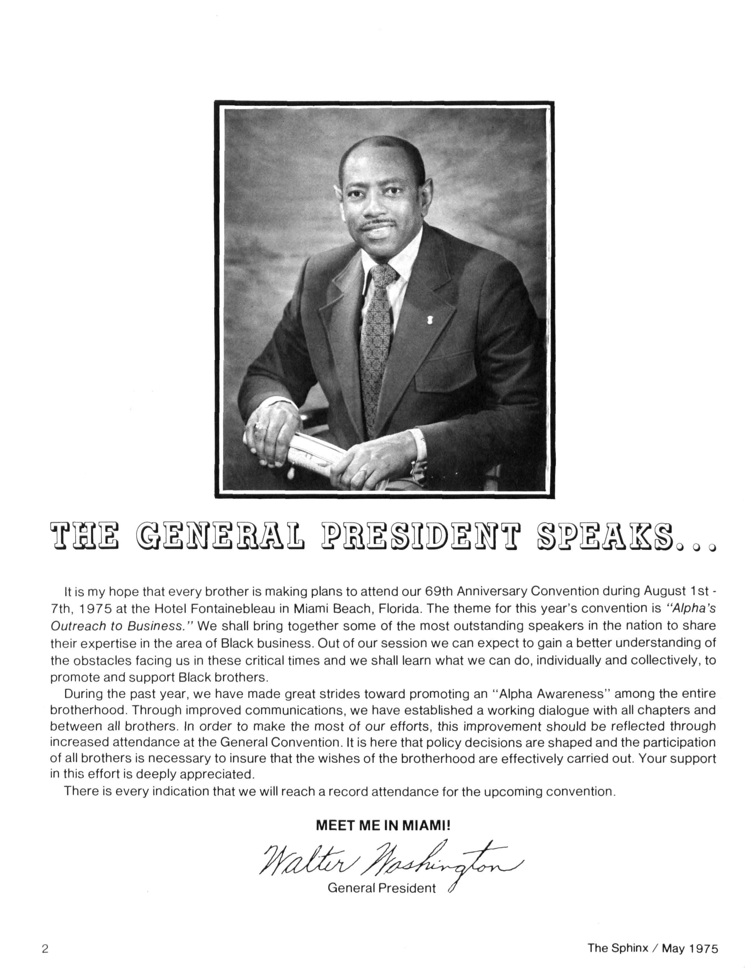 It is my hope that every brother is making plans to attend our 69th Anniversary Convention during August 1 st7th, 1975 at the Hotel Fontainebleau in Miami Beach, Florida The theme for this year's convention is "Alpha's Outreach to Business." We shall bring together some of the most outstanding speakers in the nation to share their expertise in the area of Black business. Out of our session we can expect to gain a better understanding of the obstacles facing us in these critical times and we shall learn what we can do, individually and collectively, to promote and support Black brothers