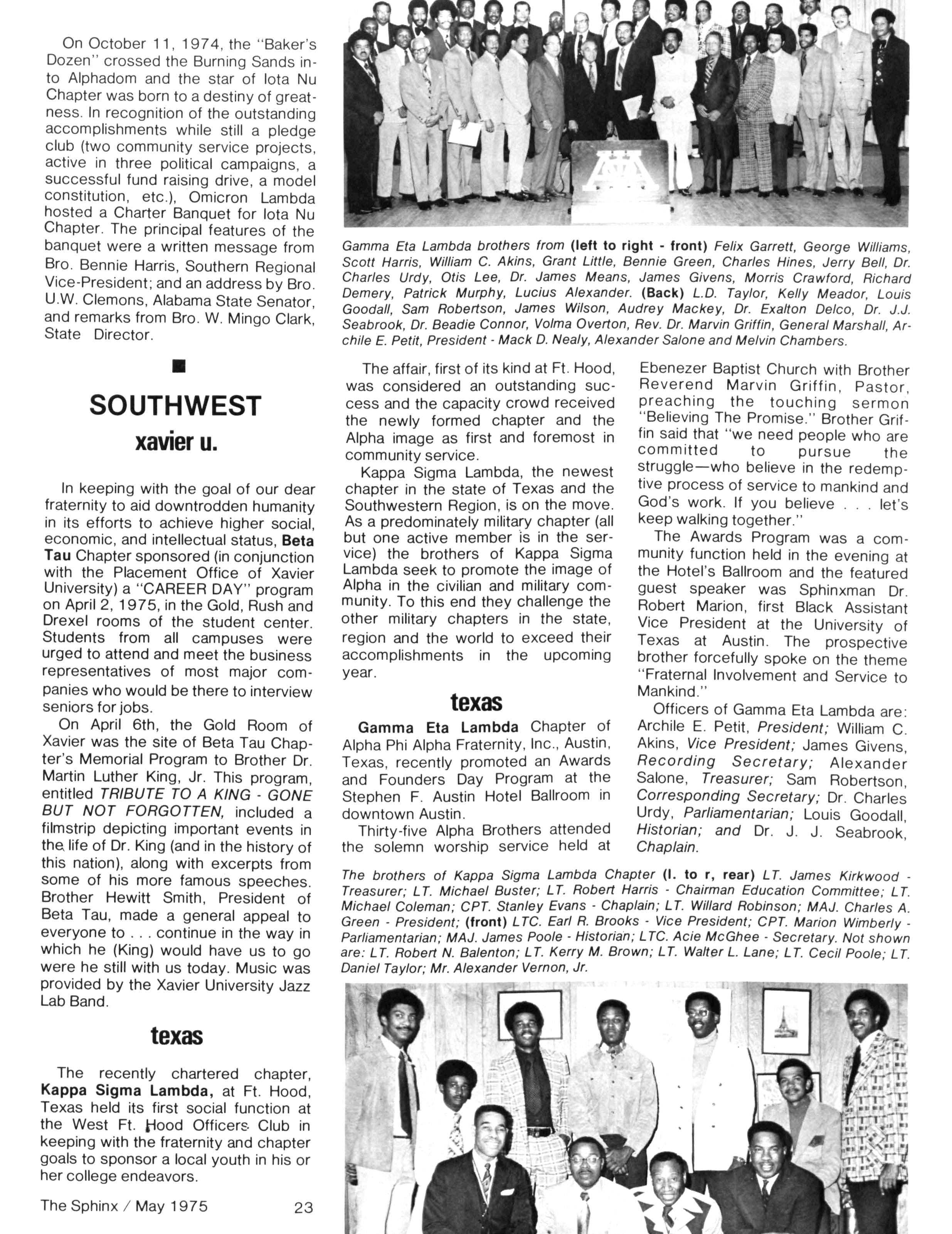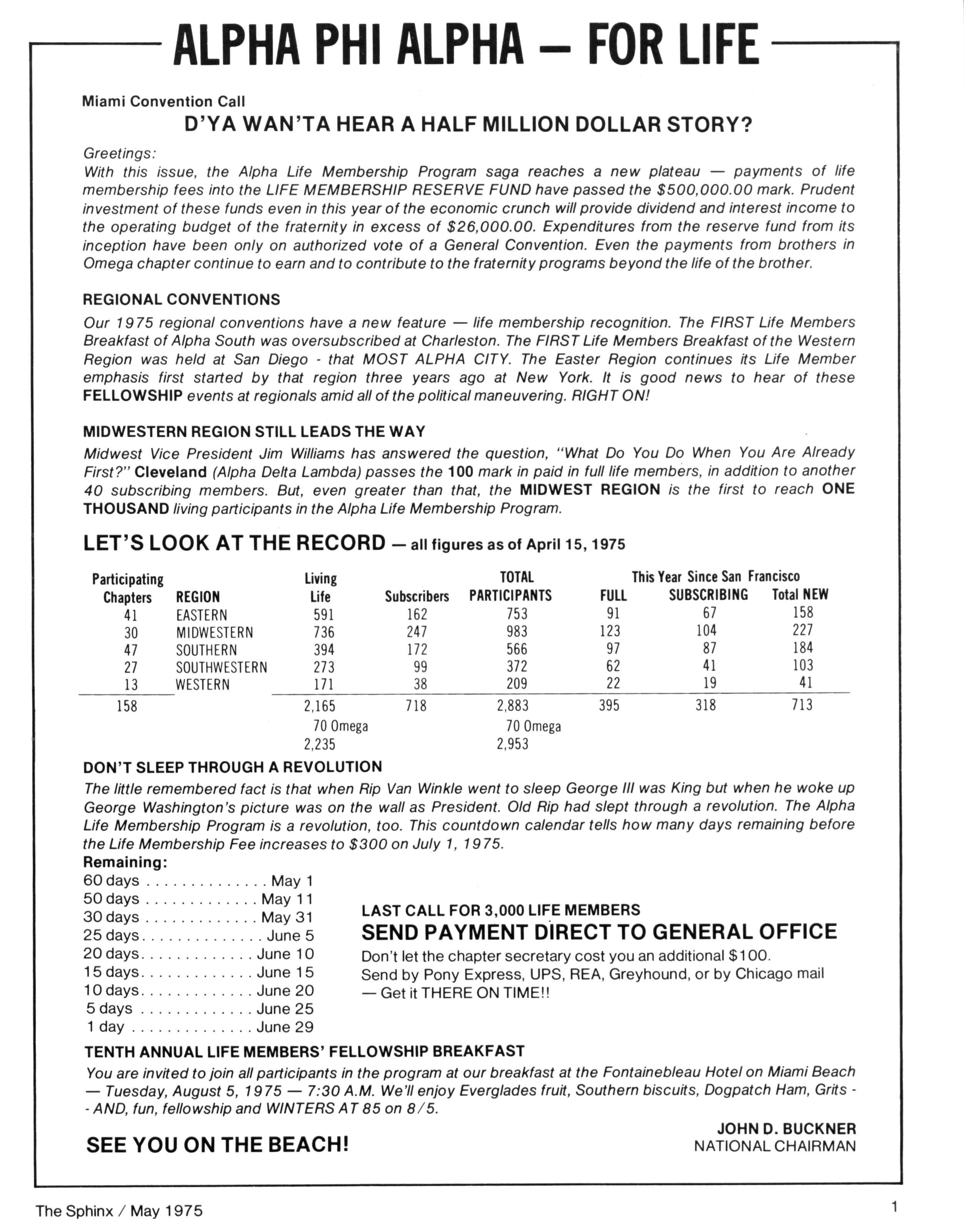 Our 1975 regional conventions have anew feature — life membership recognition. The FIRST Life Members Breakfast ofAlpha South was oversubscribed atCharleston. TheFIRSTLife Members Breakfast ofthe Western Region was held at San Diego - that MOST ALPHA CITY. The Easter Region continues its Life Member emphasis first started by that region three years ago at New York. It is good news to hear of these FELLOWSHIP events atregionals amidallofthepolitical maneuvering. RIGHT ON!