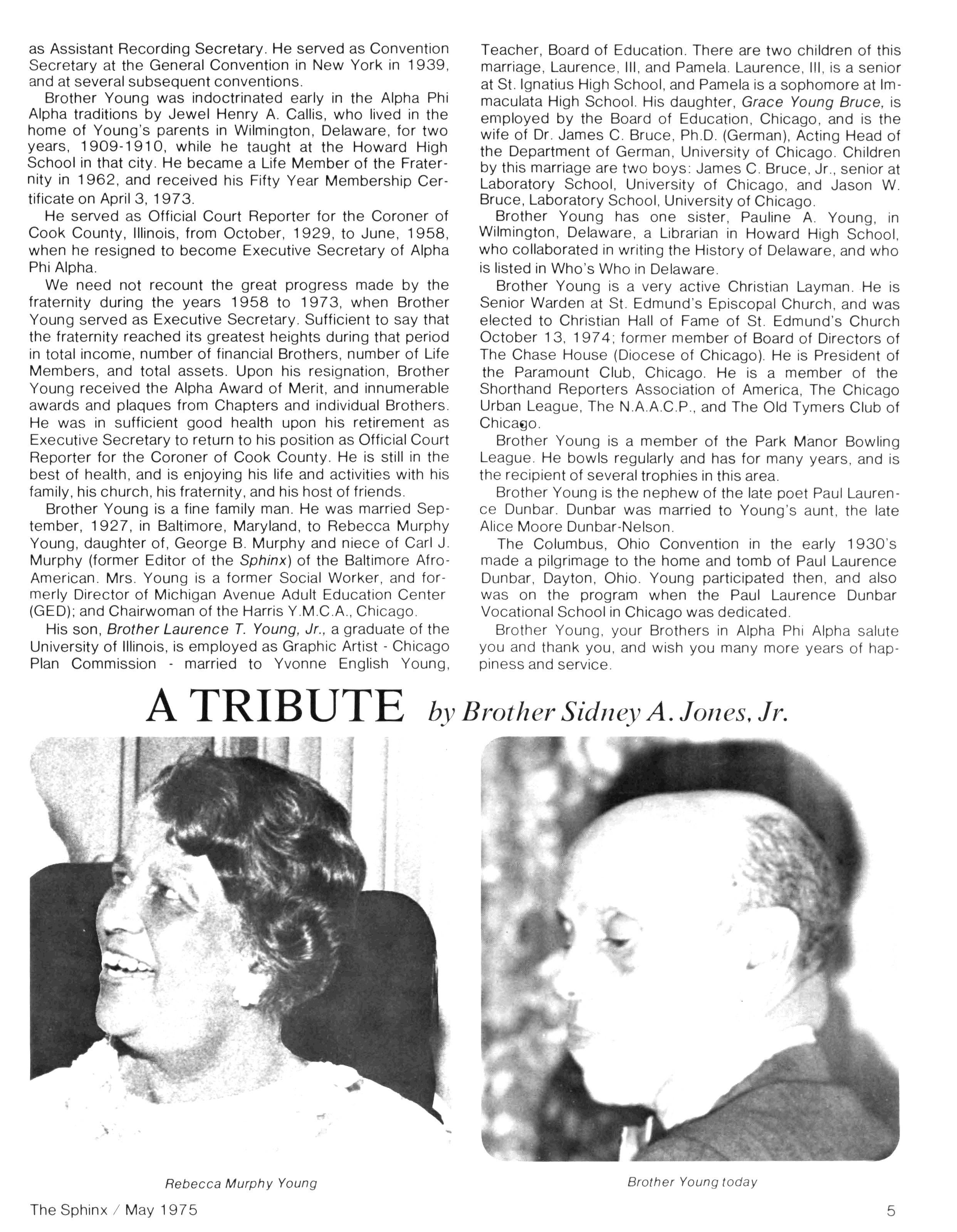 Brother Young is a fine family man He was married September, 1927, in Baltimore, Maryland, to Rebecca Murphy Young, daughter of, George B Murphy and niece of Carl J Murphy (former Editor of the Sphinx) of the Baltimore AfroAmerican Mrs Young is a former Social Worker, and formerly Director of Michigan Avenue Adult Education Center (GED); and Chairwoman of the Harris Y.M.C.A., Chicago. His son, Brother Laurence T. Young, Jr., a graduate of the University of Illinois, is employed as Graphic Artist - Chicago Plan Commission - married to Yvonne English Young,
