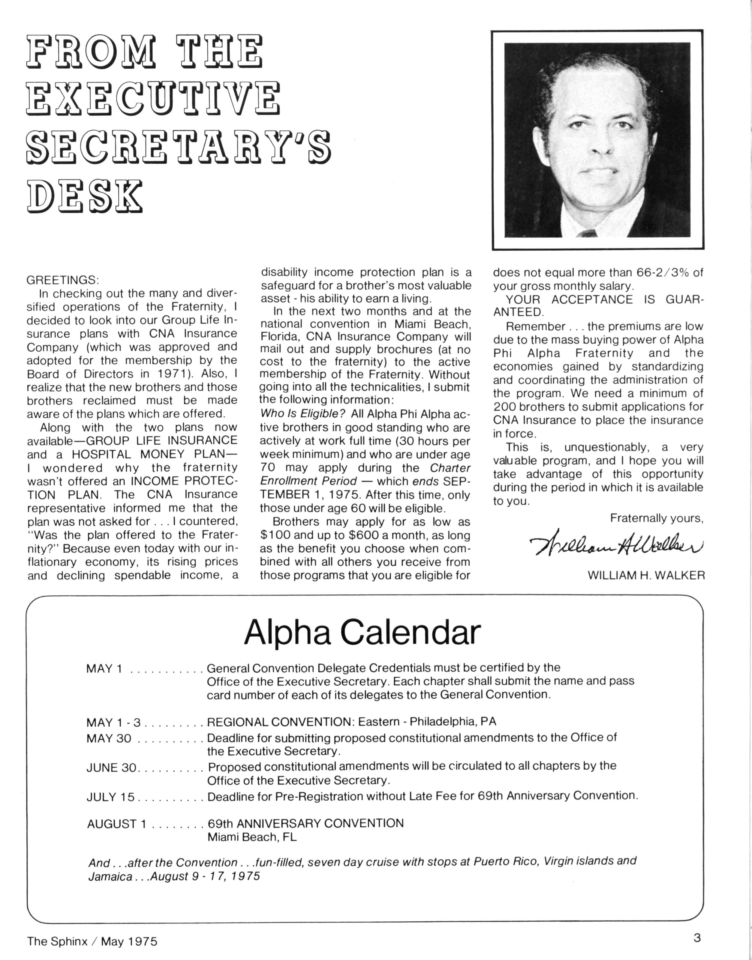 In checking out the many and diversified operations of the Fraternity, I decided to look into our Group Life Insurance plans with CNA Insurance Company (which was approved and adopted for the membership by the Board of Directors in 1971) Also, I realize that the new brothers and those brothers reclaimed must be made aware of the plans which are offered