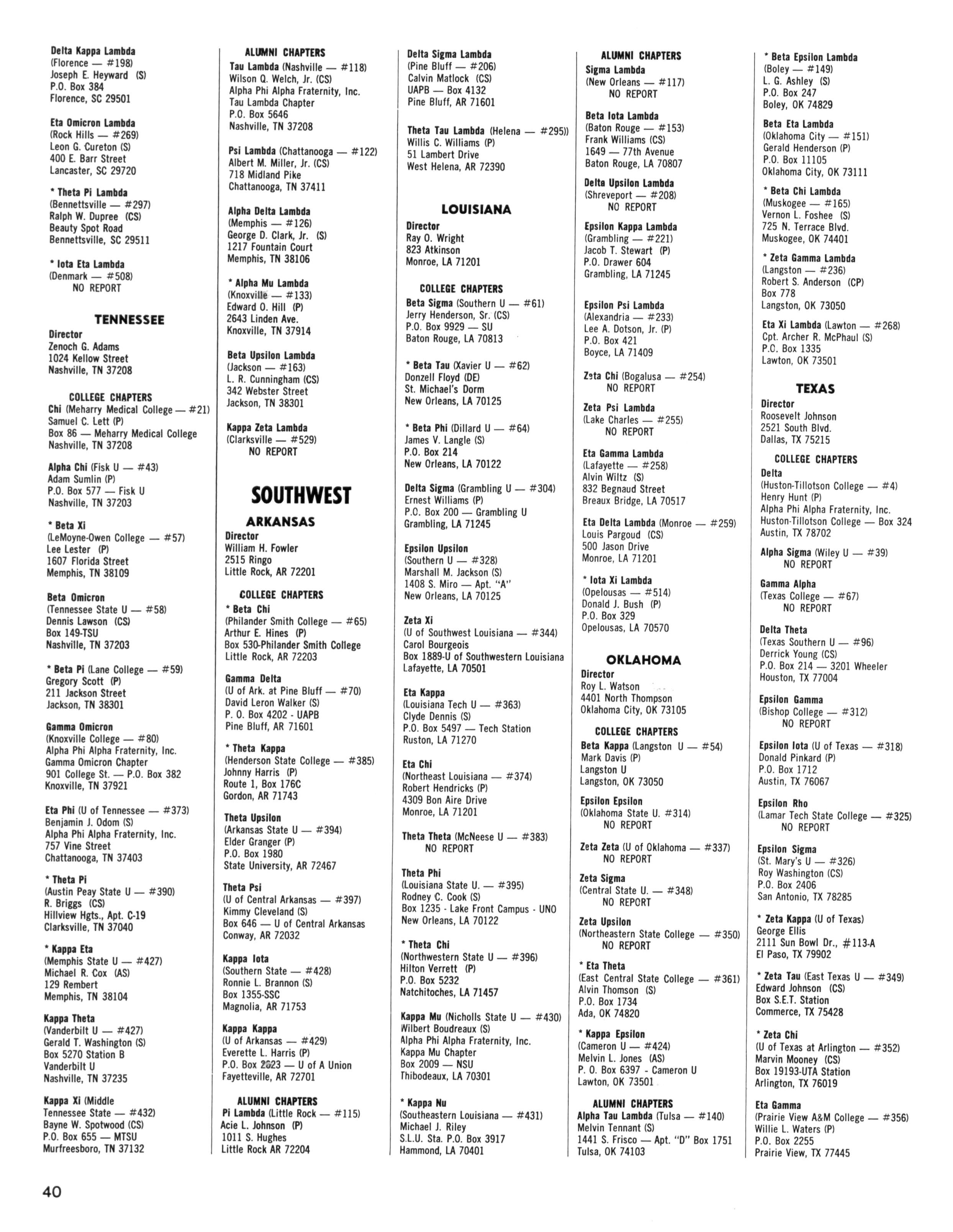 Brother CHARLES C. TEAMER was initiated in 1951 at Alpha Phi Chapter (Clark College in Atlanta, Georgia) and since that time has served the fraternity diligently as a member of TauLambda (Nashville); Delta Zeta Lambda (Orangeburg, South Carolina); Gamma Upsilon Lambda (Marshall, Texas); and, his present chapter, Sigma Lambda in New Orleans He has been very active on the national scene, having served on a number of committees, and he presently serves the fraternity as Comptroller (the fiscal officer responsible for monitoring expenditures) and as Chairman of the Committee on Budget and Finance