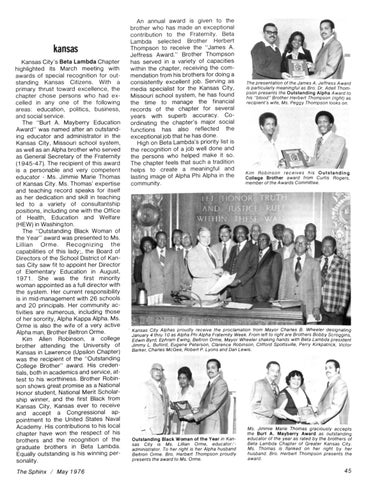 kansas Kansas City's Beta Lambda Chapter highlighted its March meeting with awards of special recognition for outstanding Kansas Citizens. With a primary thrust toward excellence, the chapter chose persons who had excelled in any one of the following areas: education, politics, business, and social service. The "Burt A. Mayberry Education Award" was named after an outstanding educator and administrator in the Kansas City, Missouri school system, as well as an Alpha brother who served as General Secretary of the Fraternity (1945-47). The recipient of this award is a personable and very competent educator - Ms. Jimmie Marie Thomas of Kansas City. Ms. Thomas' expertise and teaching record speaks for itself as her dedication and skill in teaching led to a variety of consultantship positions, including one with the Office of Health, Education and Welfare (HEW) in Washington. The "Outstanding Black Woman of the Year" award was presented to Ms. Lillian Orme. Recognizing the capabilities of this lady;, the Board of Directors of the School District of Kansas City saw fit to appoint her Director of Elementary Education in August, 1 9 7 1 . She was the first minority woman appointed as a full director with the system. Her current responsibility is in mid-management with 26 schools and 20 principals. Her community activities are numerous, including those of her sorority, Alpha Kappa Alpha. Ms. Orme is also the wife of a very active Alpha man, Brother Beltron Orme. Kim Allen Robinson, a college brother attending the University of Kansas in Lawrence (Upsilon Chapter) was the recipient of the "Outstanding College Brother" award. His credentials, both in academics and service, attest to his worthiness. Brother Robinson shows great promise as a National Honor student, National Merit Scholarship winner, and the first Black from Kansas City, Kansas ever to receive and accept a Congressional appointment to the United States Naval Academy. His contributions to his local chapter have won the respect of his brothers and the recognition of the graduate brothers in Beta Lambda. Equally outstanding is his winning personality. The Sphinx / May 1976